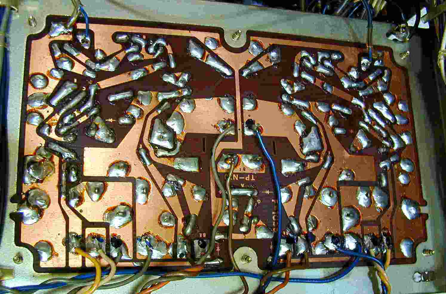 | 4. 基板下から見たドライバーAMP基板、ハンダは十分盛る | ||||||||||||||||||||||||||||||||||||||||||||||||||||||||||||||||||||||
