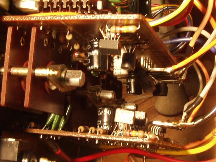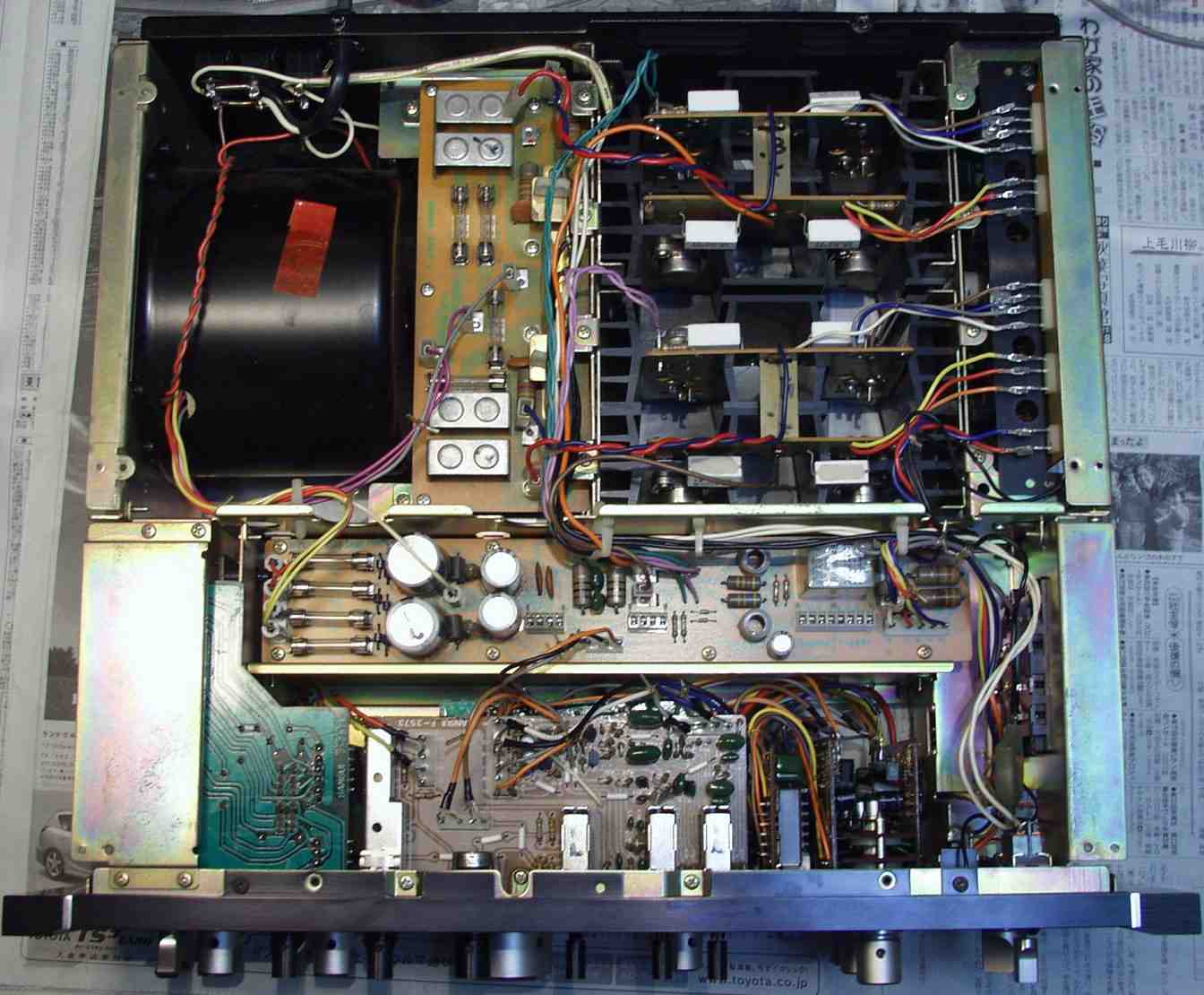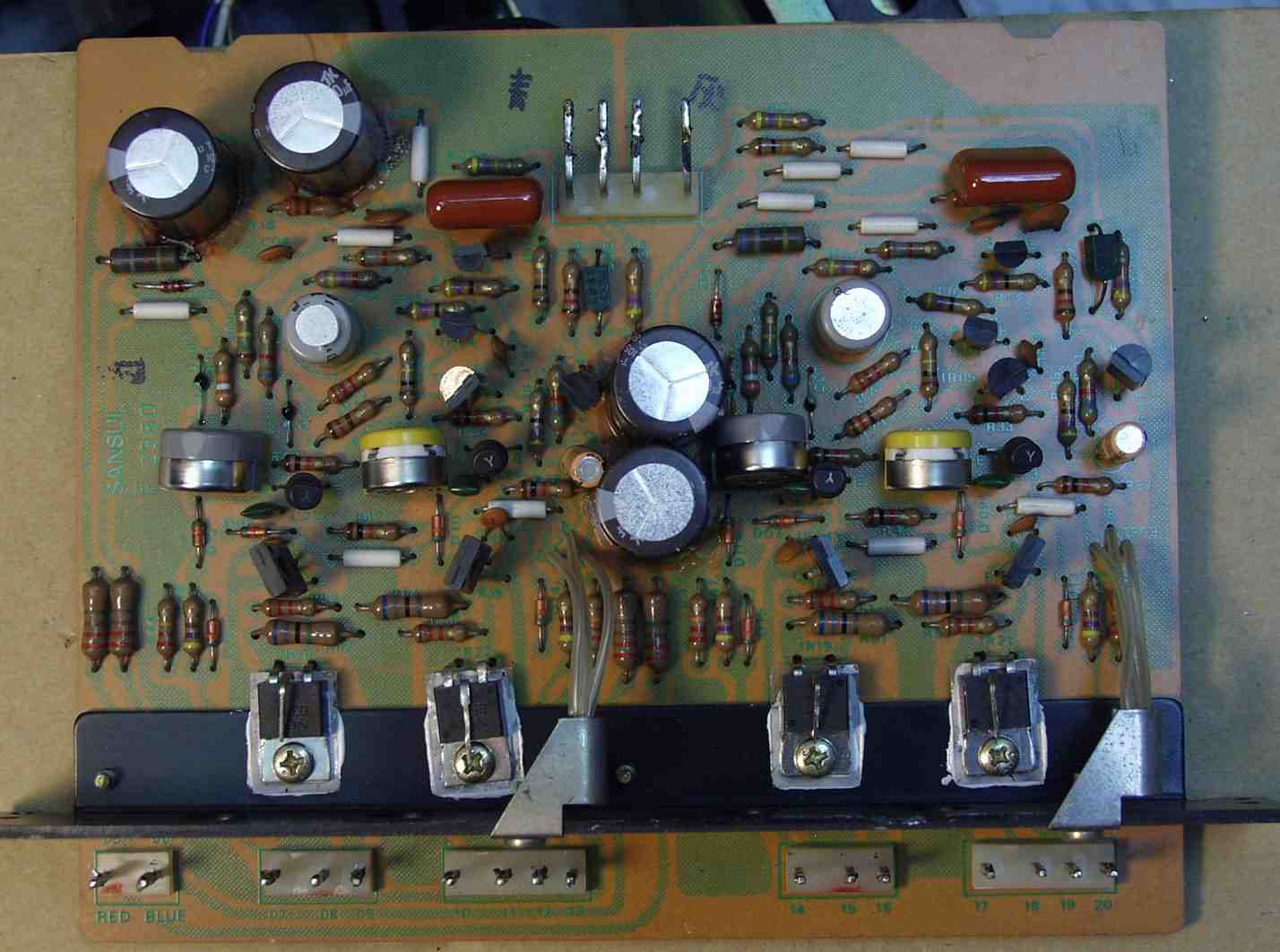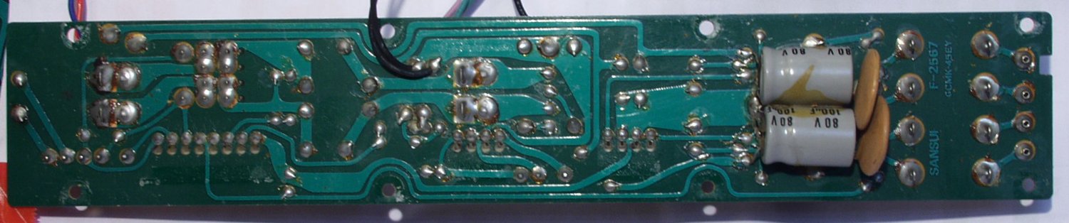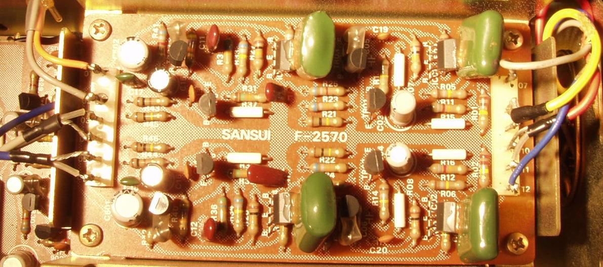 | C2B. 修理後 ドライバー基盤 初段TR(トランジスター)4個 半固定VR4個 電解コンデンサー4個交換 結合コンデンサーをメタライズドフイルムコンデンサーに交換 |