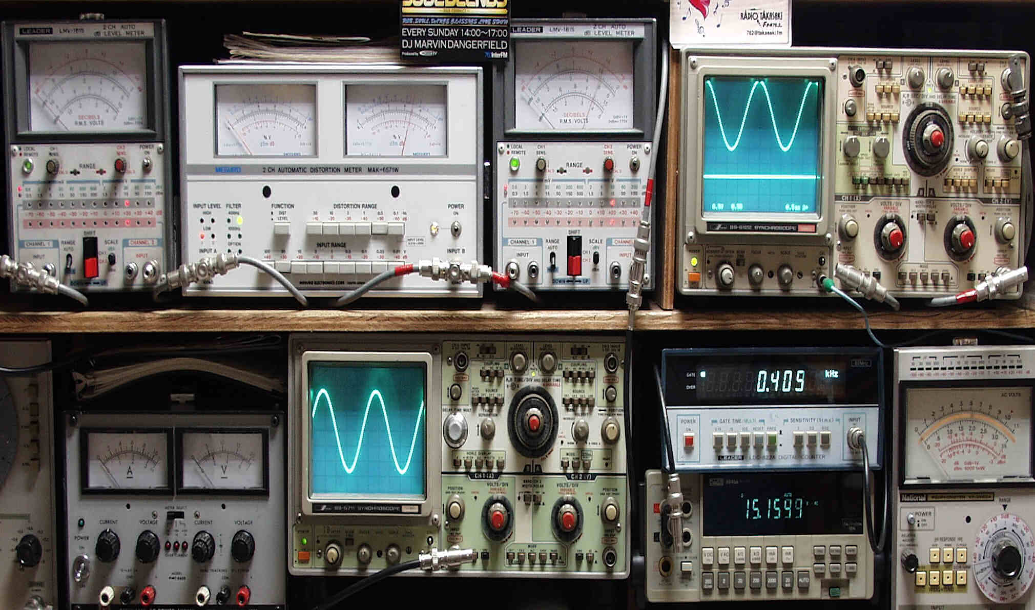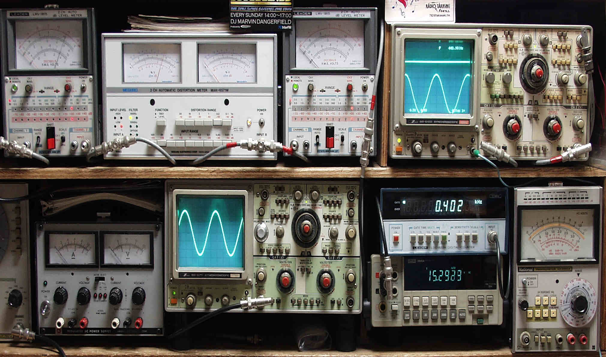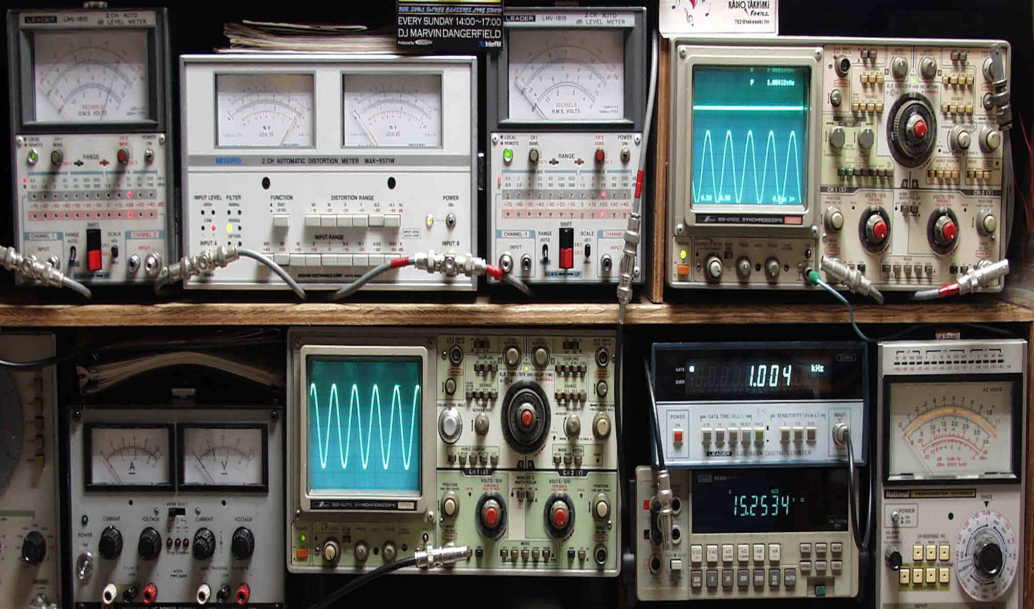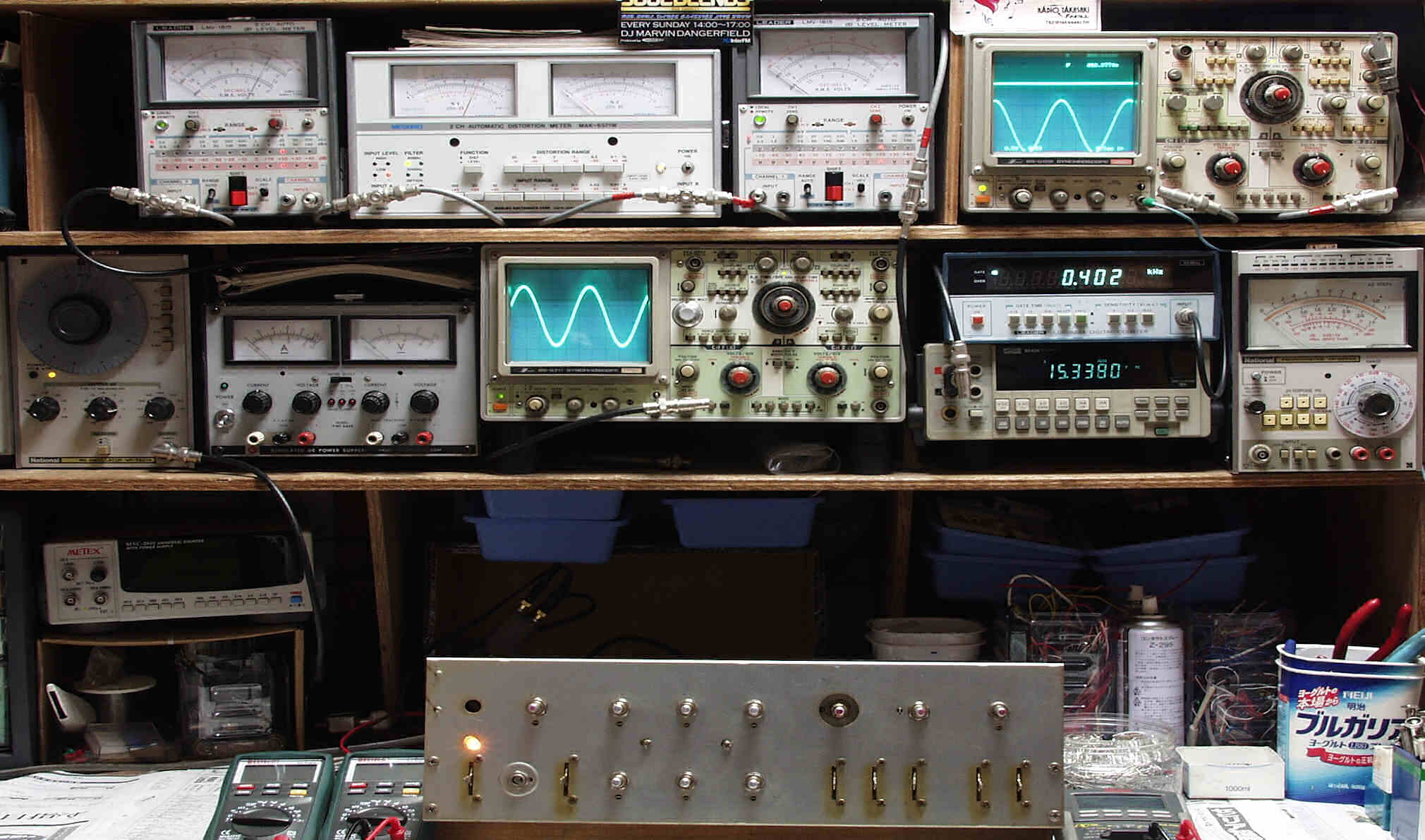 | E. 測定・調整 E−1. 出力・歪み率測定・調整 <見方> 下段左端 オーディオ発振器より400HZ・1KHZの信号を出し(歪み率=約0.003%)これをAMPに入力し、SP出力を測定 下段中左 オシロ=入力波形(オーディオ発振器のTTLレベル) 下段中右上=周波数計 上段左端 電圧計=L側SP出力電圧測定、黒針のみ使用 上段中左 歪み率計=SP出力の歪み率測定 左メータ=L出力、右メータ=R出力 上段中右 電圧計=R側SP出力電圧測定、赤針のみ使用 上段右端 オシロ=SP出力波形 上=R出力、下=L出力(実際にはRL電圧計の出力「Max1V」を観測) 下段中右上 デジタル電圧計=SP出力電圧測定RLは切り替えて測定 |