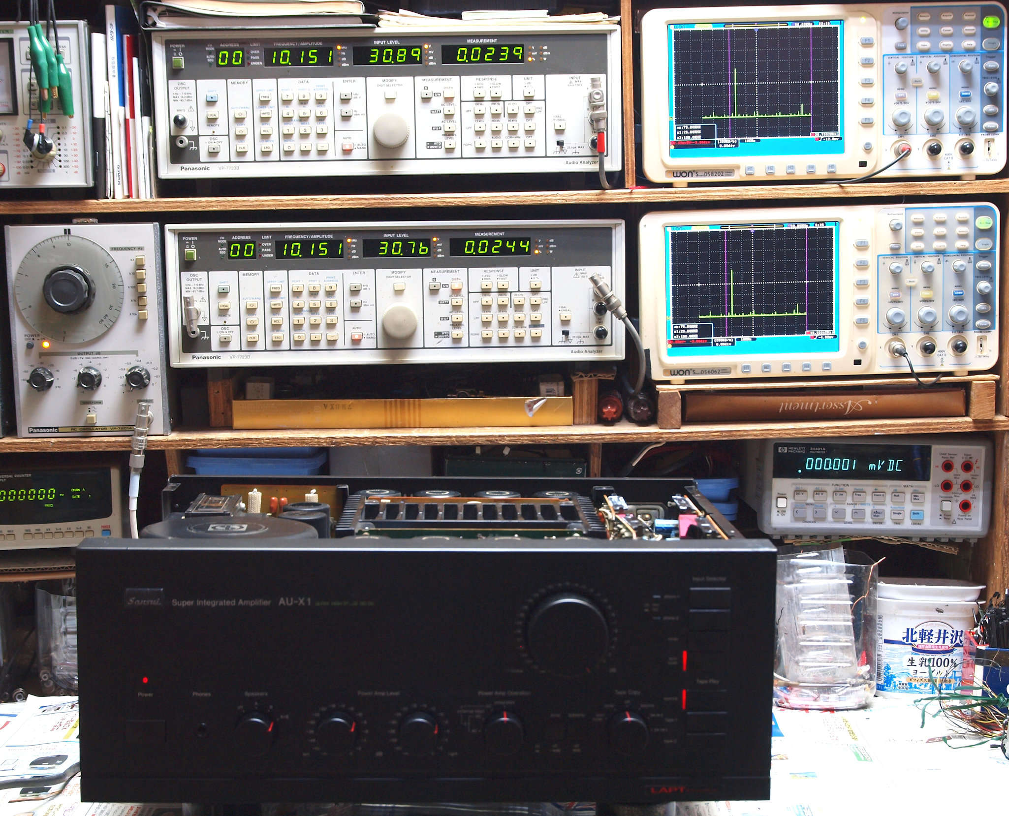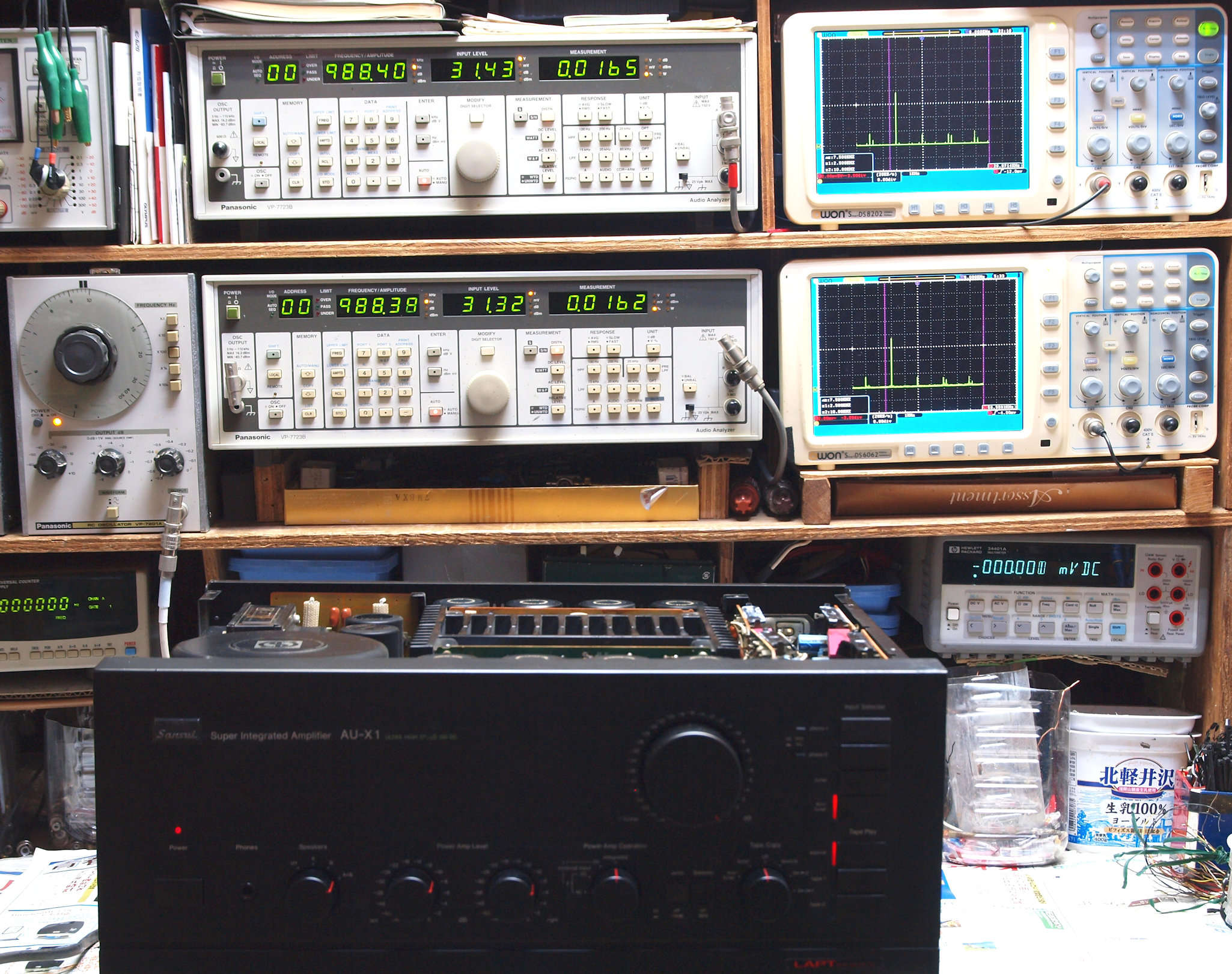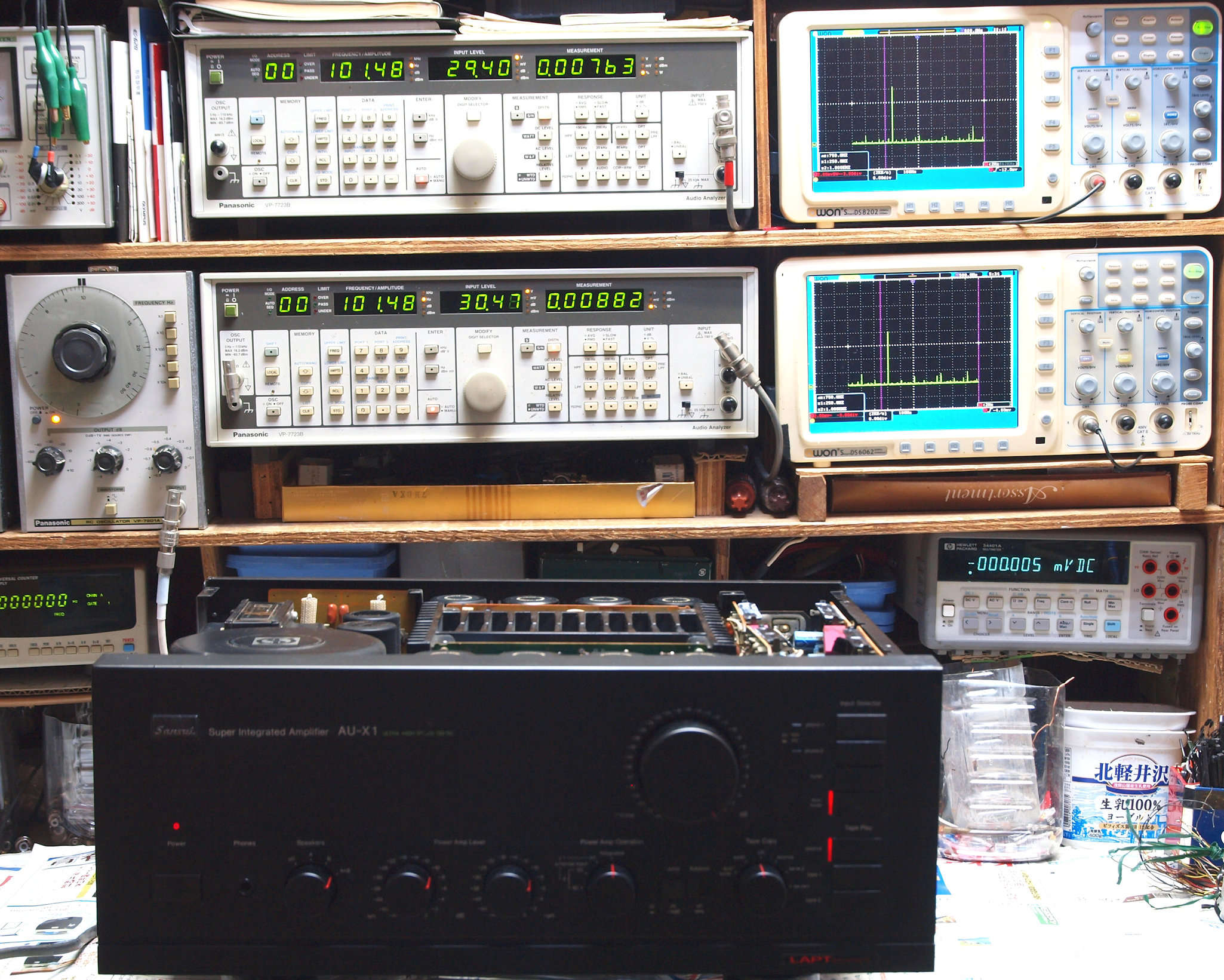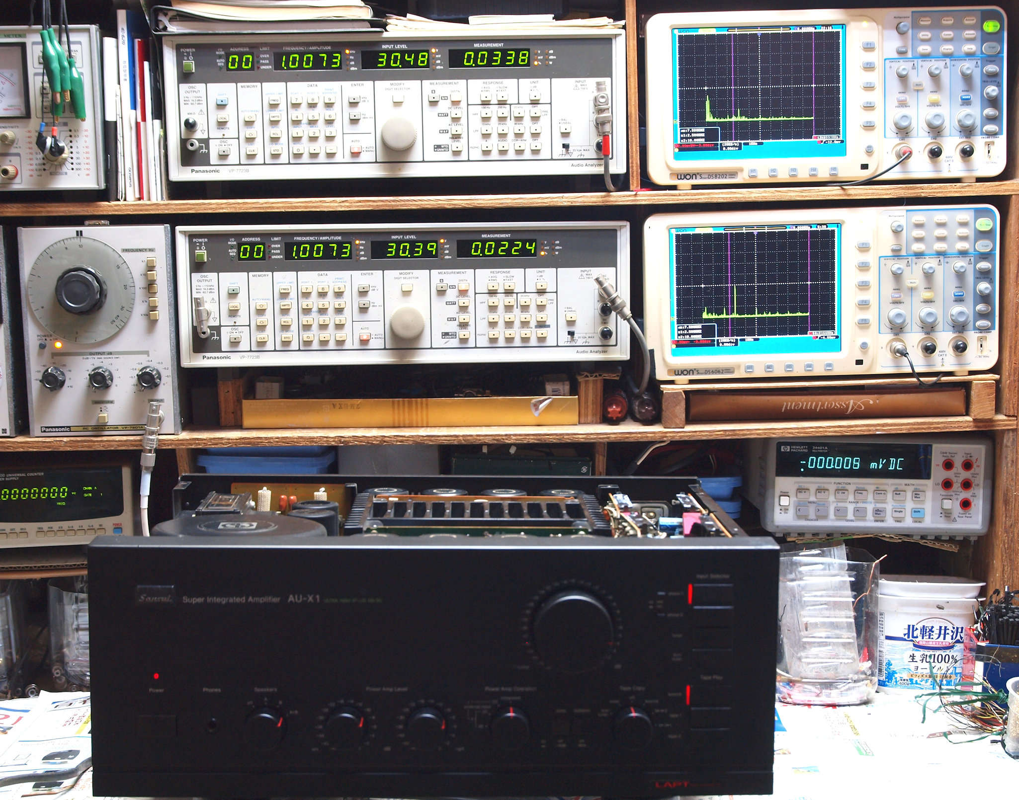 | E. 調整・測定。 E0. 出力・歪み率測定・調整。 「見方」。 上段中 右側SP出力を「Audio Analyzer Panasonic VP−7723B」により測定。 表示LED、 左端=メモリーNo、 中左=周波数測定、 中右=出力電圧測定、 右端=歪み率測定。 上段右端 VP−7723Bの基本波除去出力を「owon SDS8202(200MHZ)」で「FFT分析」表示。 下段中 左側SP出力を「Audio Analyzer Panasonic VP−7723B」により測定。 表示LED、 左端=メモリーNo、 中左=周波数測定、 中右=出力電圧測定、 右端=歪み率測定。 下段右端 VP−7723Bの基本波除去出力を「owon SDS6062(200MHZ)」で「FFT分析」表示。 下段左端 オーディオ発振器 VP−7201A より50Hz〜100kHzの信号を出し(歪み率=約0.003%)、ATT+分配器を通し、AMPに入力。 よって、ダイアル設定出力レベルより低くなります。測定機器の仕様や整備の様子はこちら、「VP−7723B」「VP−7201A」。 FFT画面の見方はこちら。 |