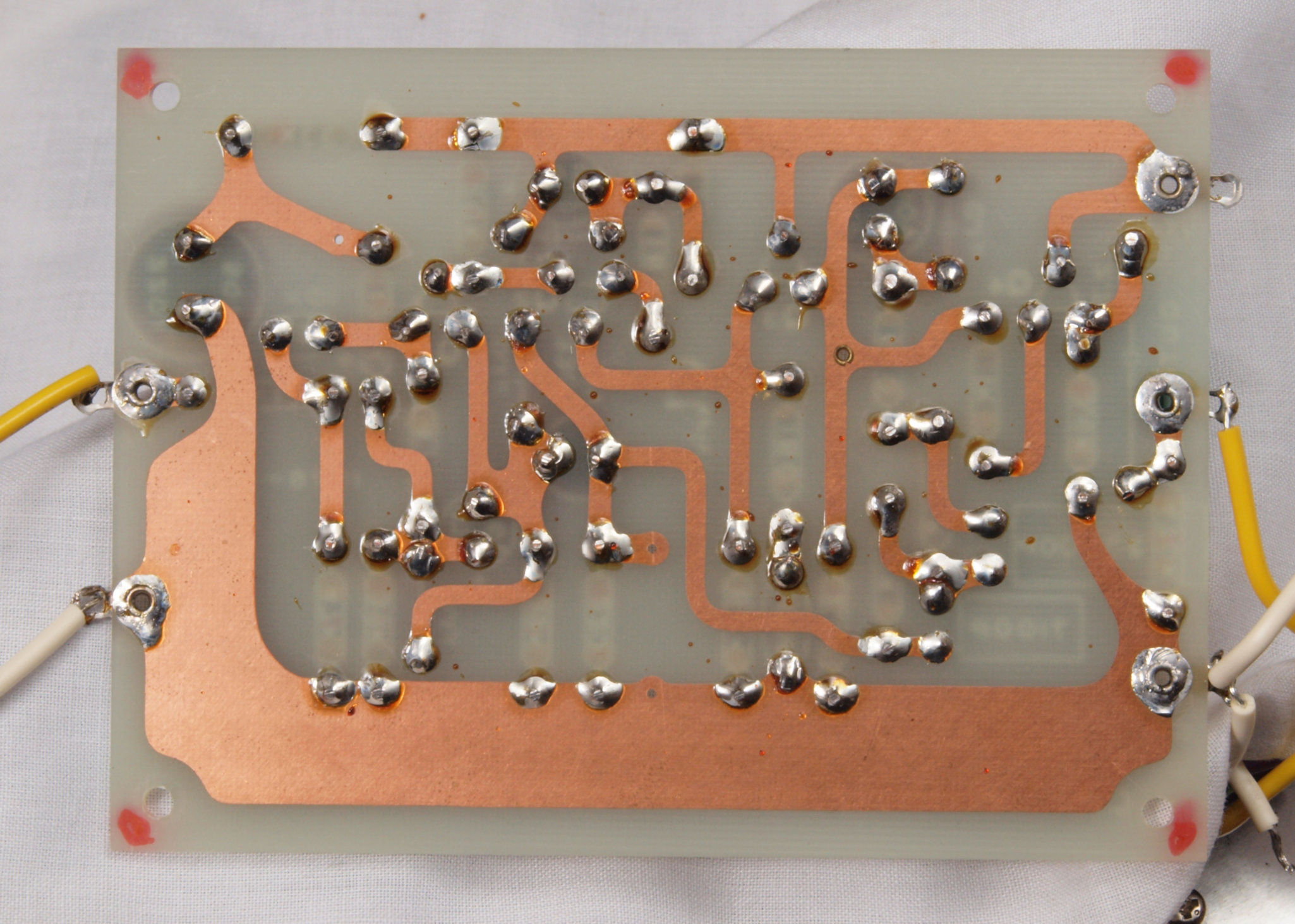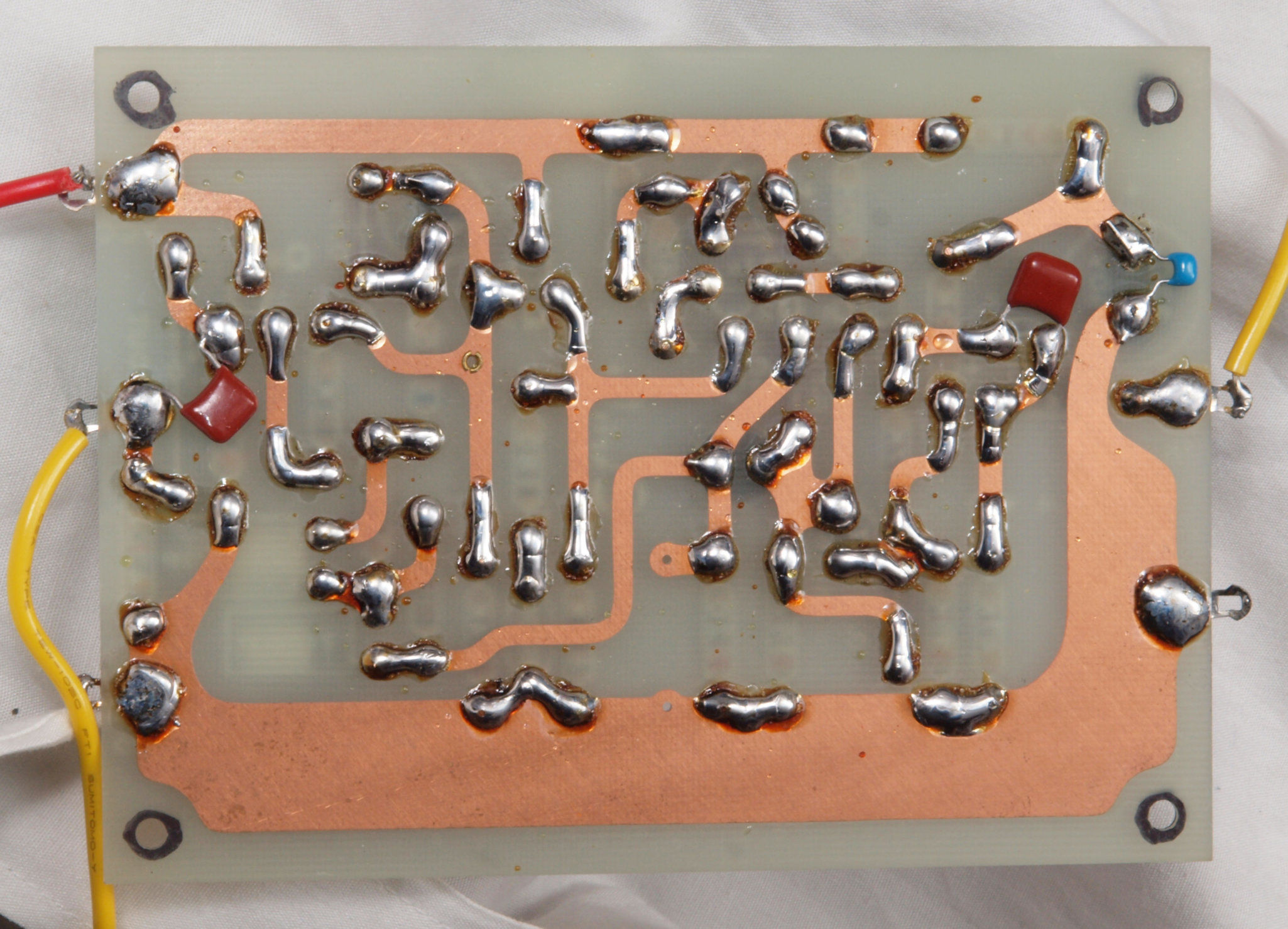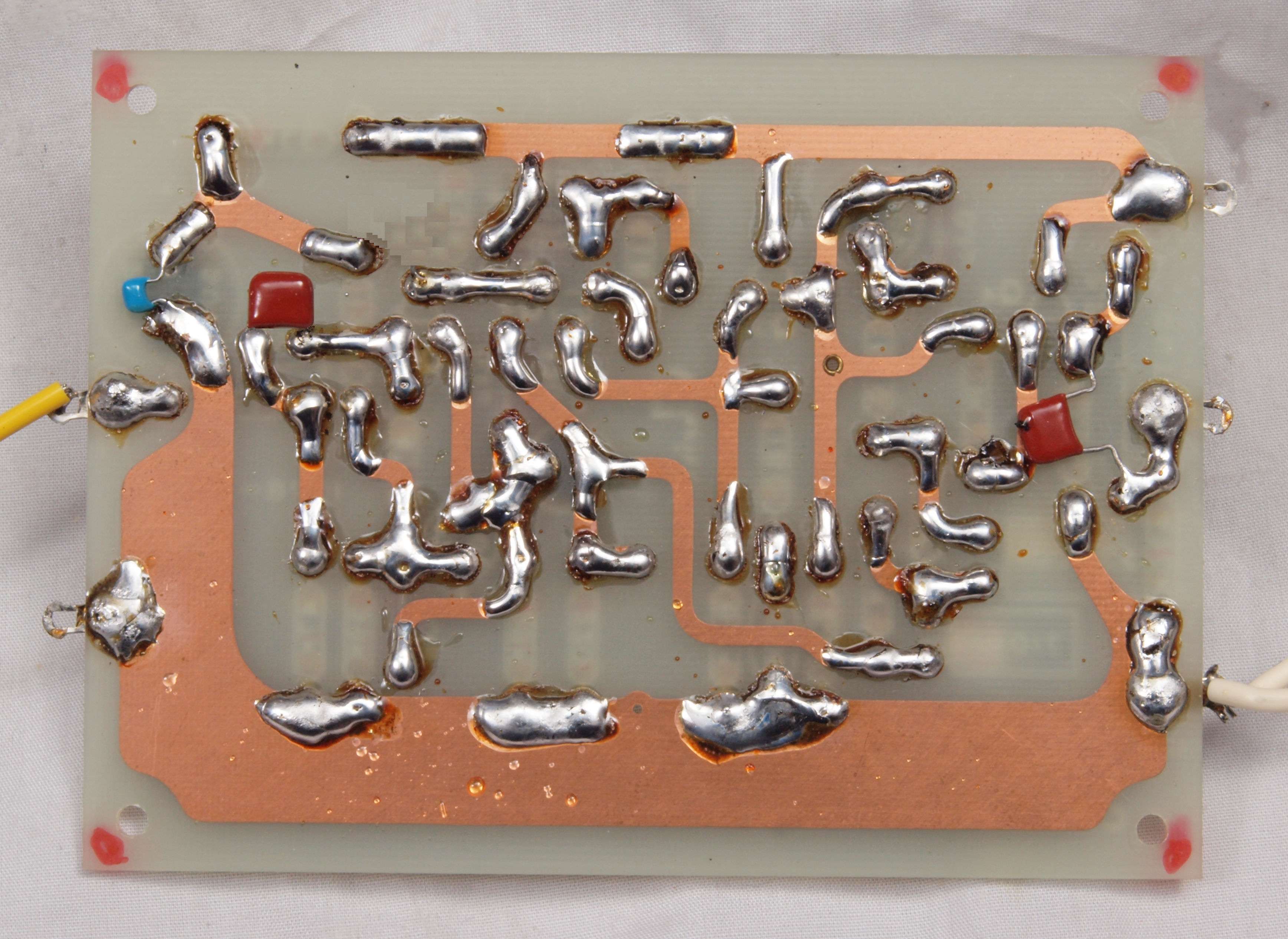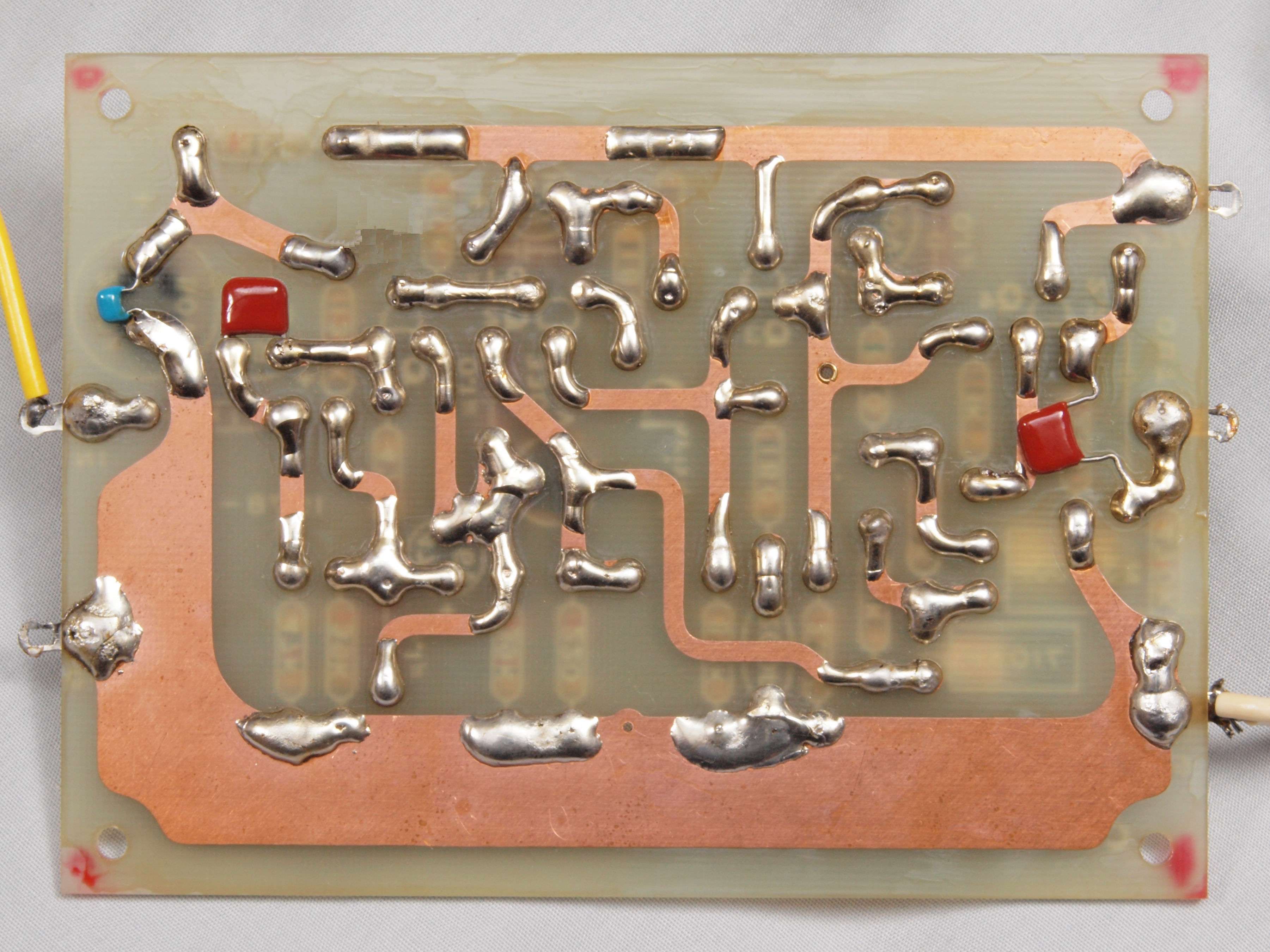 | C44. 修理(半田補正)後 左EQ−AMP基板裏 全ての半田をやり修す。フイルムコンデンサー2個、セラミックコンデンサー1個追加。 | ||||||||||||||||