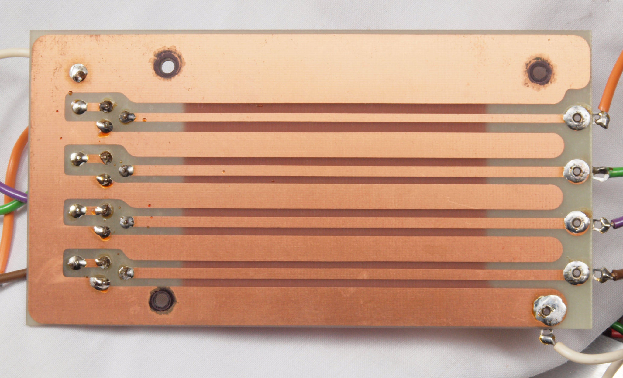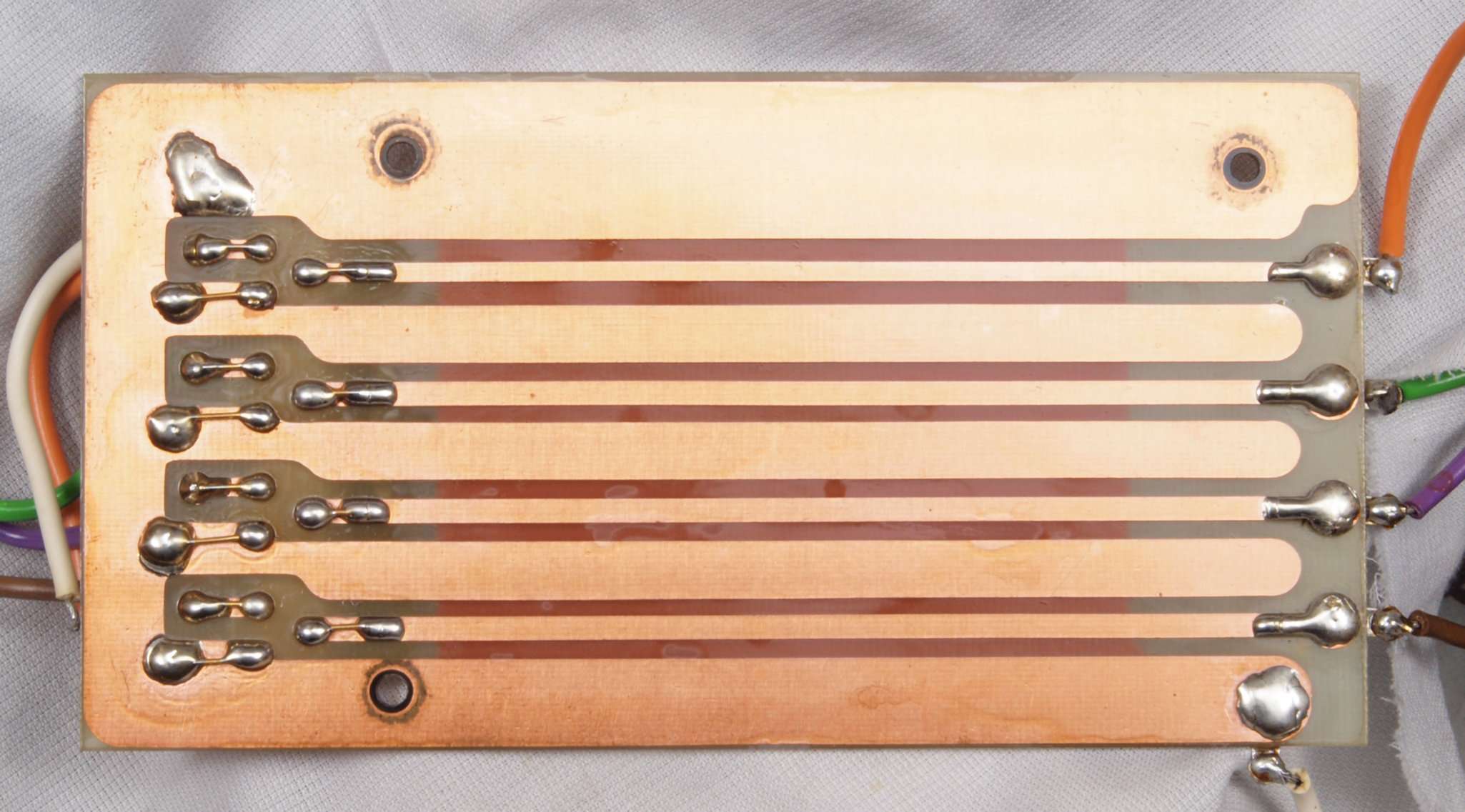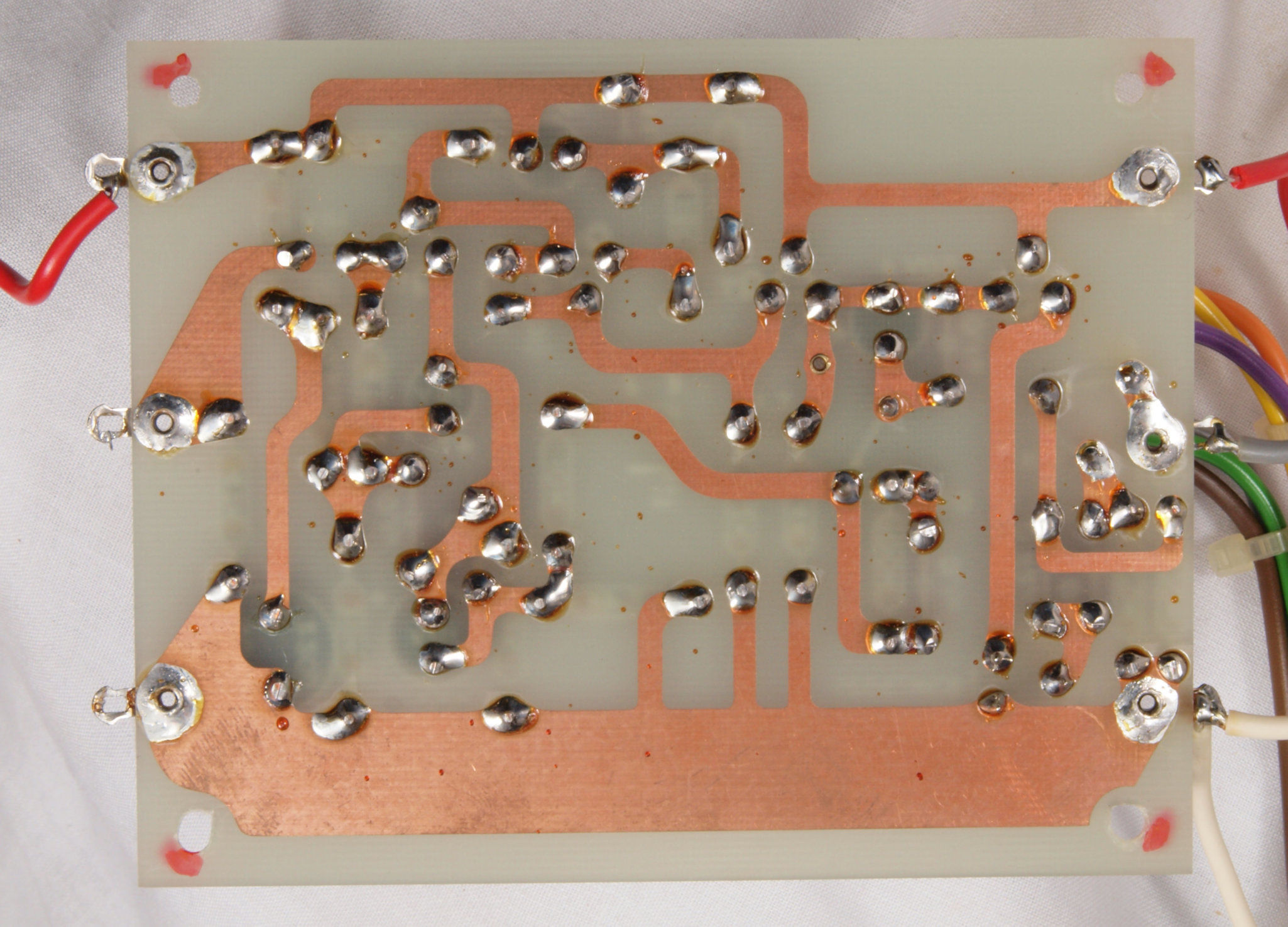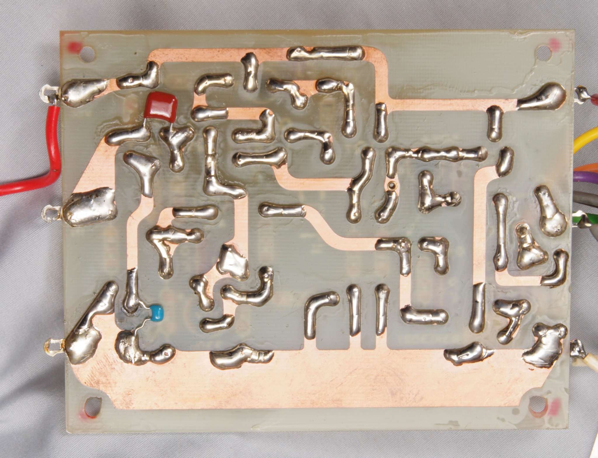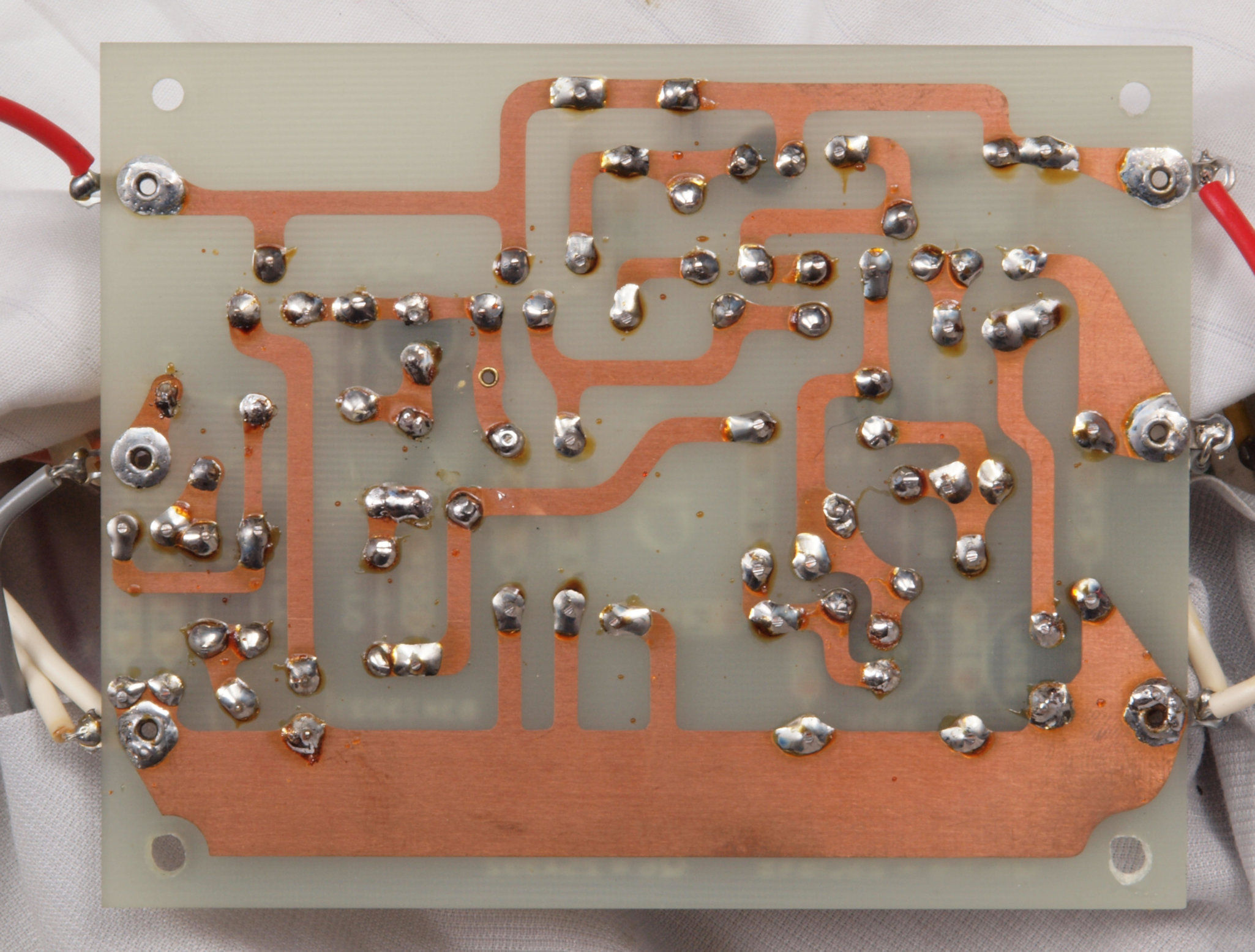| C44. 修理(半田補正)後 左EQ−AMP基板裏 全ての半田をやり修す。フイルムコンデンサー2個、セラミックコンデンサー1個追加。 | ||||||||||||||||