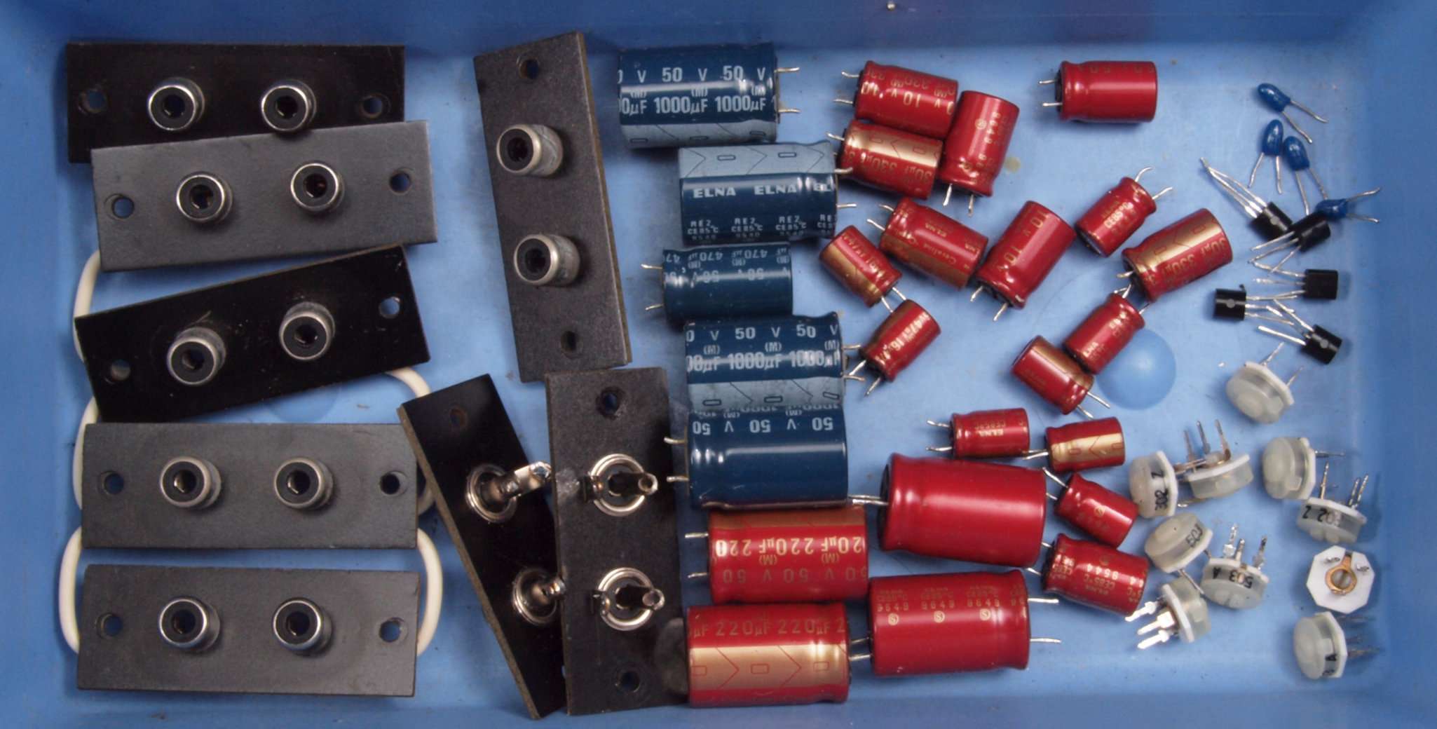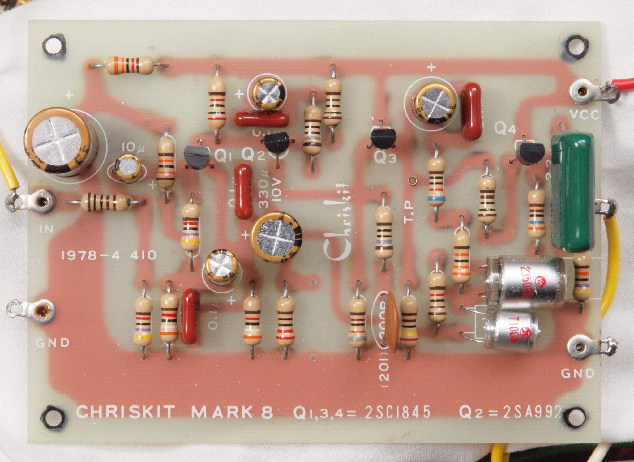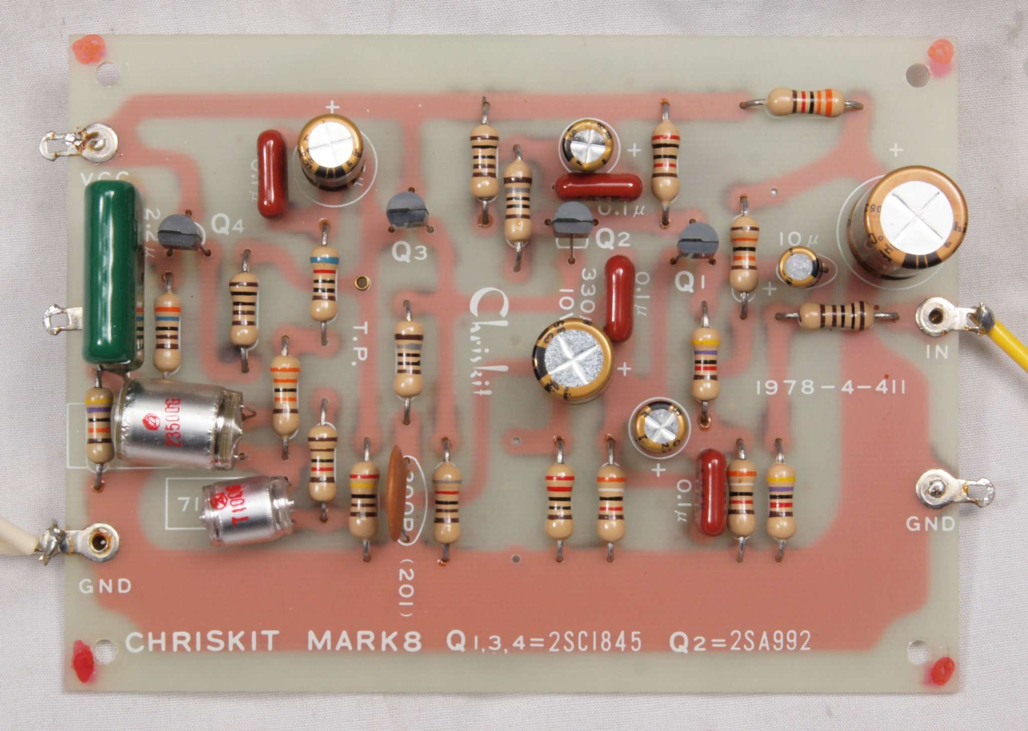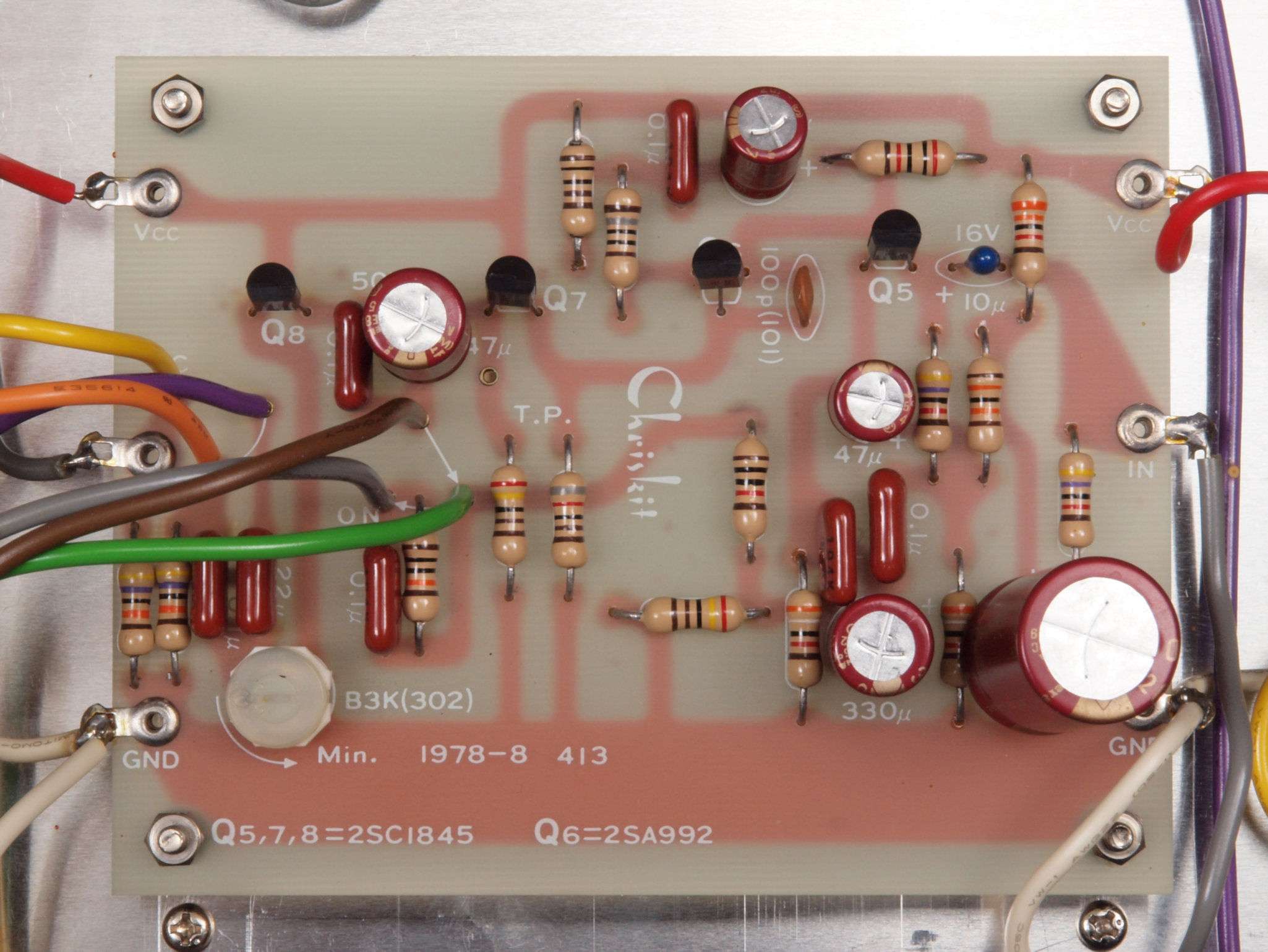 | C22. 修理後 左AMP基板 電解コンデンサー6個、半固定VR1個、TR(トランジスター)4個交換。 | ||||||||||||||||
