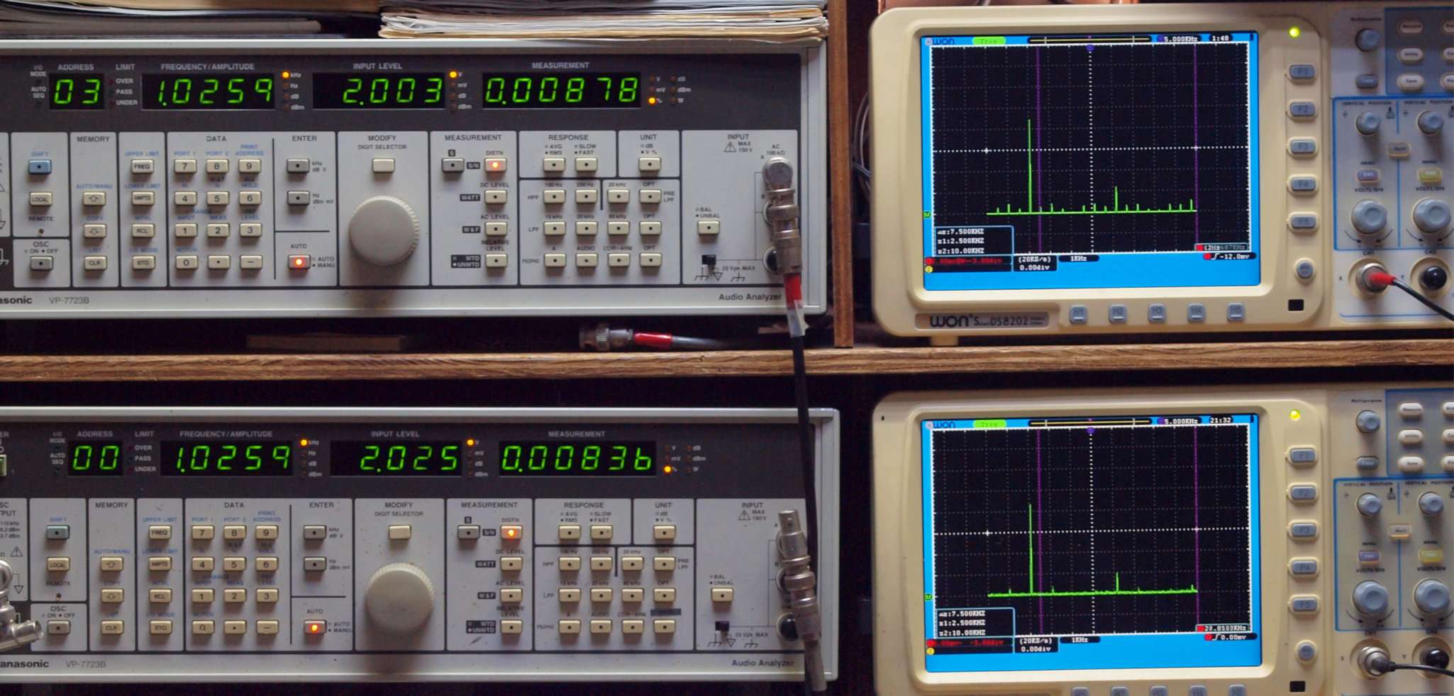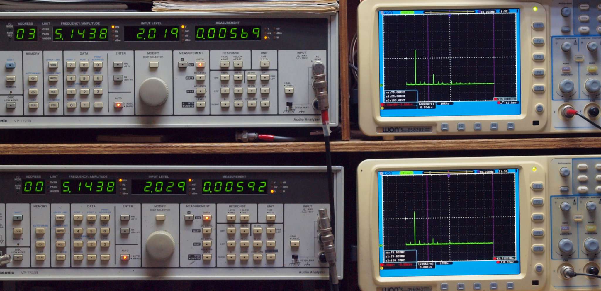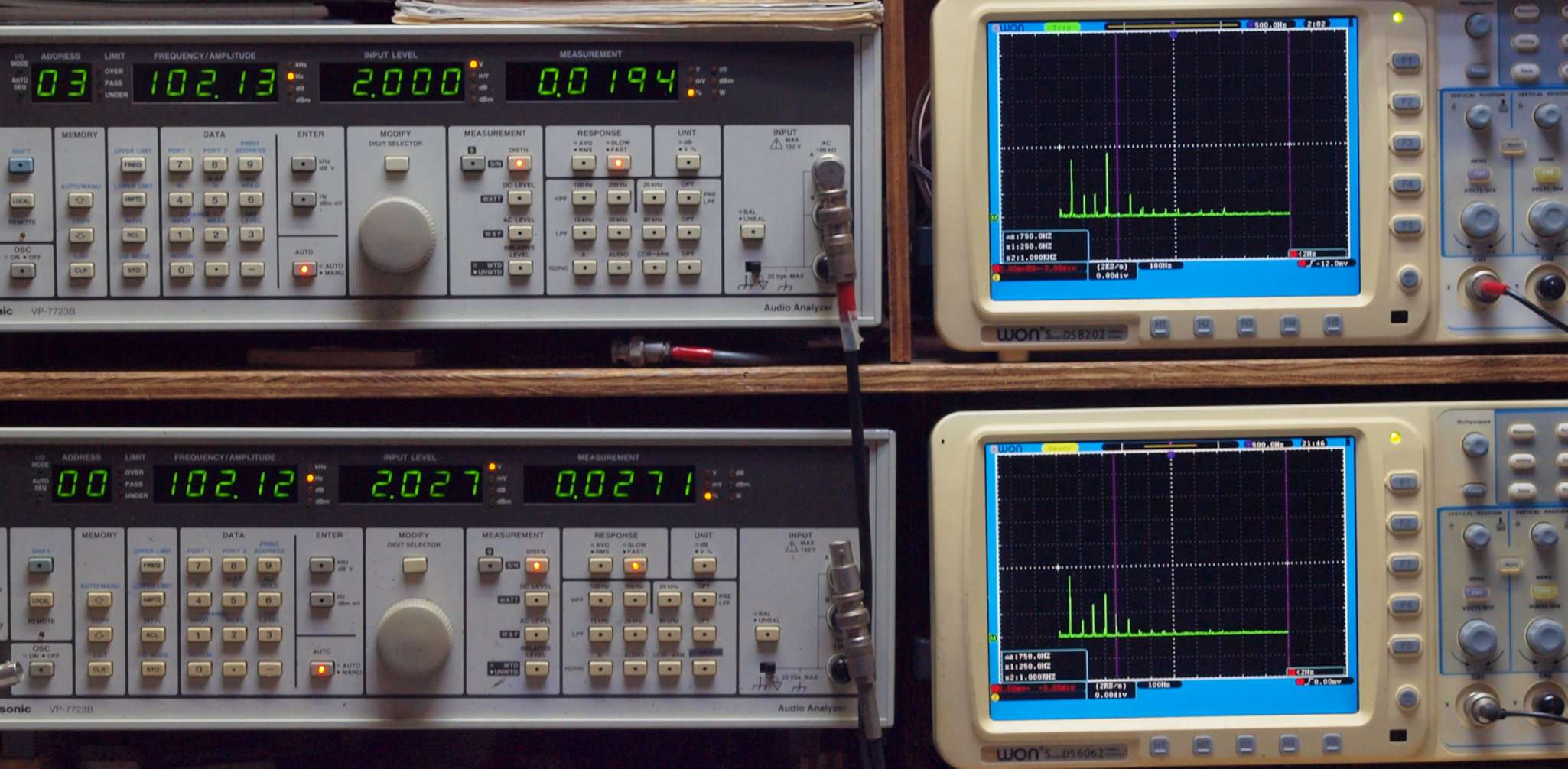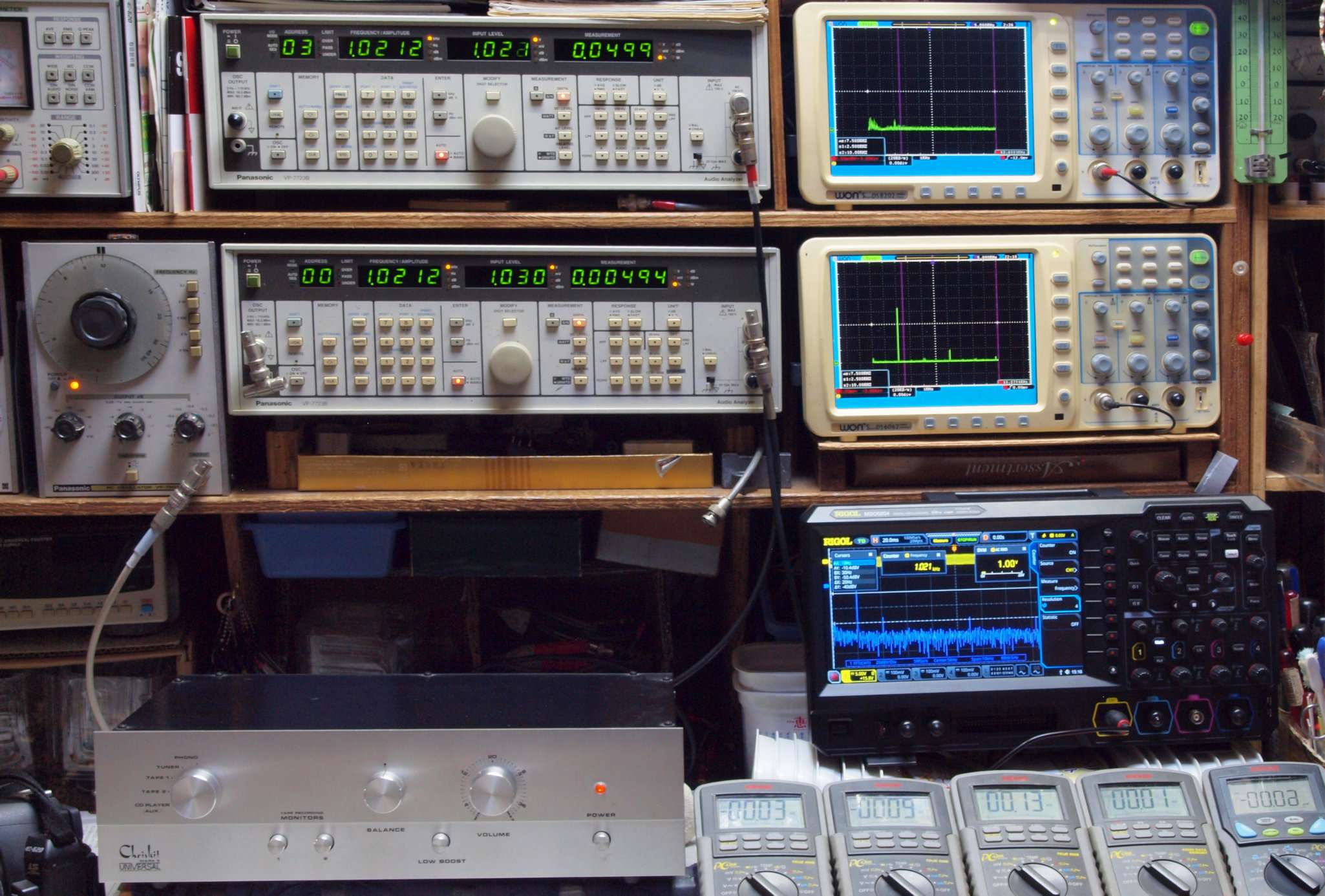 | E. 調整・測定。 画像をクリックすると、大きく(横幅2050ドット)表示されます。 E0. 出力・歪み率測定・調整。 「見方」。 上段中 右側SP出力を「Audio Analyzer Panasonic VP−7723B」により測定。 表示LED、 左端=メモリーNo、 中左=周波数測定、 中右=出力電圧測定、 右端=歪み率測定。 上段右端 VP−7723Bの基本波除去出力を「owon SDS8202(200MHZ)」で「FFT分析」表示。 下段中 左側SP出力を「Audio Analyzer Panasonic VP−7723B」により測定。 表示LED、 左端=メモリーNo、 中左=周波数測定、 中右=出力電圧測定、 右端=歪み率測定。 下段右端 VP−7723Bの本波除去出力を「owon SDS6062(200MHZ)」で「FFT分析」表示。 下段左端 オーディオ発振器 VP−7201A より50Hz〜100kHzの信号を出し(歪み率=約0.003%)、ATT+分配器を通し、AMPに入力。 よって、ダイアル設定出力レベルより低くなります。測定機器の仕様や整備の様子はこちら、「VP−7723B」「VP−7201A」。 FFT画面の見方はこちら。 |