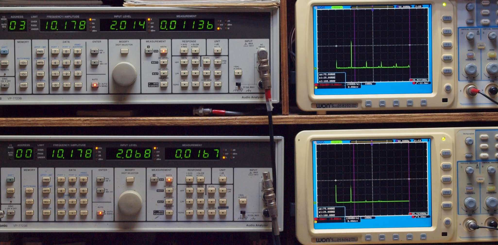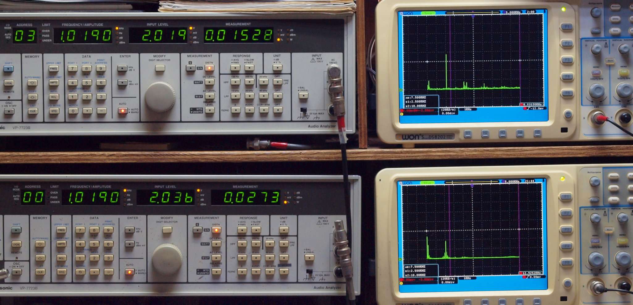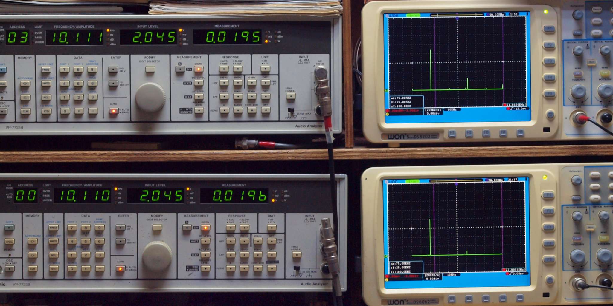 | E. 調整・測定。 画像をクリックすると、大きく(横幅2050ドット)表示されます。 E0. 出力・歪み率測定・調整。 「見方」。 上段中 右側SP出力を「Audio Analyzer Panasonic VP−7723B」により測定。 表示LED、 左端=メモリーNo、 中左=周波数測定、 中右=出力電圧測定、 右端=歪み率測定。 上段右端 VP−7723Bの基本波除去出力を「owon SDS8202(200MHZ)」で「FFT分析」表示。 下段中 左側SP出力を「Audio Analyzer Panasonic VP−7723B」により測定。 表示LED、 左端=メモリーNo、 中左=周波数測定、 中右=出力電圧測定、 右端=歪み率測定。 下段右端 VP−7723Bの本波除去出力を「owon SDS6062(200MHZ)」で「FFT分析」表示。 下段左端 オーディオ発振器 VP−7201A より50Hz〜100kHzの信号を出し(歪み率=約0.003%)、ATT+分配器を通し、AMPに入力。 よって、ダイアル設定出力レベルより低くなります。測定機器の仕様や整備の様子はこちら、「VP−7723B」「VP−7201A」。 FFT画面の見方はこちら。 |