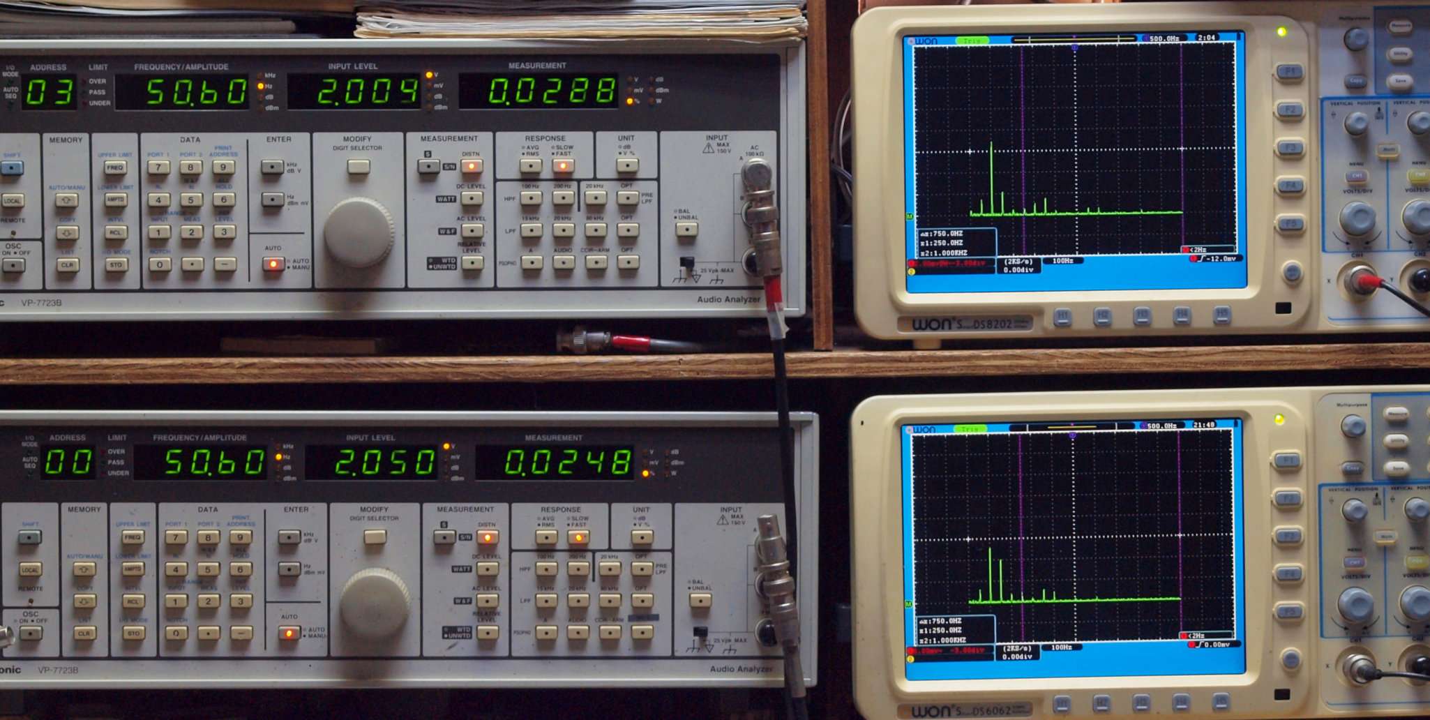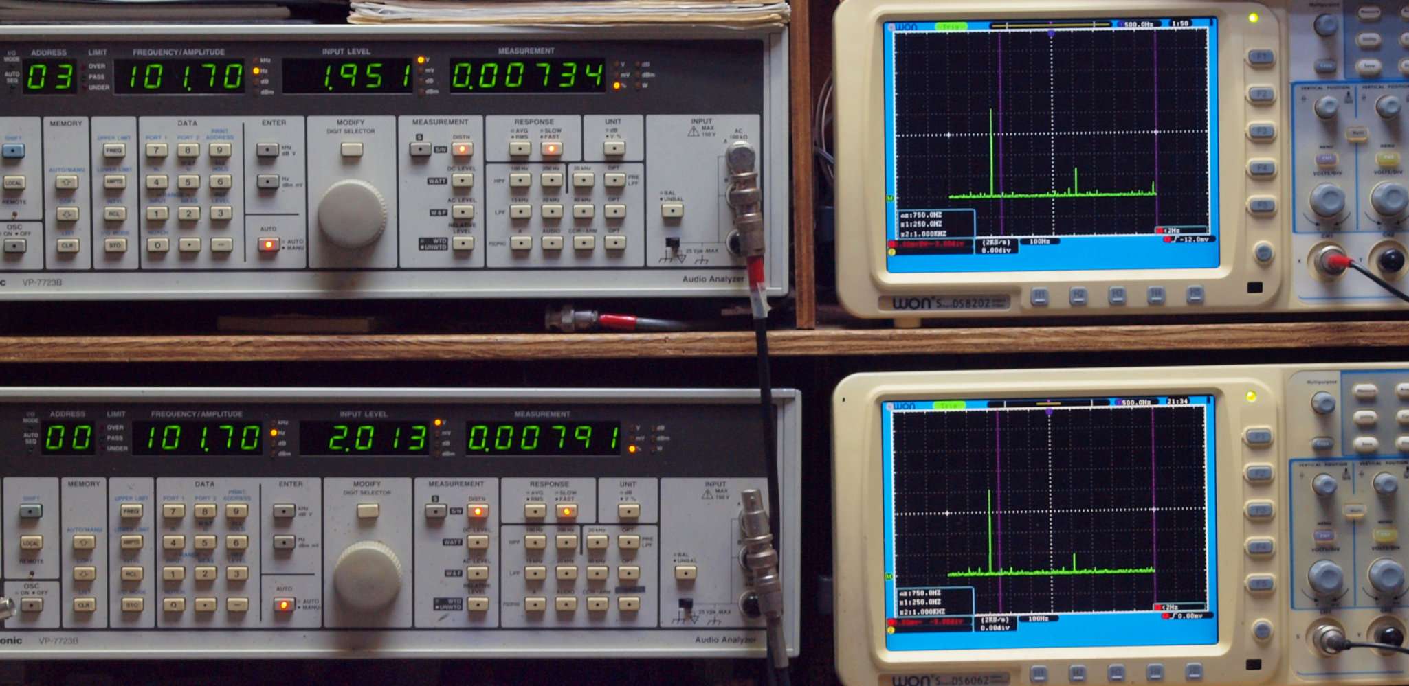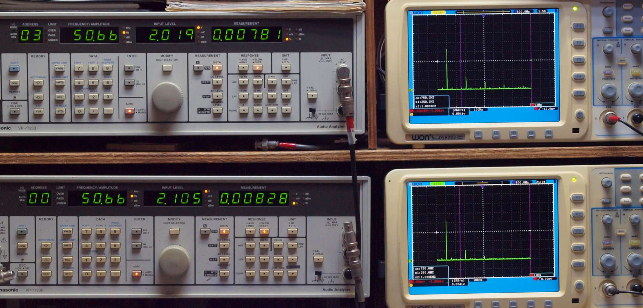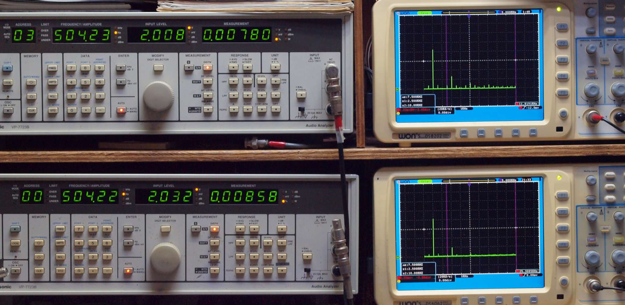 | E. 調整・測定。 画像をクリックすると、大きく(横幅2050ドット)表示されます。 E0. 出力・歪み率測定・調整。 「見方」。 上段中 右側SP出力を「Audio Analyzer Panasonic VP−7723B」により測定。 表示LED、 左端=メモリーNo、 中左=周波数測定、 中右=出力電圧測定、 右端=歪み率測定。 上段右端 VP−7723Bの基本波除去出力を「owon SDS8202(200MHZ)」で「FFT分析」表示。 下段中 左側SP出力を「Audio Analyzer Panasonic VP−7723B」により測定。 表示LED、 左端=メモリーNo、 中左=周波数測定、 中右=出力電圧測定、 右端=歪み率測定。 下段右端 VP−7723Bの本波除去出力を「owon SDS6062(200MHZ)」で「FFT分析」表示。 下段左端 オーディオ発振器 VP−7201A より50Hz〜100kHzの信号を出し(歪み率=約0.003%)、ATT+分配器を通し、AMPに入力。 よって、ダイアル設定出力レベルより低くなります。測定機器の仕様や整備の様子はこちら、「VP−7723B」「VP−7201A」。 FFT画面の見方はこちら。 |