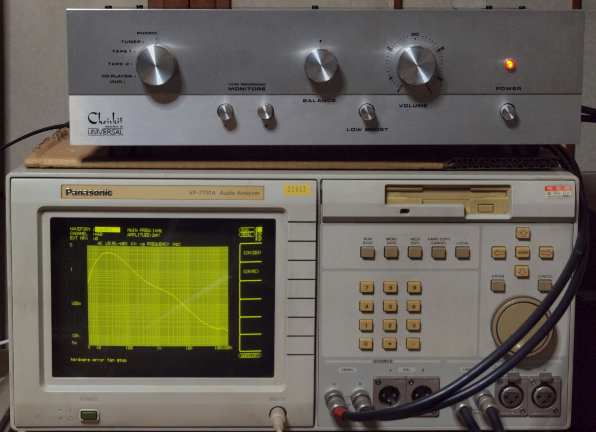 | F. 上位測定器による 調整・測定。 画像をクリックすると、大きく(横幅2050ドット)表示されます。 F0. 下のオーディオアナライザーVP−7732Aで自動測定 |