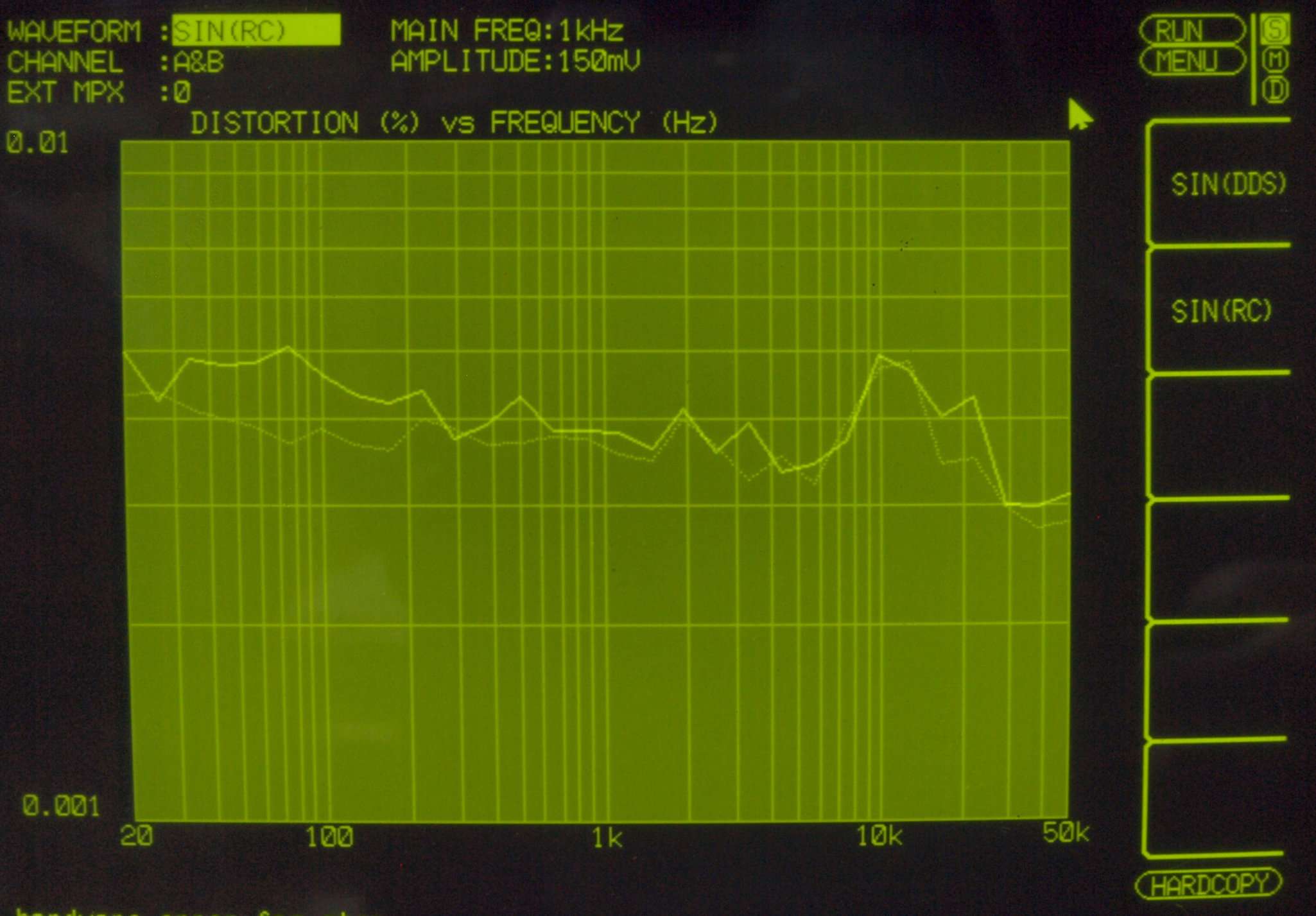 | E24. MM_1kHz入力、R側出力電圧=2V、 0.01528%歪み。 L側出力電圧=2V、 0.0273%歪み。 「FFT分析」のオシロのカーソル周波数、左=2.5kHz、右=10kHz。 |