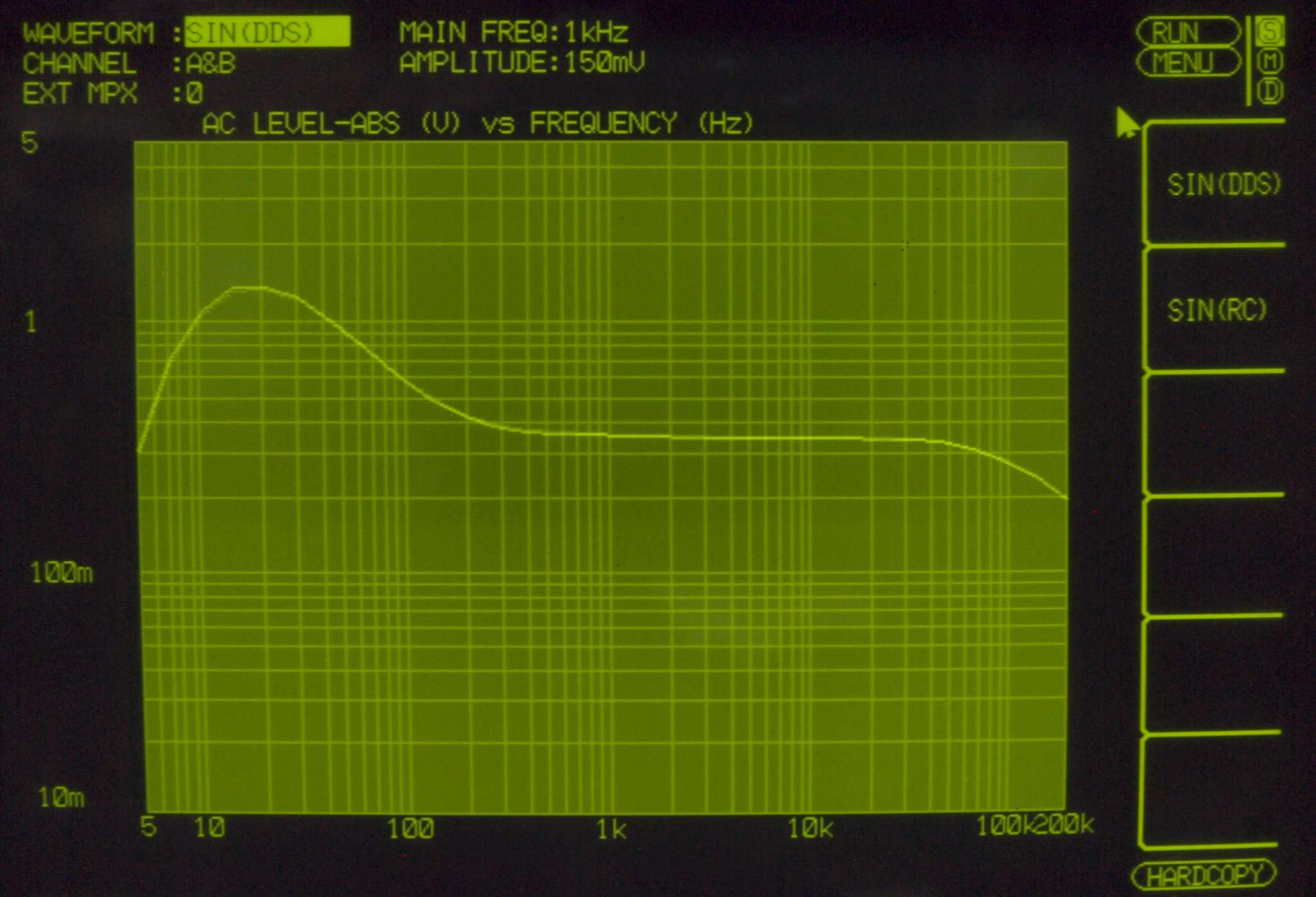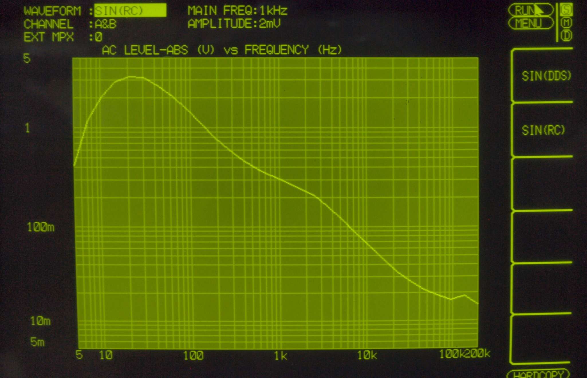 | F4. 入出力特性測定(MM入力) MM入力 入力電圧=2mV一定入力 VRはmax 左出力=薄(細い)色 右出力=濃い(太い)色 |