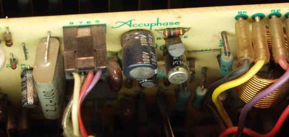 | B3. 終段基板コンデンサー交換 熱の為、ビニールの剥けたコンデンサー |
