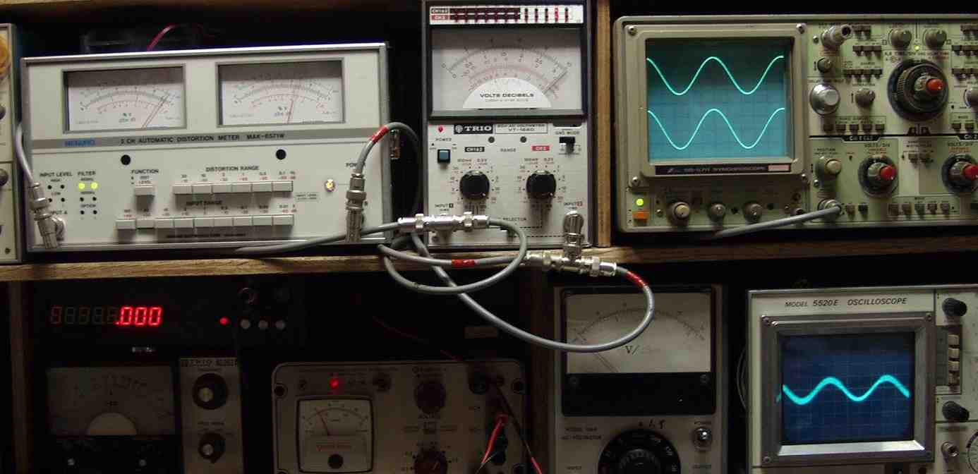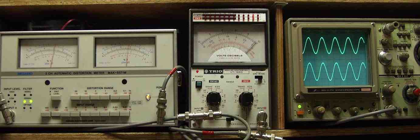| T. 修理前点検測定 T1. 出力・歪み率測定・調整 FETは自己回復能力があるので、バラック修理後は1度もプロテクト動作なし AUX入力 400HZ SP出力電圧30V=112W 歪み率=1.8% |