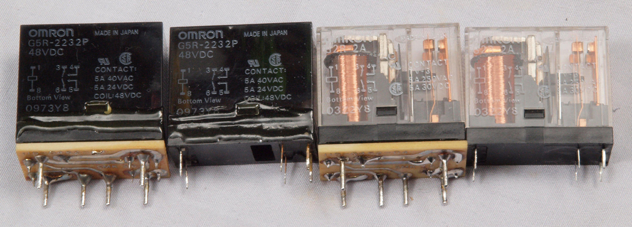 | CI2. 交換部品、SP接続リレー。 左=付いていた物、右=交換した物。 オムロンで購入5,640円/6個、納期4ヶ月。 | ||||||||||||||||||||||||||||||||||||||||||||||||||||||||||||||||||||||||||||||||||||||