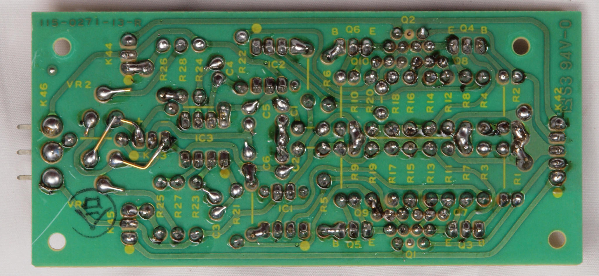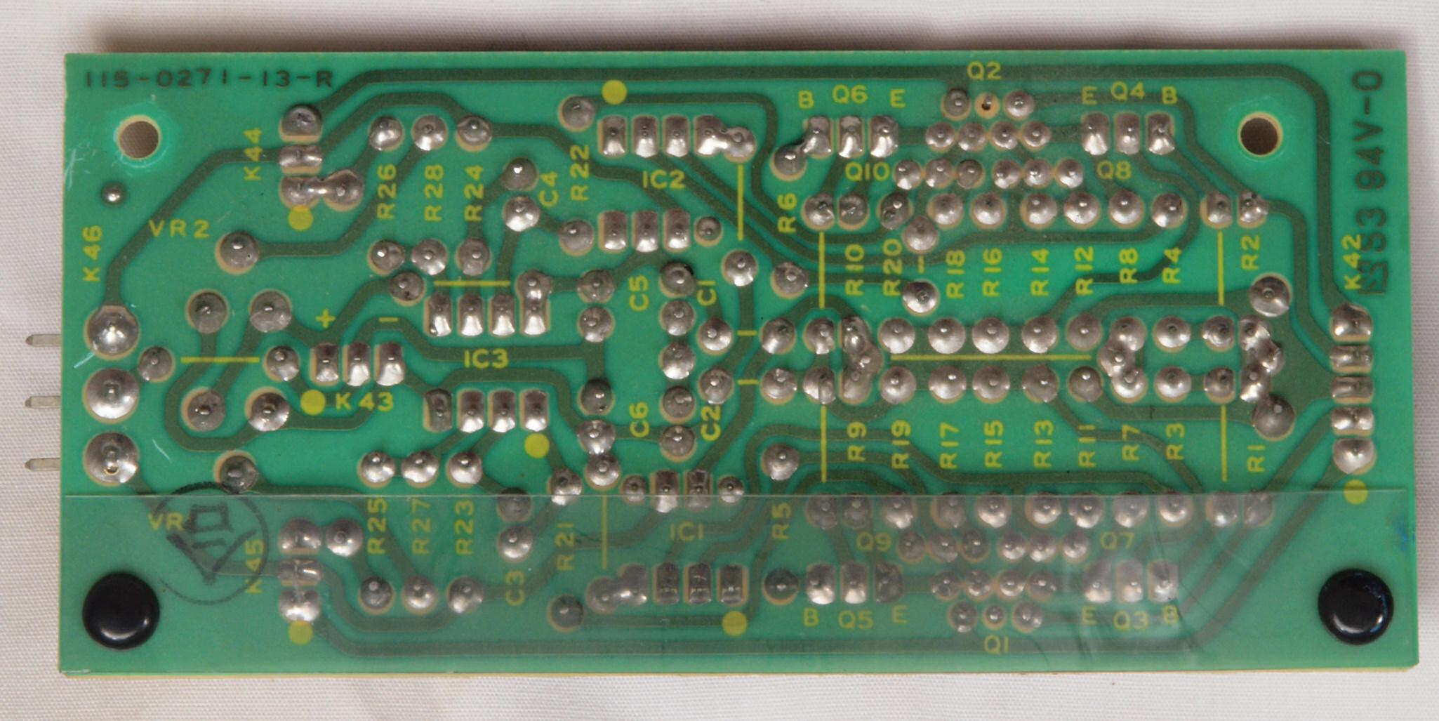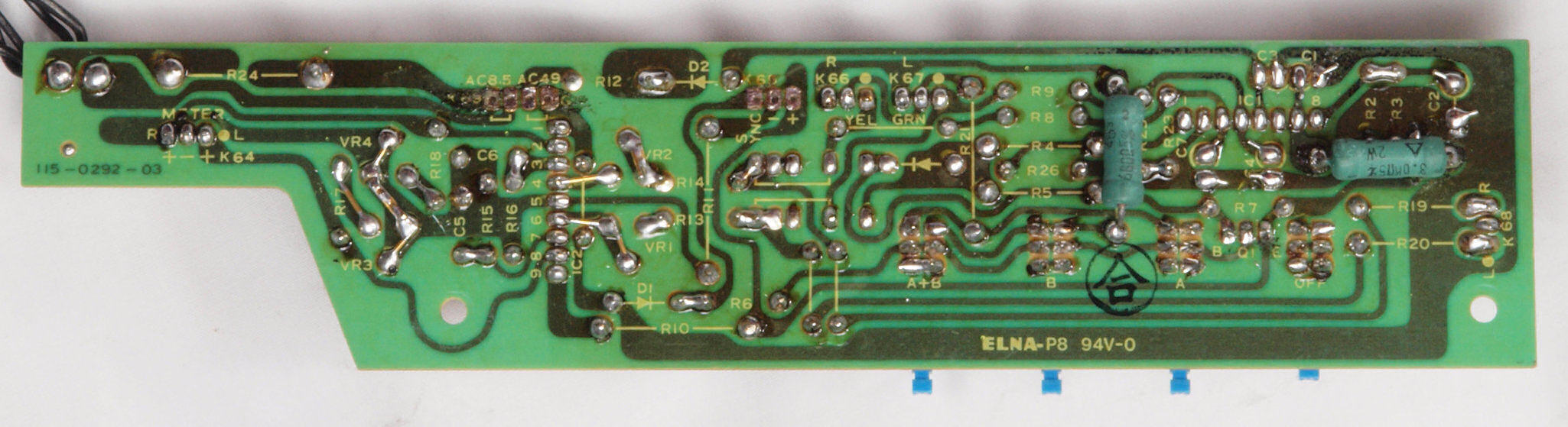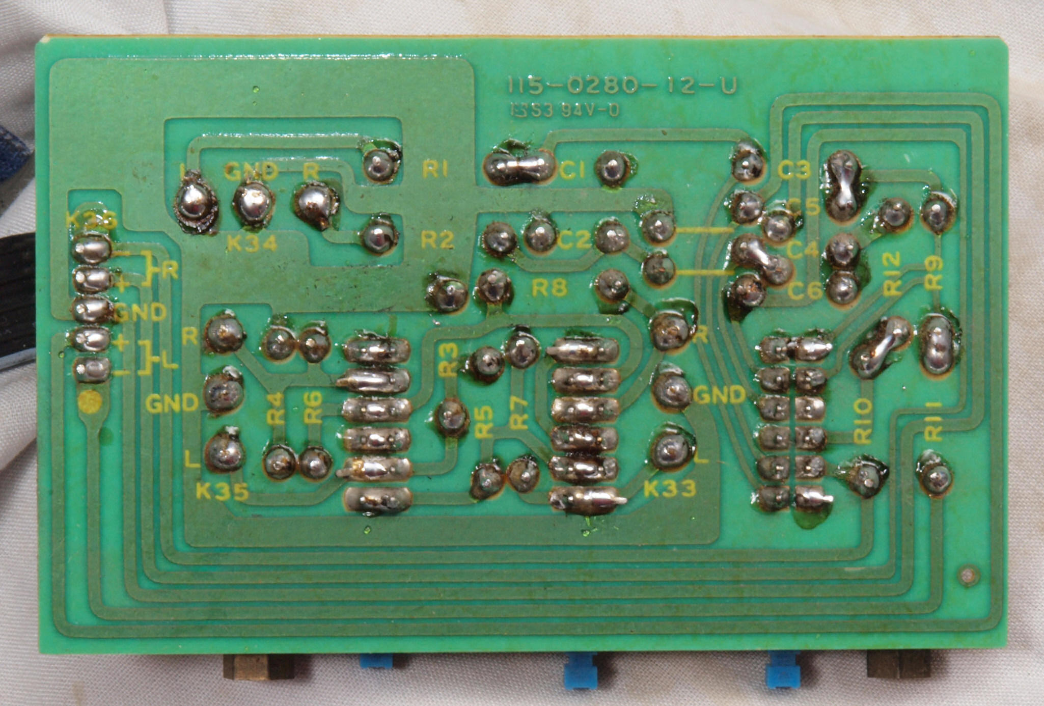 | CC13. 修理後 ヘッドアンプ/イコライザーアンプ基板。 トルエン溶媒の接着剤を取り去り、コートを塗布後。 | ||||||||||||||||||||||||||||||||||||||||||||||||||||||||||||||||||||||||||||||||||||||