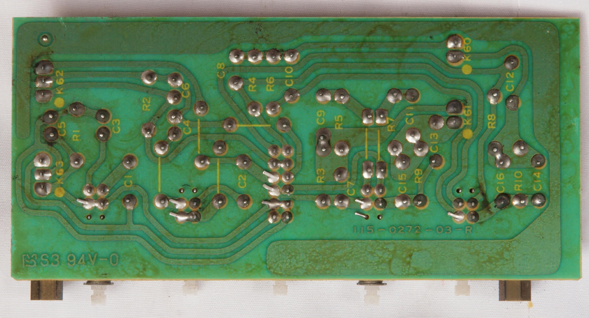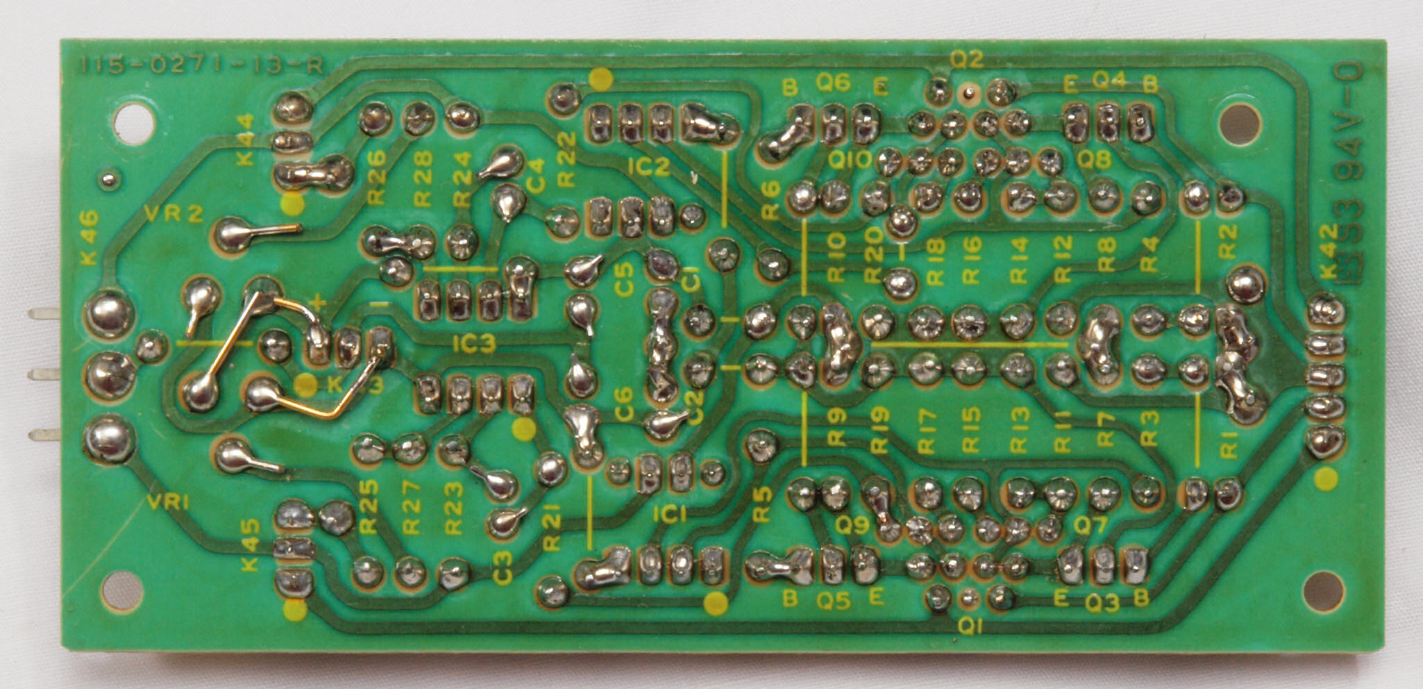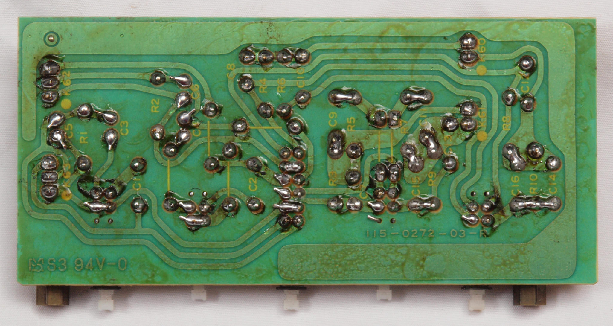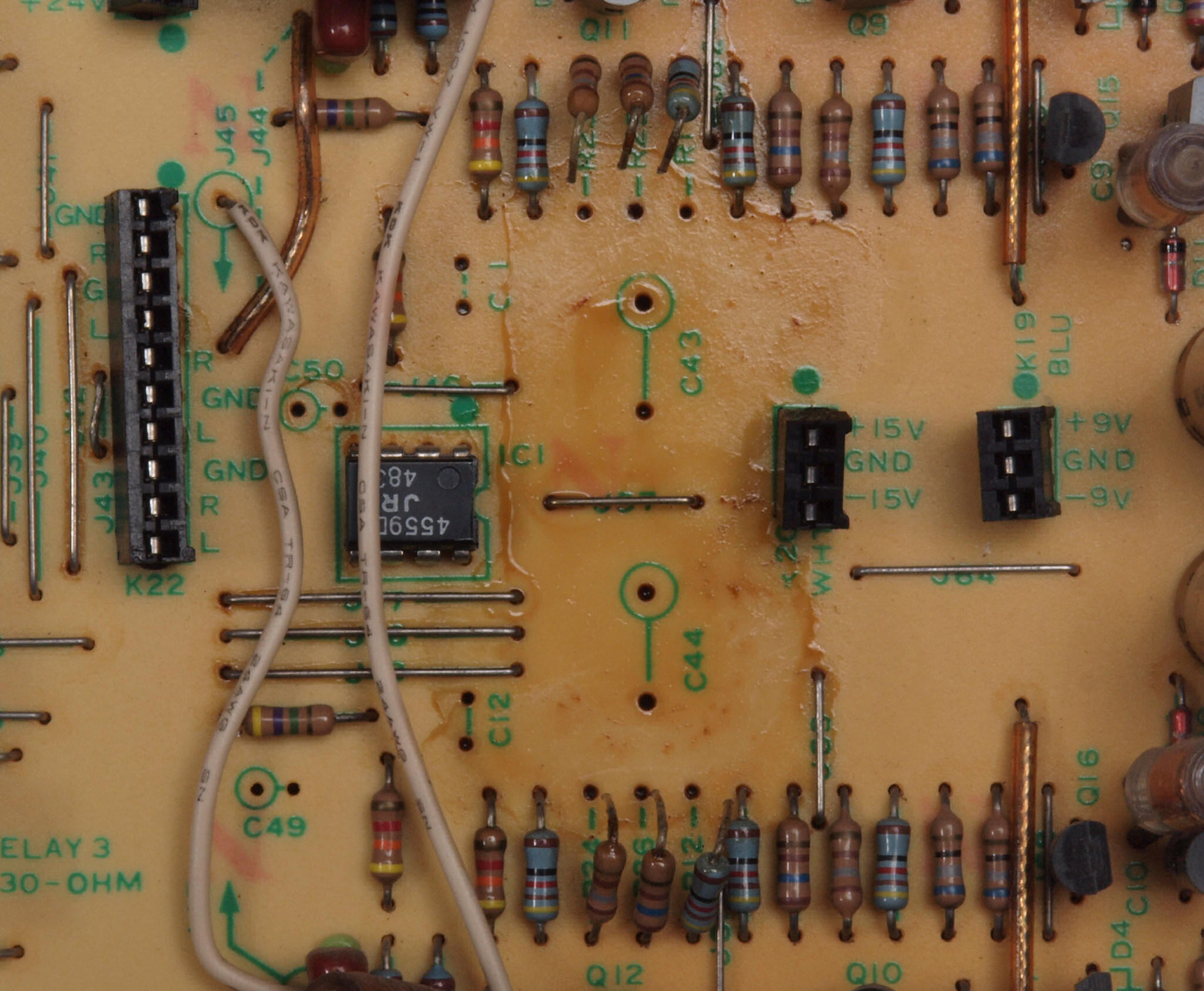 | CC13. 修理後 ヘッドアンプ/イコライザーアンプ基板。 トルエン溶媒の接着剤を取り去り、コートを塗布後。 | ||||||||||||||||||||||||||||||||||||||||||||||||||||||||||||||||||||||||||||||||||||||