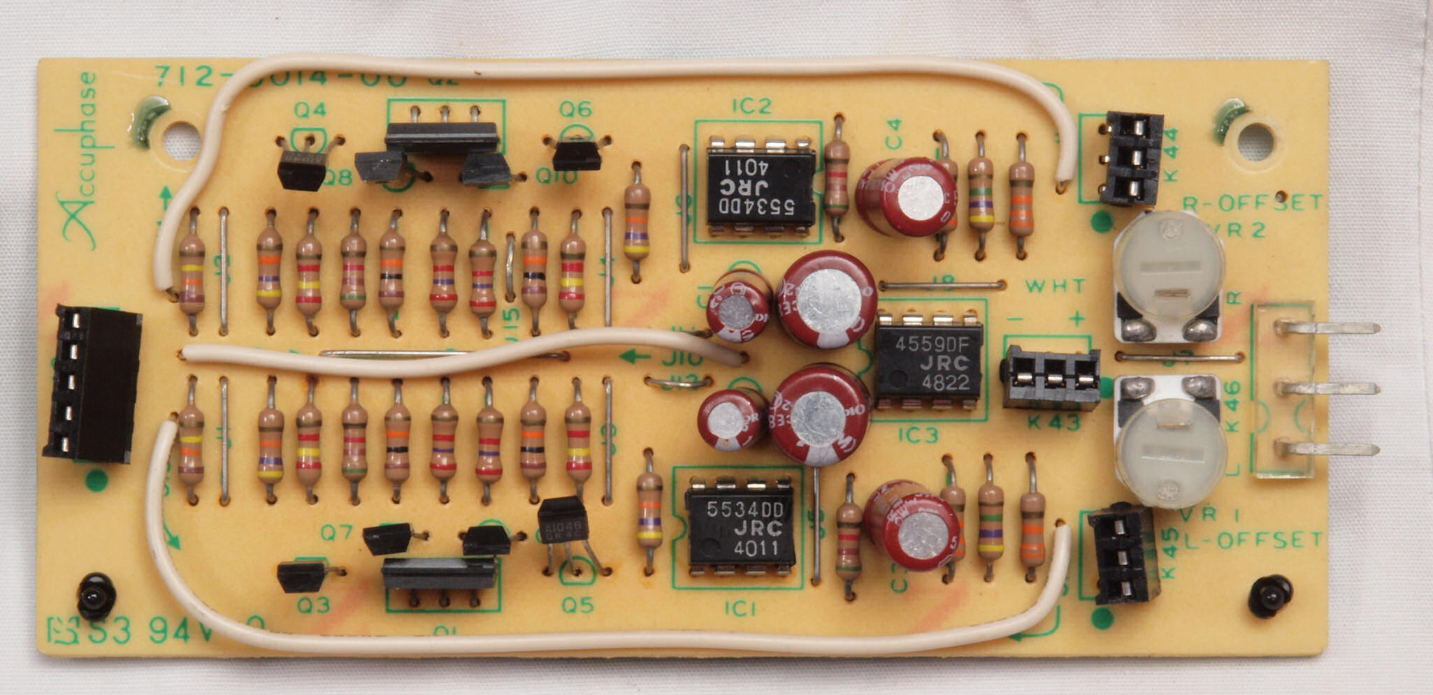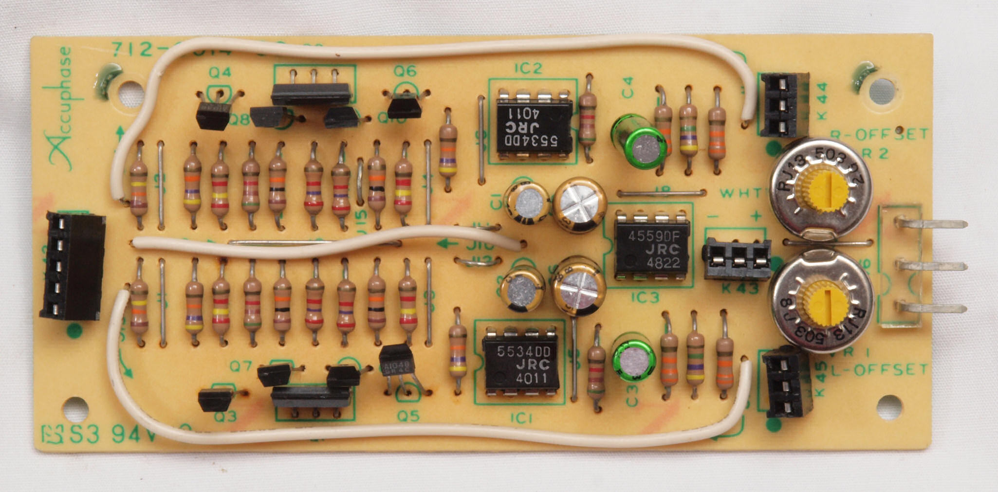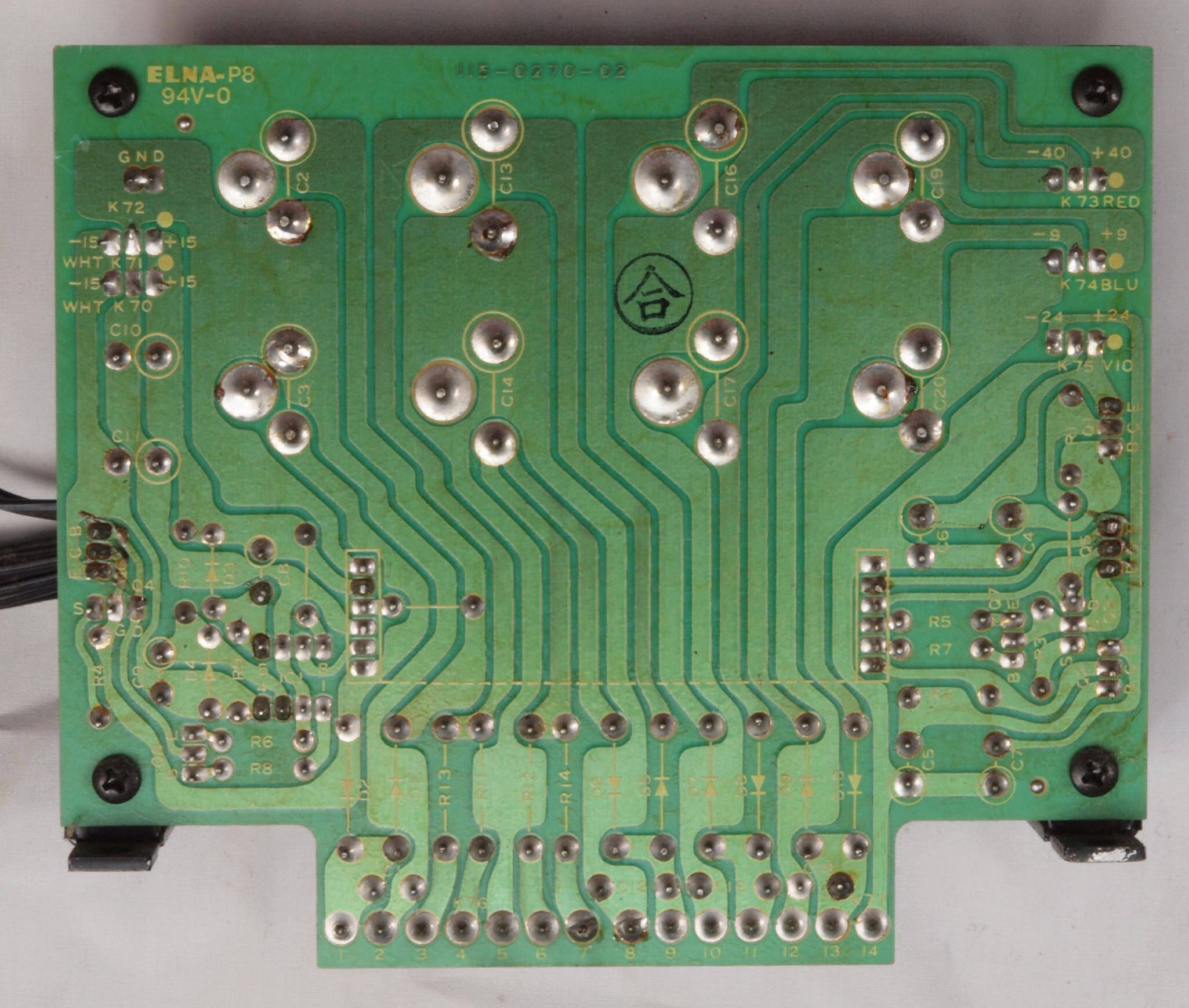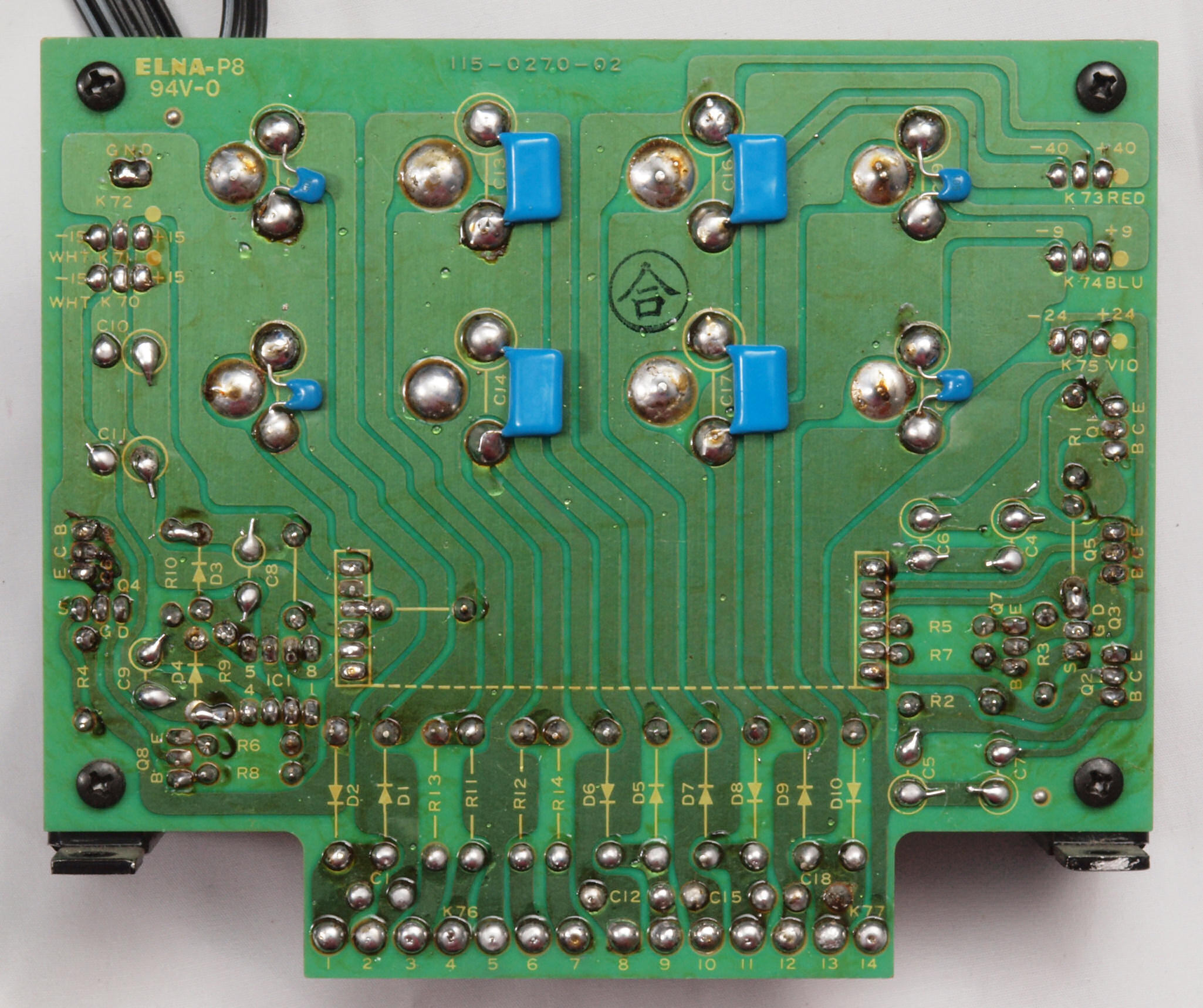 | CC13. 修理後 ヘッドアンプ/イコライザーアンプ基板。 トルエン溶媒の接着剤を取り去り、コートを塗布後。 | ||||||||||||||||||||||||||||||||||||||||||||||||||||||||||||||||||||||||||||||||||||||