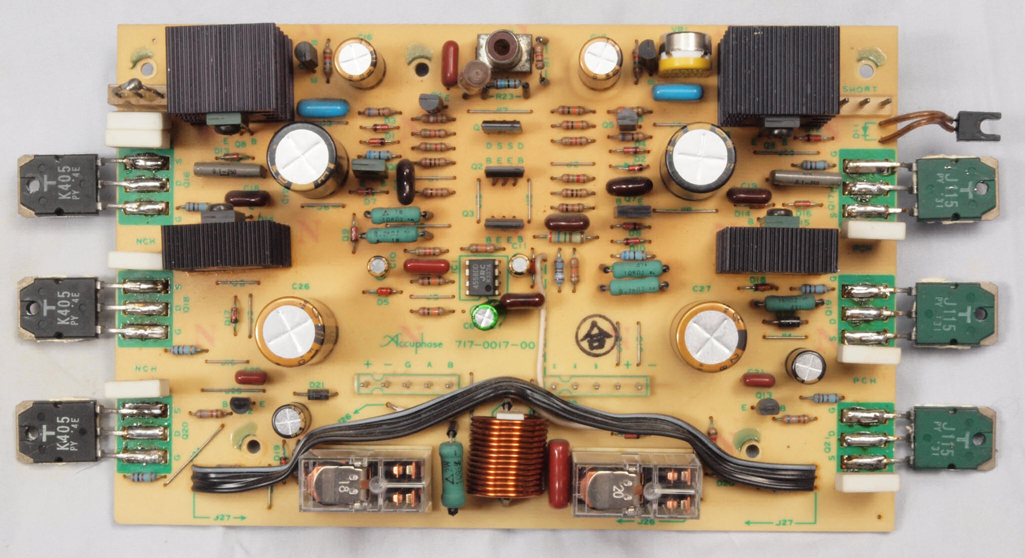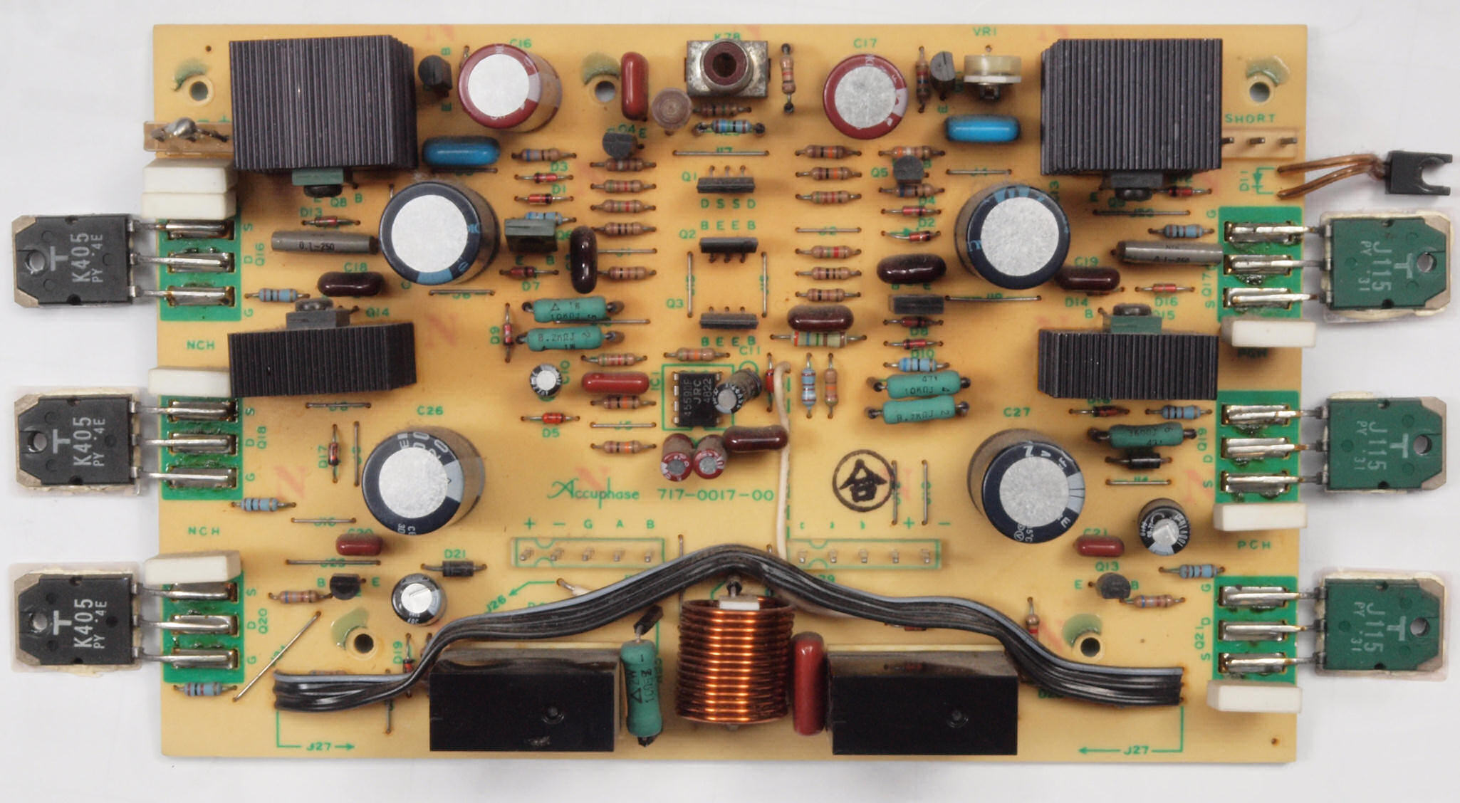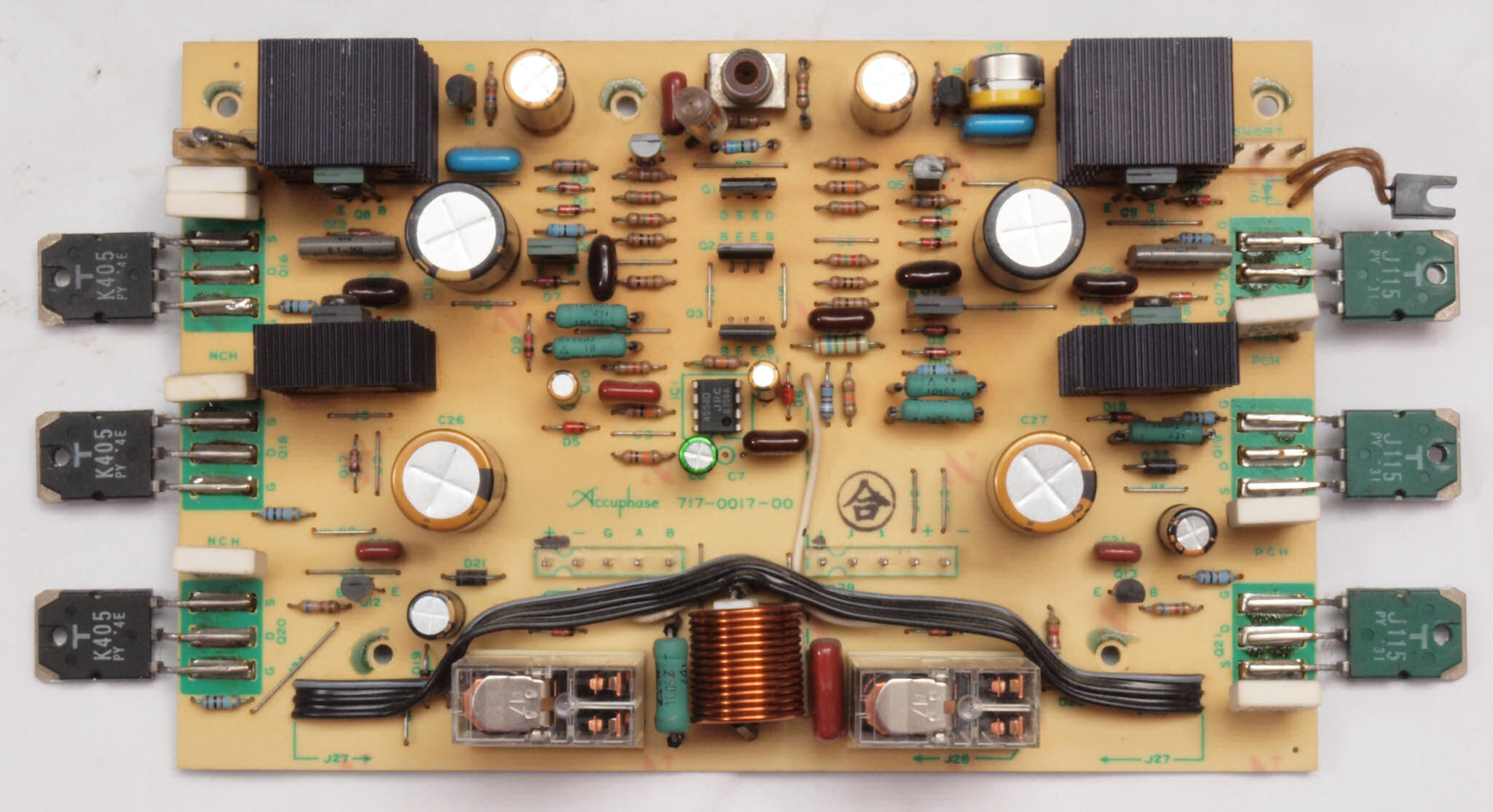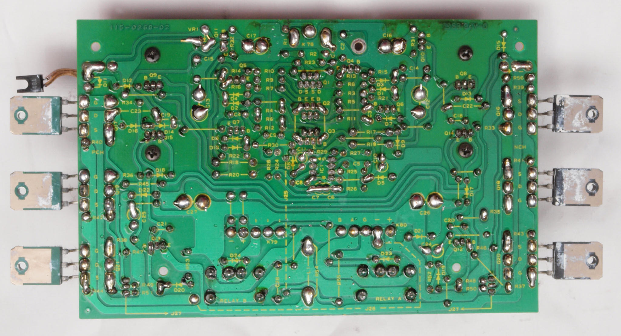 | C12. 修理後 右側終段基板。 電解コンデンサー11個、リレー2個、初段複合FET(電界効果トランジスター)1個、OP−AMP1個、テフロン絶縁シート6枚交換。 | ||||||||||||||||||||||||||||||||||||||||||||||||||||||||||||||||||||||||||||||||||||||