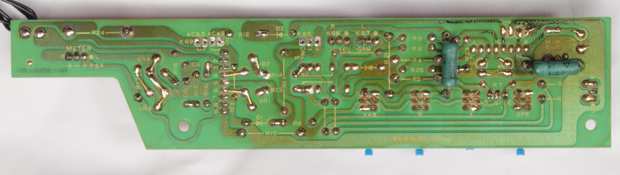 | CF2. 修理後 スピーカー選択SW/VUアンプ基板。 半固定VR4個、電解コンデンサー5個、抵抗2個交換。 | ||||||||||||||||||||||||||||||||||||||||||||||||||||||||||||||||||||||||||||||||||||||