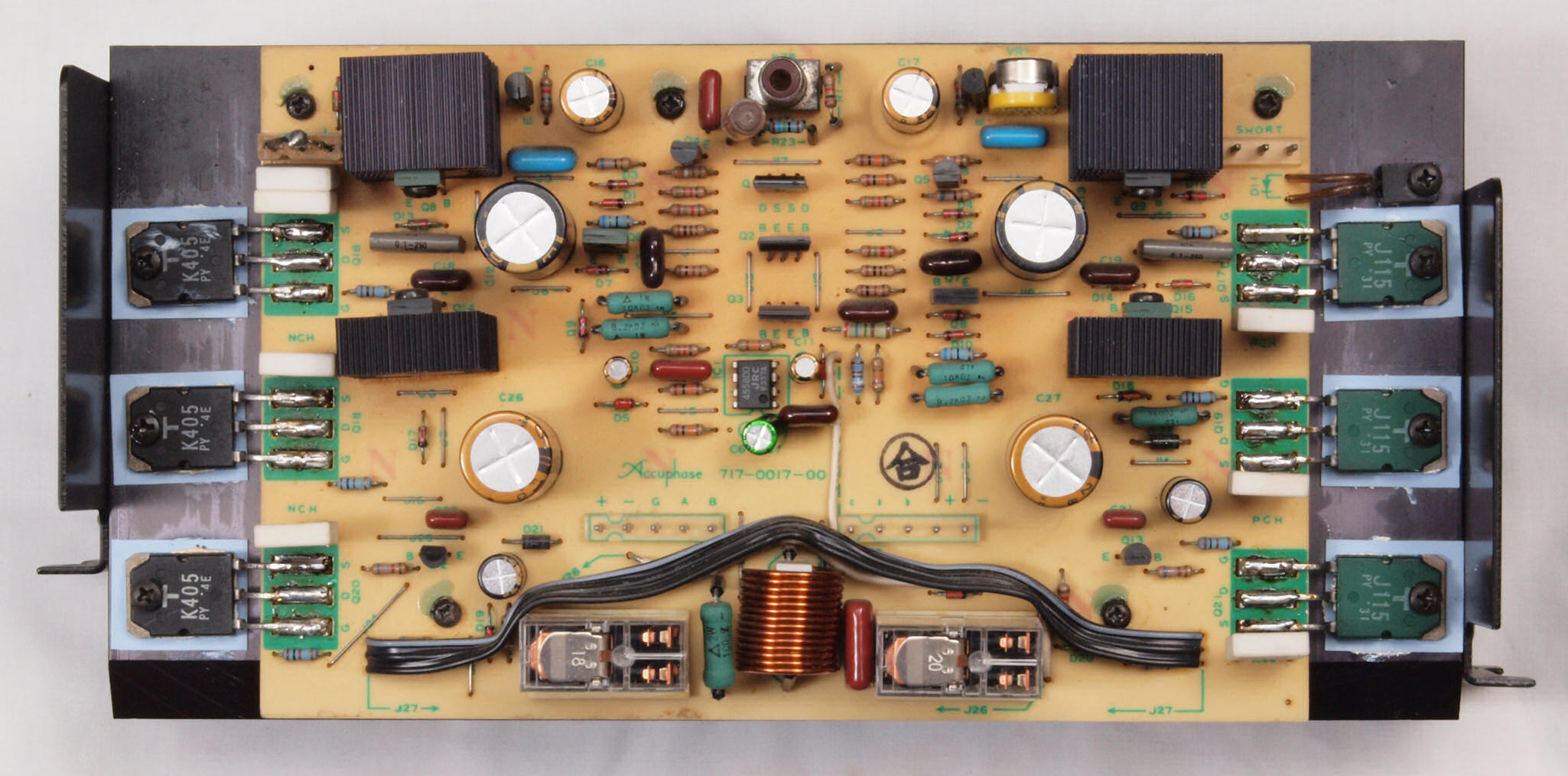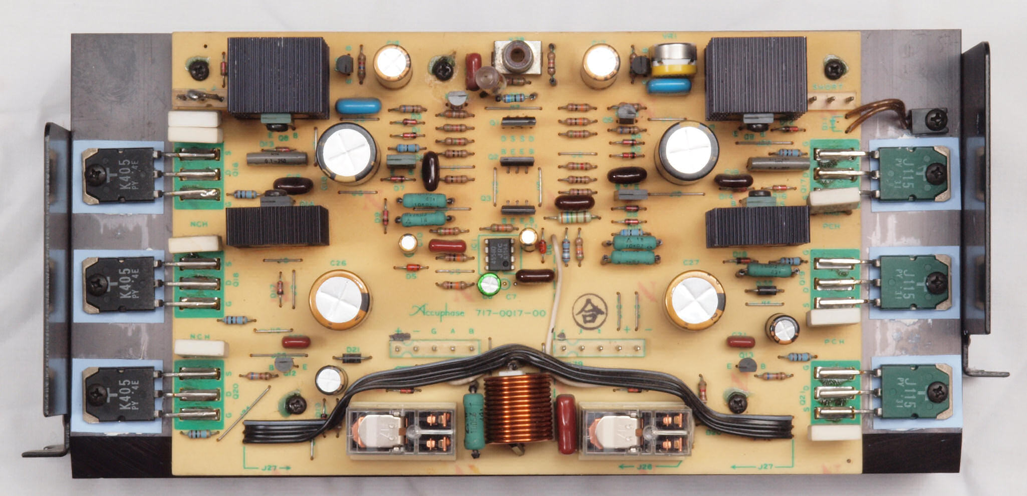 | C22. 修理後 左側終段基板。電解コンデンサー11個、リレー2個、初段複合FET(電界効果トランジスター)1個、OP−AMP1個、テフロン絶縁シート6枚交換。 | ||||||||||||||||||||||||||||||||||||||||||||||||||||||||||||||||||||||||||||||||||||||