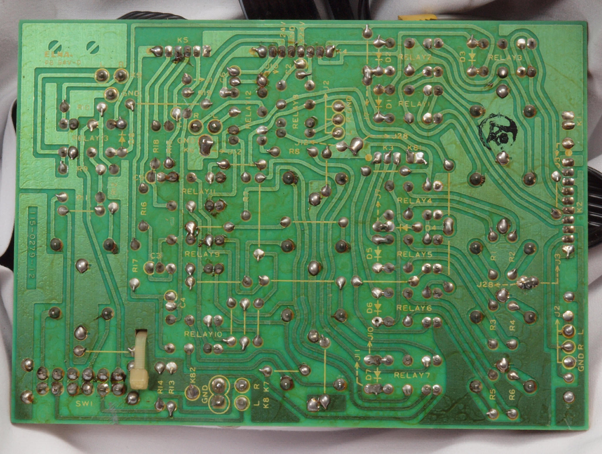 | CF3. 修理前 スピーカー選択SW/VUアンプ基板裏。 | ||||||||||||||||||||||||||||||||||||||||||||||||||||||||||||||||||||||||||||||||||||||