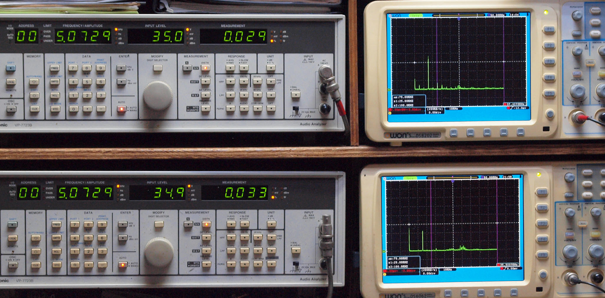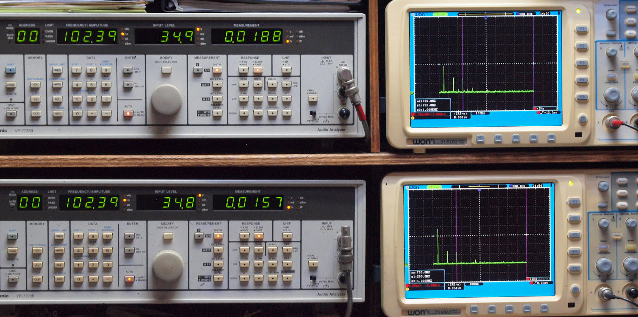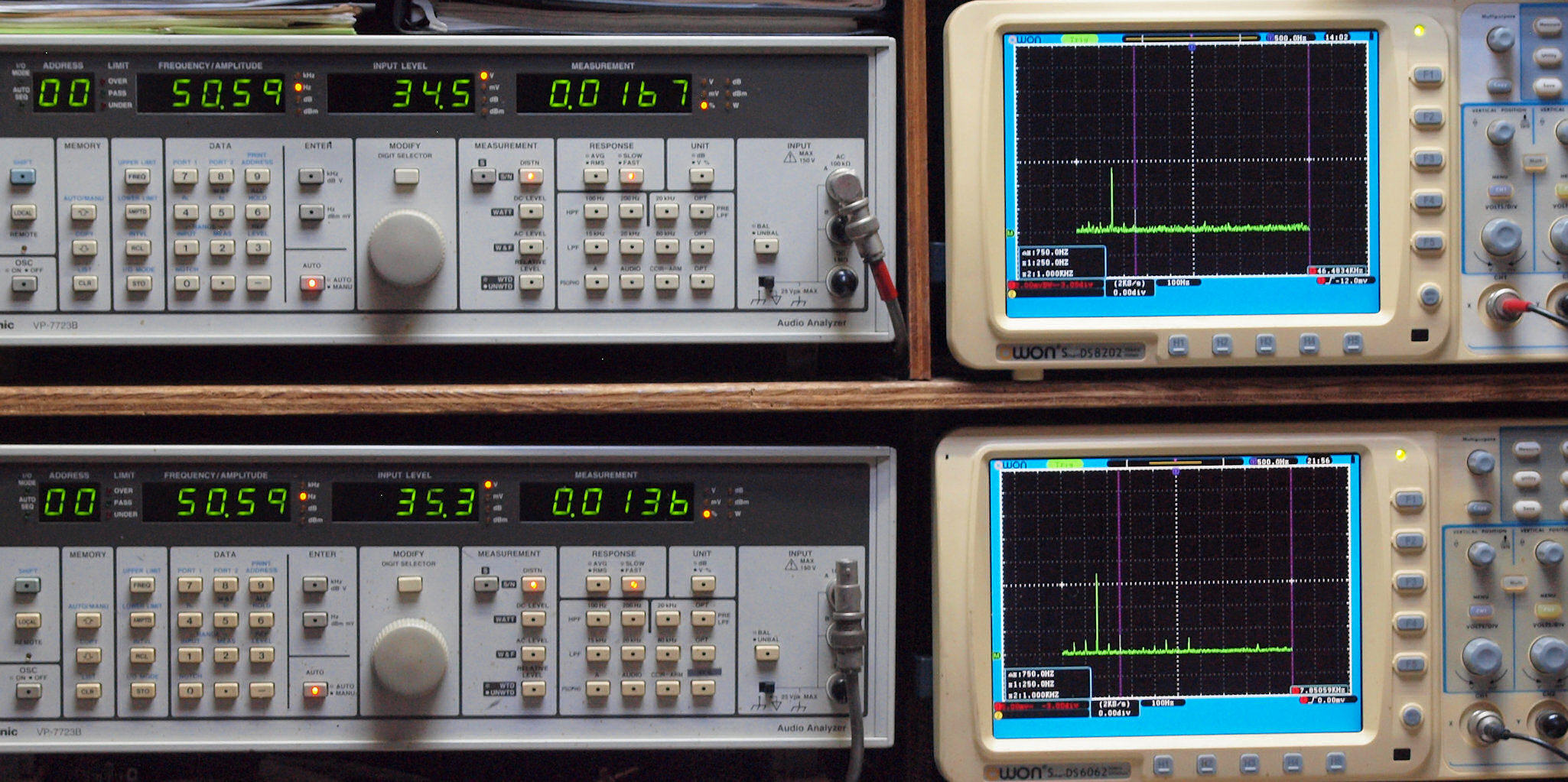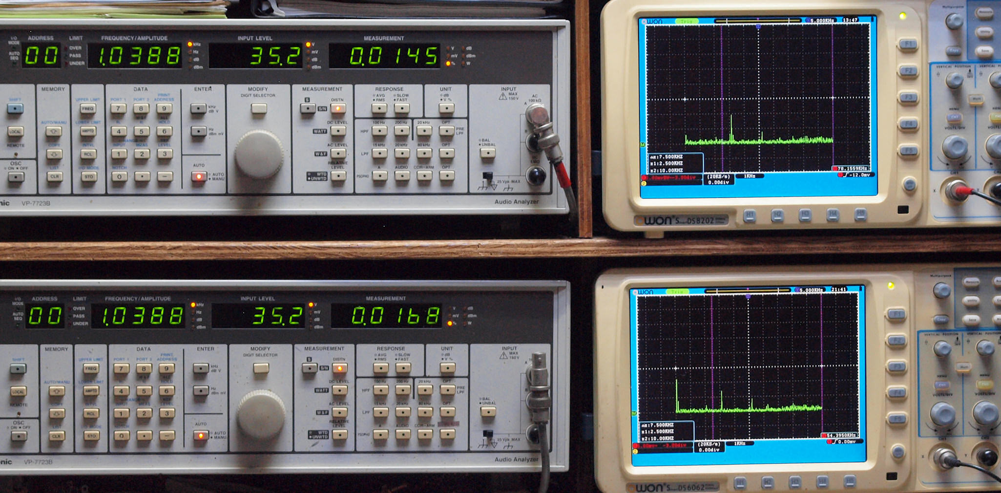 | E. 測定・調整。 画像をクリックすると、大きく(横幅2050ドット)表示されます。 E1. 出力・歪み率測定・調整 「見方」。 上段中 右側SP出力を「Audio Analyzer Panasonic VP−7723B」により測定。 表示LED、 左端=メモリーNo、 中左=周波数測定、 中右=出力電圧測定、 右端=歪み率測定。 上段右端 VP−7723Bの基本波除去出力を「owon SDS8202(200MHZ)」で「FFT分析」表示。 下段中 左側SP出力を「Audio Analyzer Panasonic VP−7723B」により測定。 表示LED、 左端=メモリーNo、 中左=周波数測定、 中右=出力電圧測定、 右端=歪み率測定。 下段右端 VP−7723Bの基本波除去出力を「owon SDS6062(200MHZ)」で「FFT分析」表示。 下段左端 オーディオ発振器 VP−7201A より50Hz〜100kHzの信号を出し(歪み率=約0.003%)、ATT+分配器を通し、AMPに入力。 よって、ダイアル設定出力レベルより低くなります。測定機器の仕様や整備の様子はこちら、「VP−7723B」「VP−7201A」。 FFT画面の見方はこちら。 |