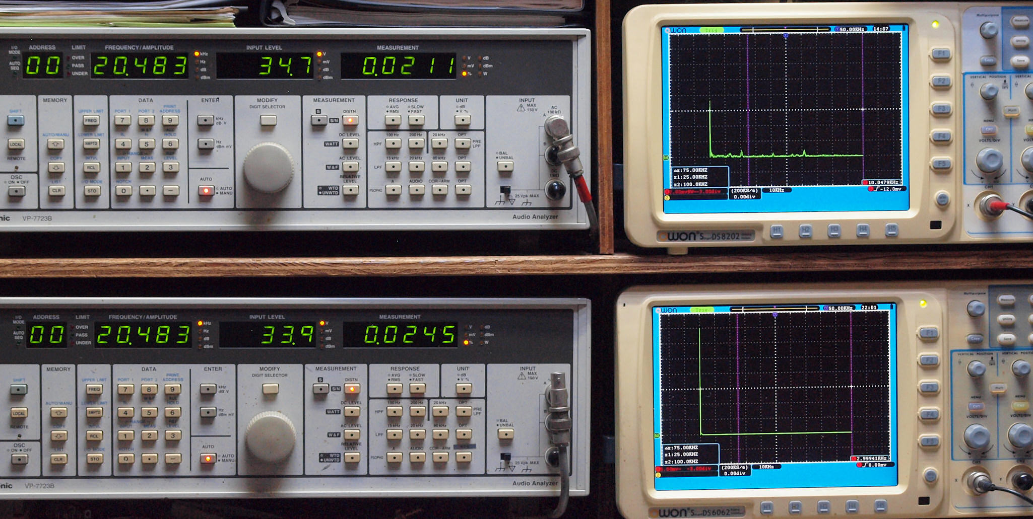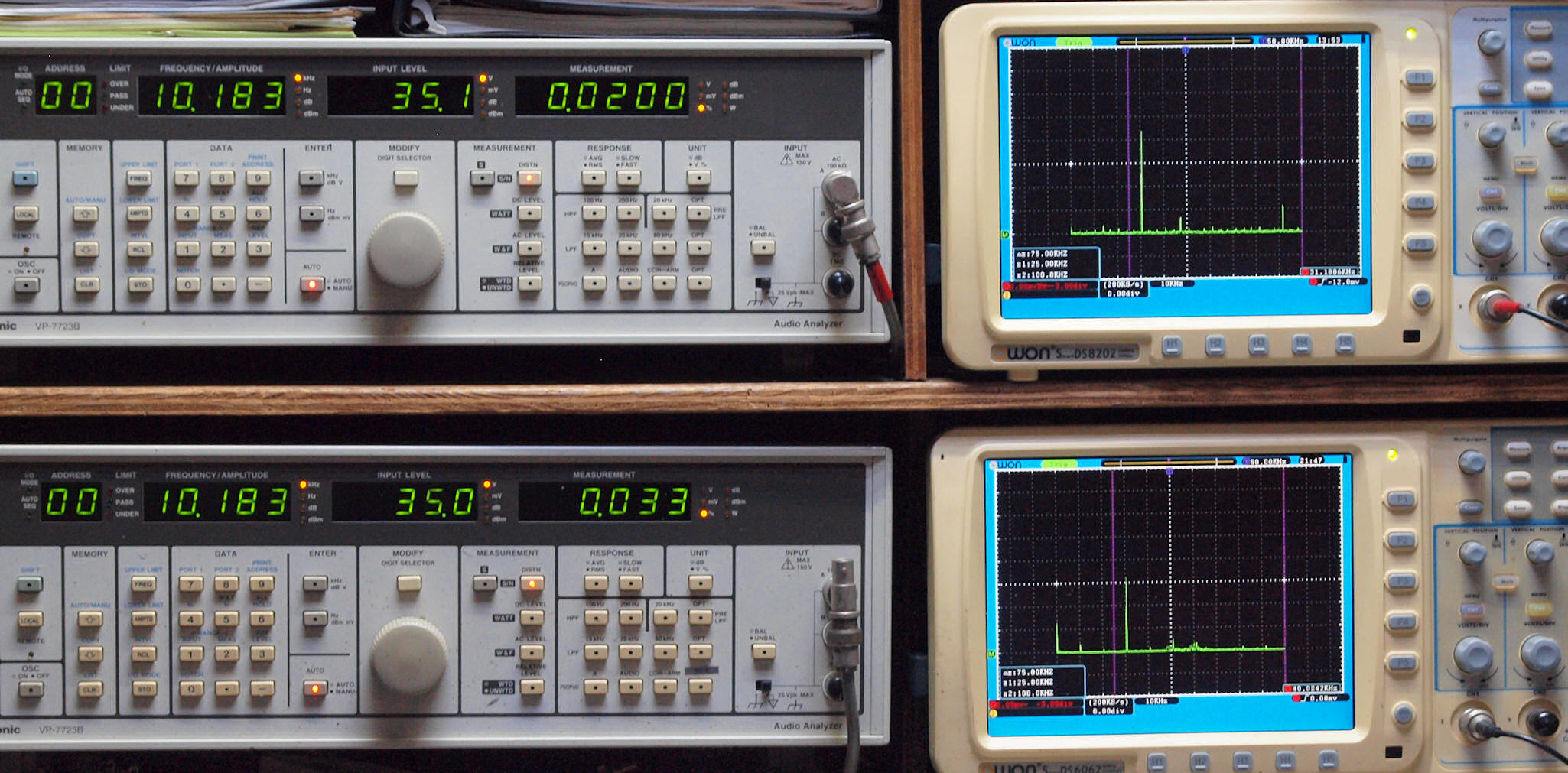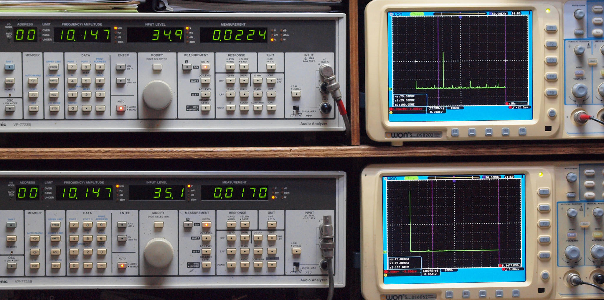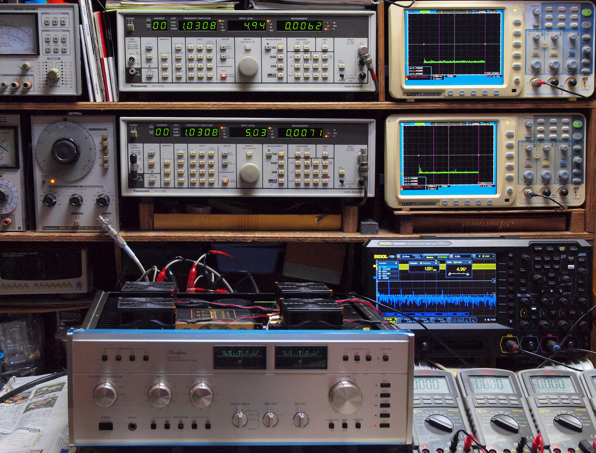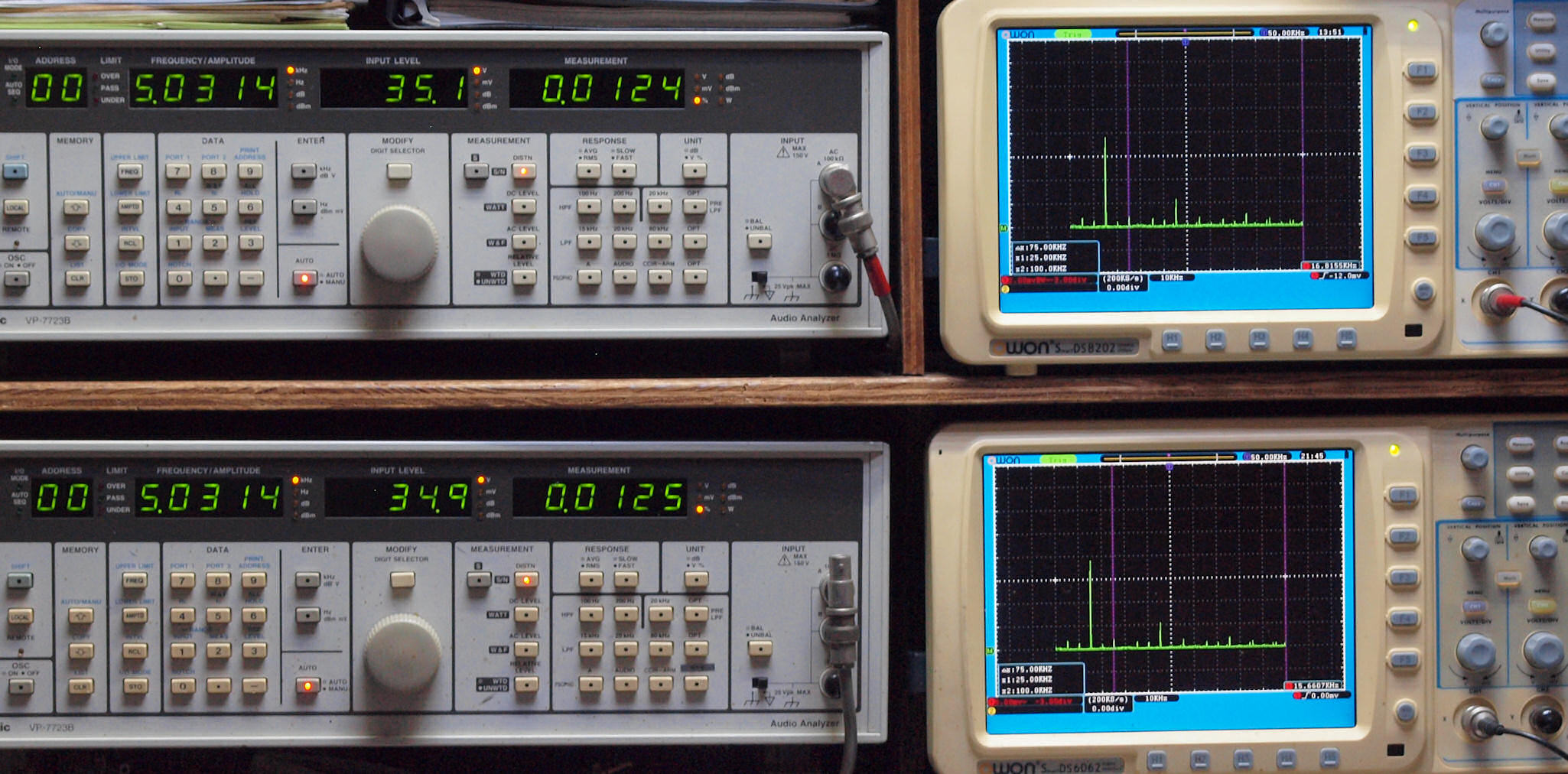 | E. 測定・調整。 画像をクリックすると、大きく(横幅2050ドット)表示されます。 E1. 出力・歪み率測定・調整 「見方」。 上段中 右側SP出力を「Audio Analyzer Panasonic VP−7723B」により測定。 表示LED、 左端=メモリーNo、 中左=周波数測定、 中右=出力電圧測定、 右端=歪み率測定。 上段右端 VP−7723Bの基本波除去出力を「owon SDS8202(200MHZ)」で「FFT分析」表示。 下段中 左側SP出力を「Audio Analyzer Panasonic VP−7723B」により測定。 表示LED、 左端=メモリーNo、 中左=周波数測定、 中右=出力電圧測定、 右端=歪み率測定。 下段右端 VP−7723Bの基本波除去出力を「owon SDS6062(200MHZ)」で「FFT分析」表示。 下段左端 オーディオ発振器 VP−7201A より50Hz〜100kHzの信号を出し(歪み率=約0.003%)、ATT+分配器を通し、AMPに入力。 よって、ダイアル設定出力レベルより低くなります。測定機器の仕様や整備の様子はこちら、「VP−7723B」「VP−7201A」。 FFT画面の見方はこちら。 |