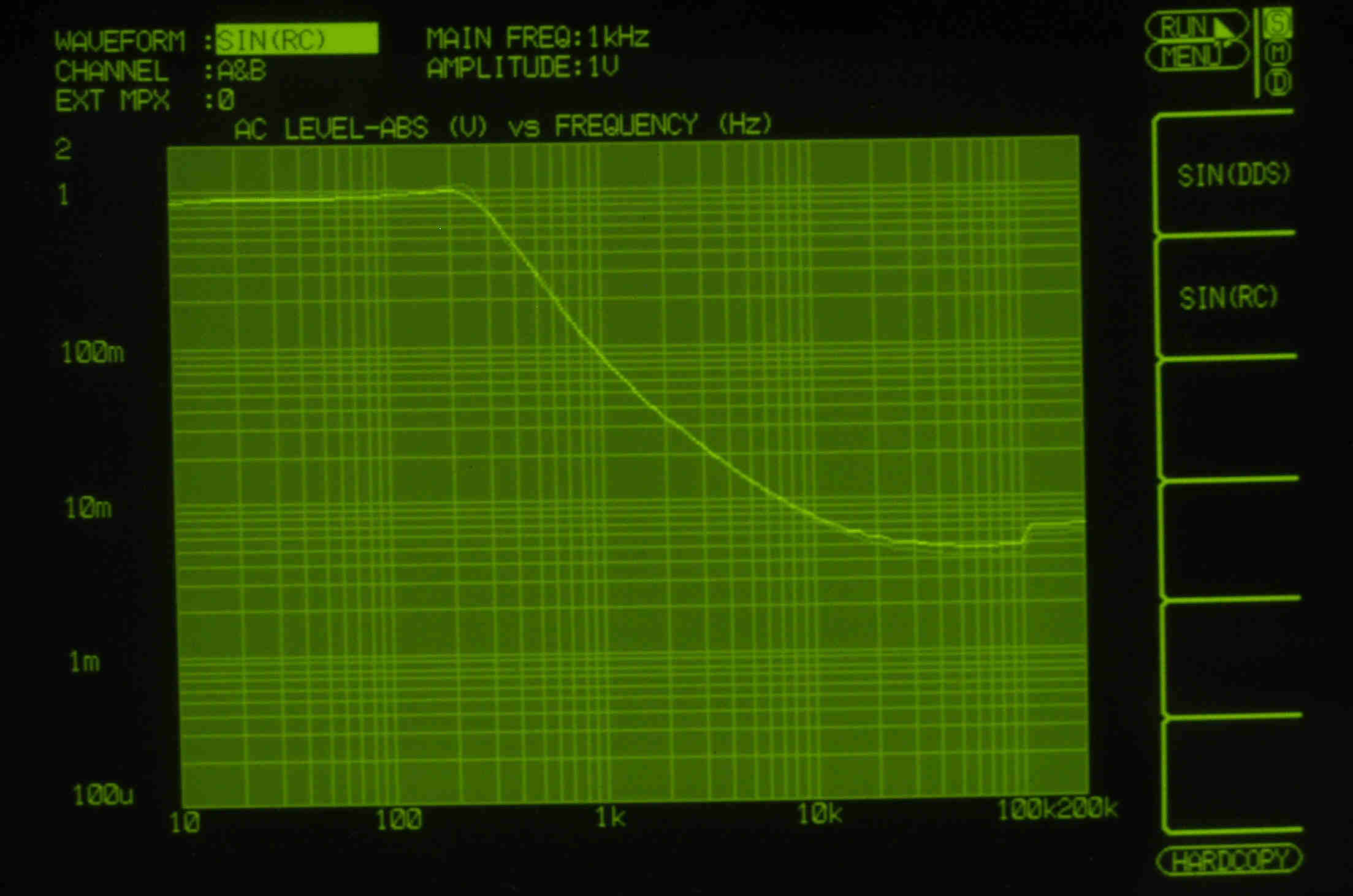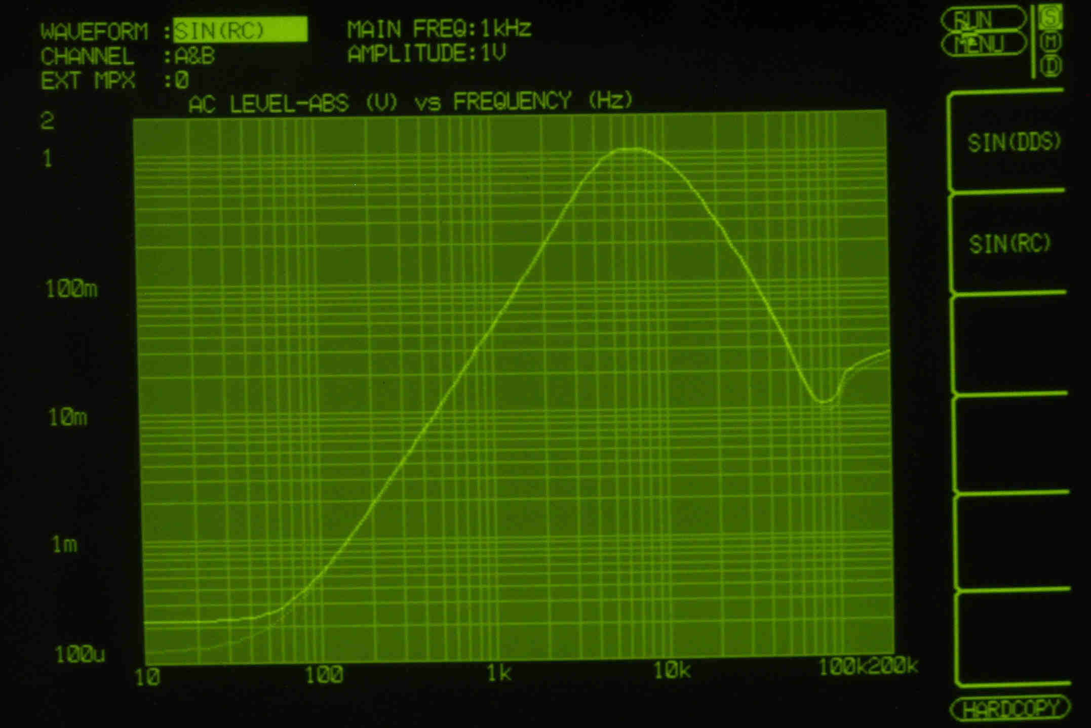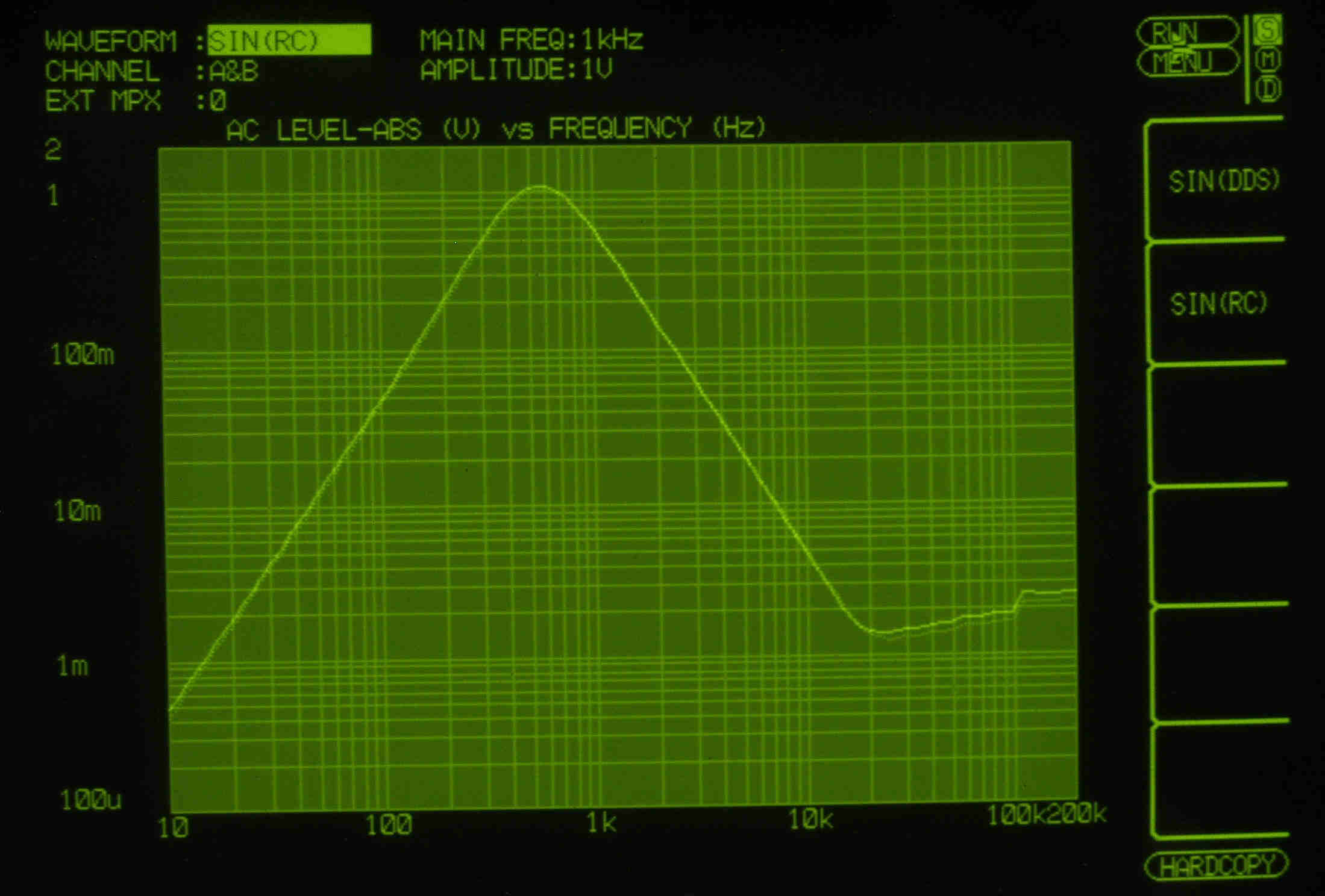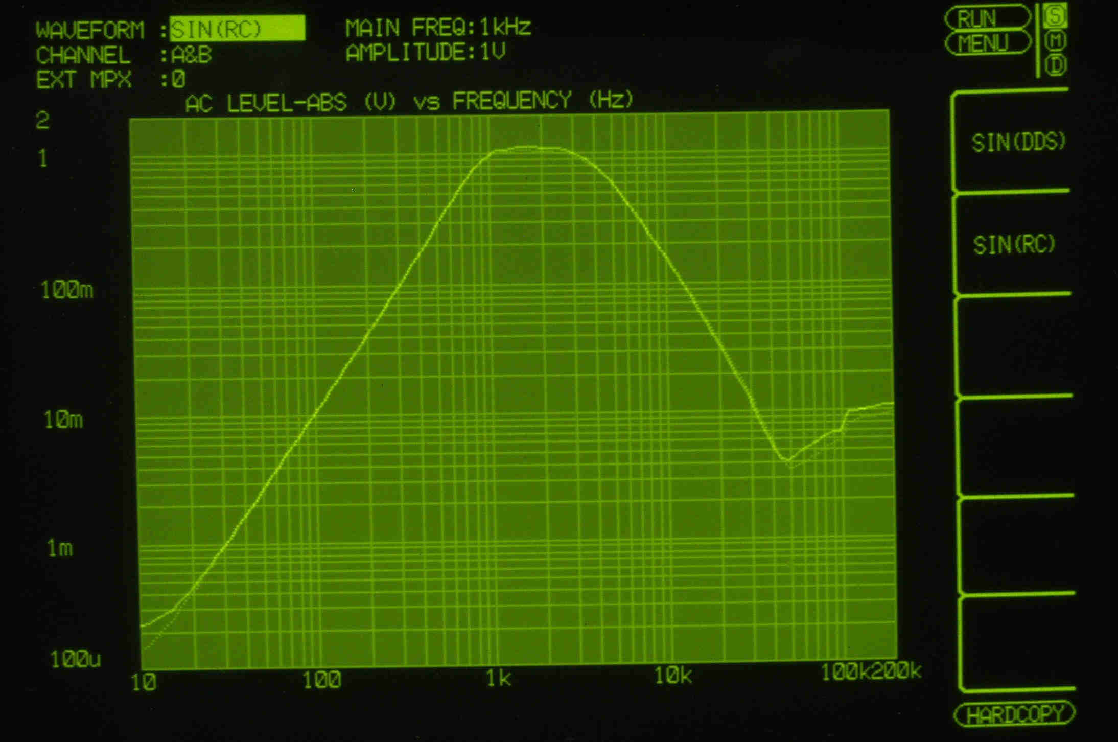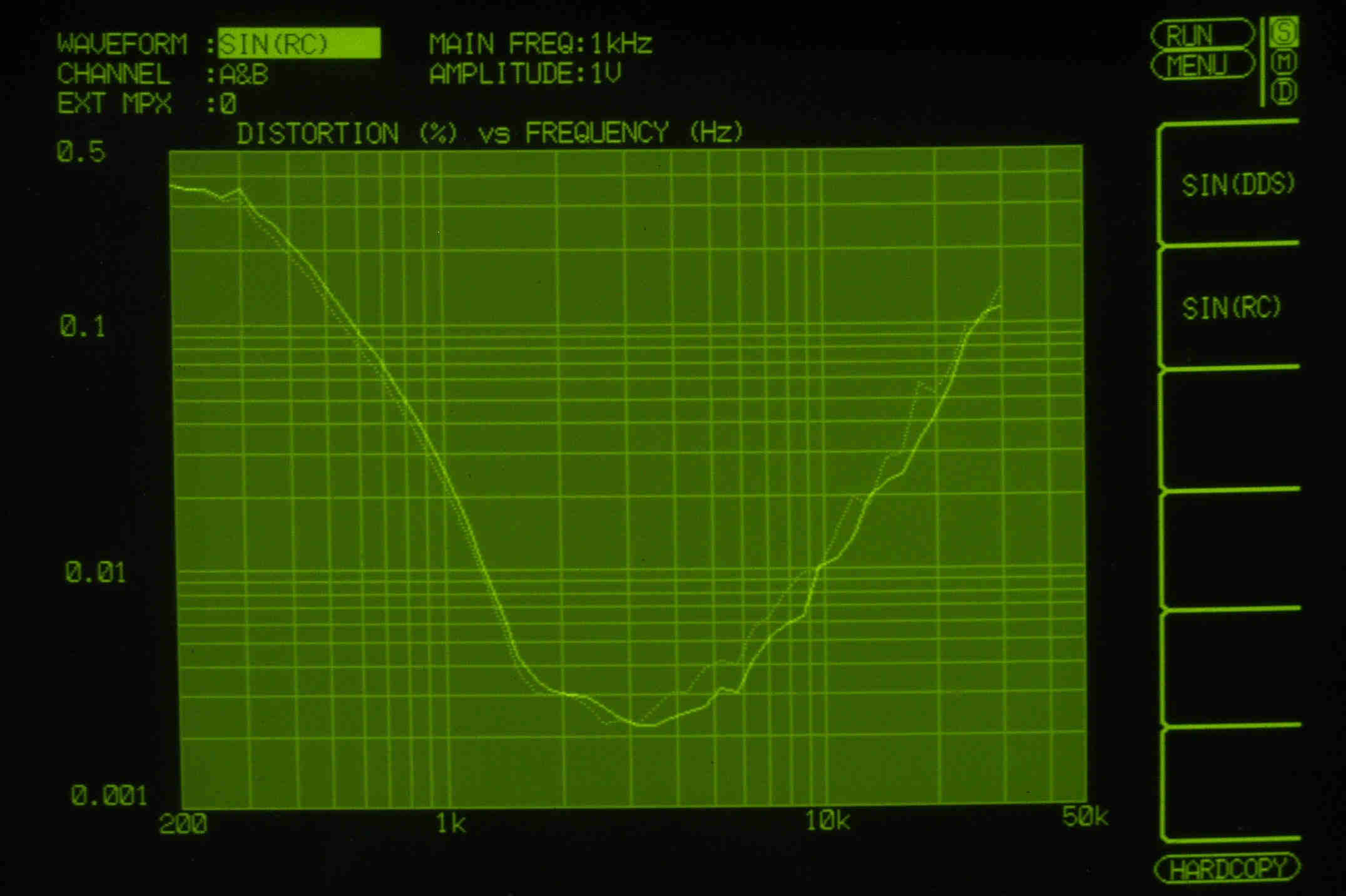 | EE33. 歪み測定チャネ3、入力電圧=1V一定入力、VRはmax、左出力=薄(細い)色 右出力=濃い(太い)色 200HZ以下及び、30KHZ以上は入力レベルが測定以下になる為、表示出来ない。 |