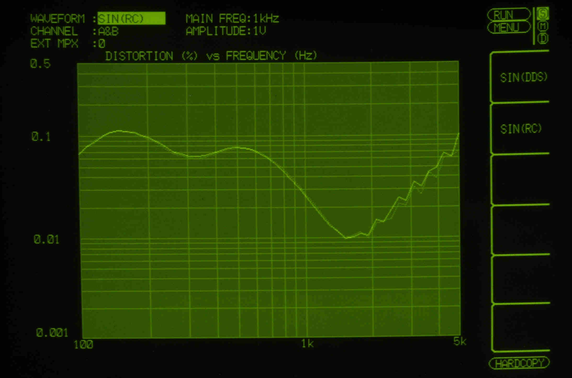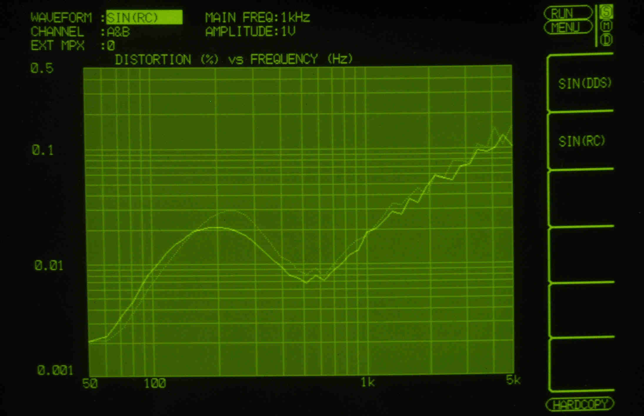 | EE32. 歪み測定チャネ2、入力電圧=1V一定入力、VRはmax、左出力=薄(細い)色 右出力=濃い(太い)色 100HZ以下及び、5KHZ以上は入力レベルが測定以下になる為、表示出来ない。 |