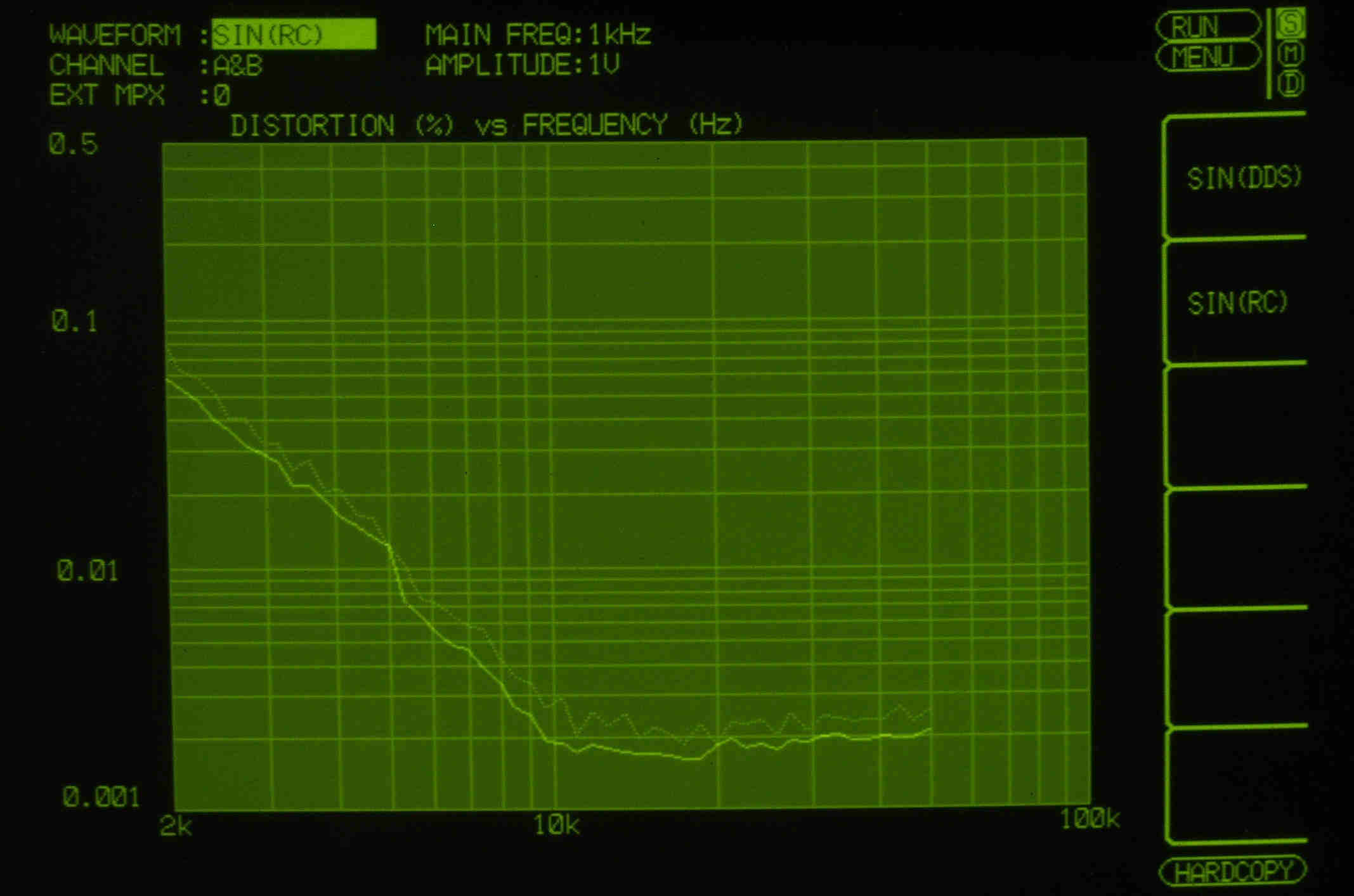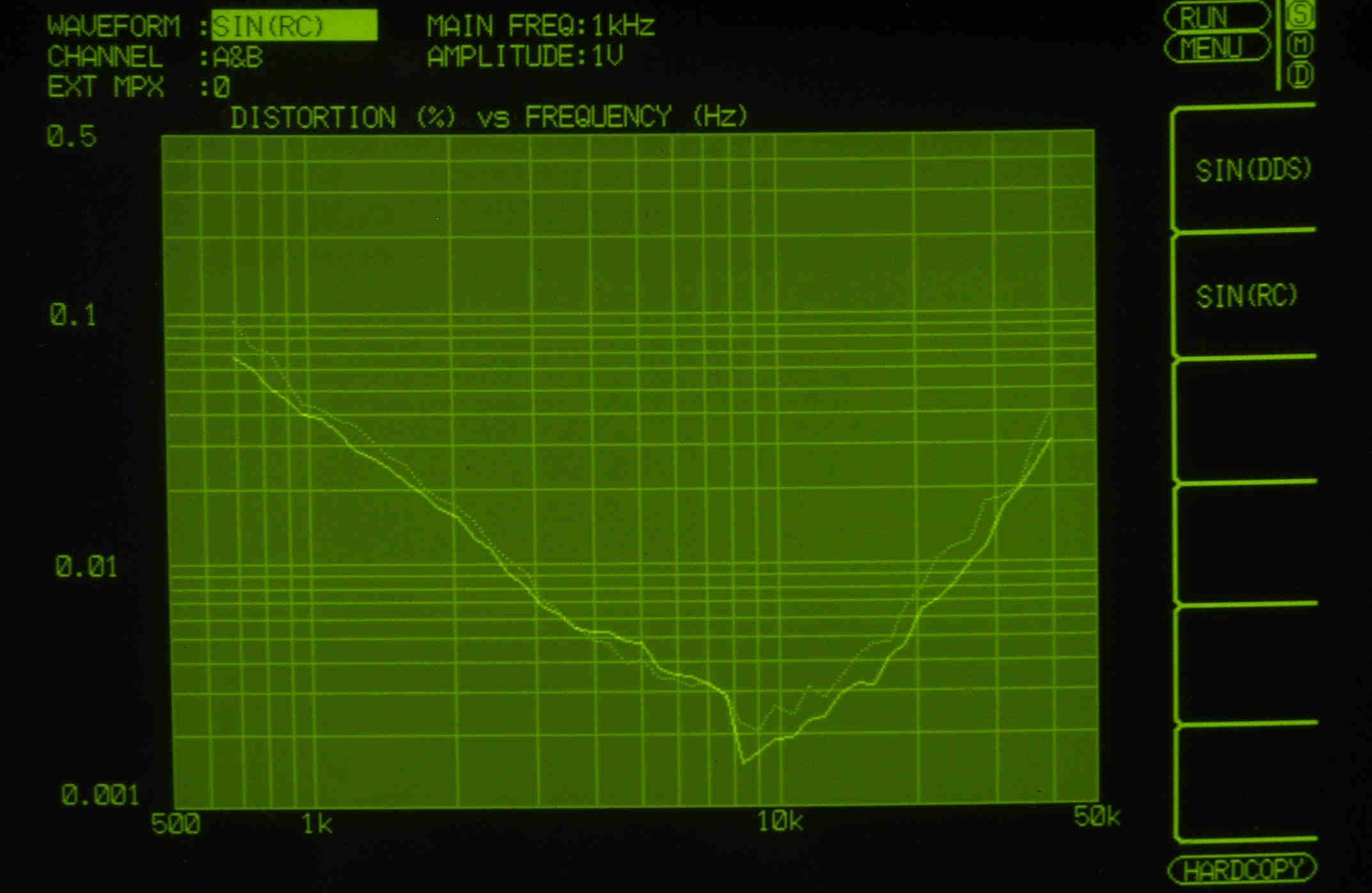 | EE31. 歪み測定チャネ1、入力電圧=1V一定入力、VRはmax、左出力=薄(細い)色 右出力=濃い(太い)色 5KHZ以上は入力レベルが測定以下になる為、表示出来ない。 |