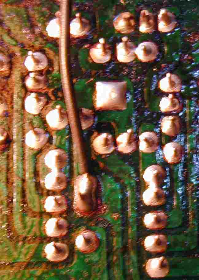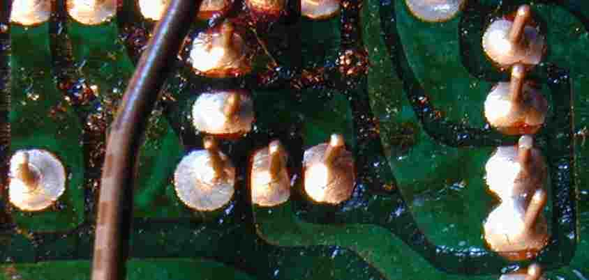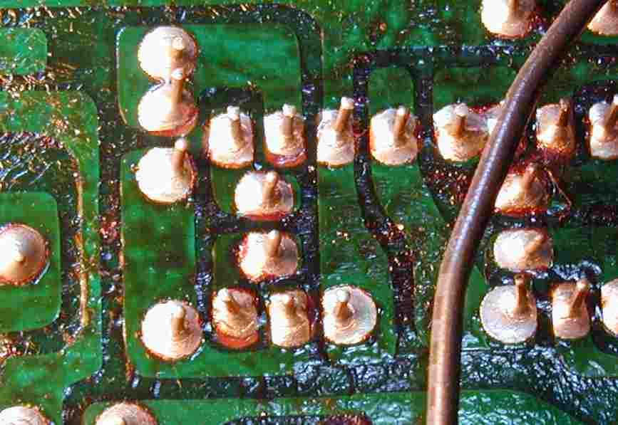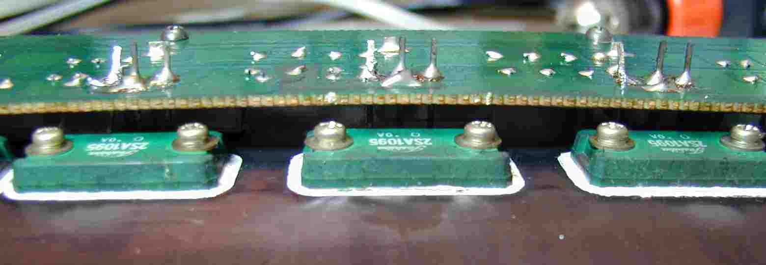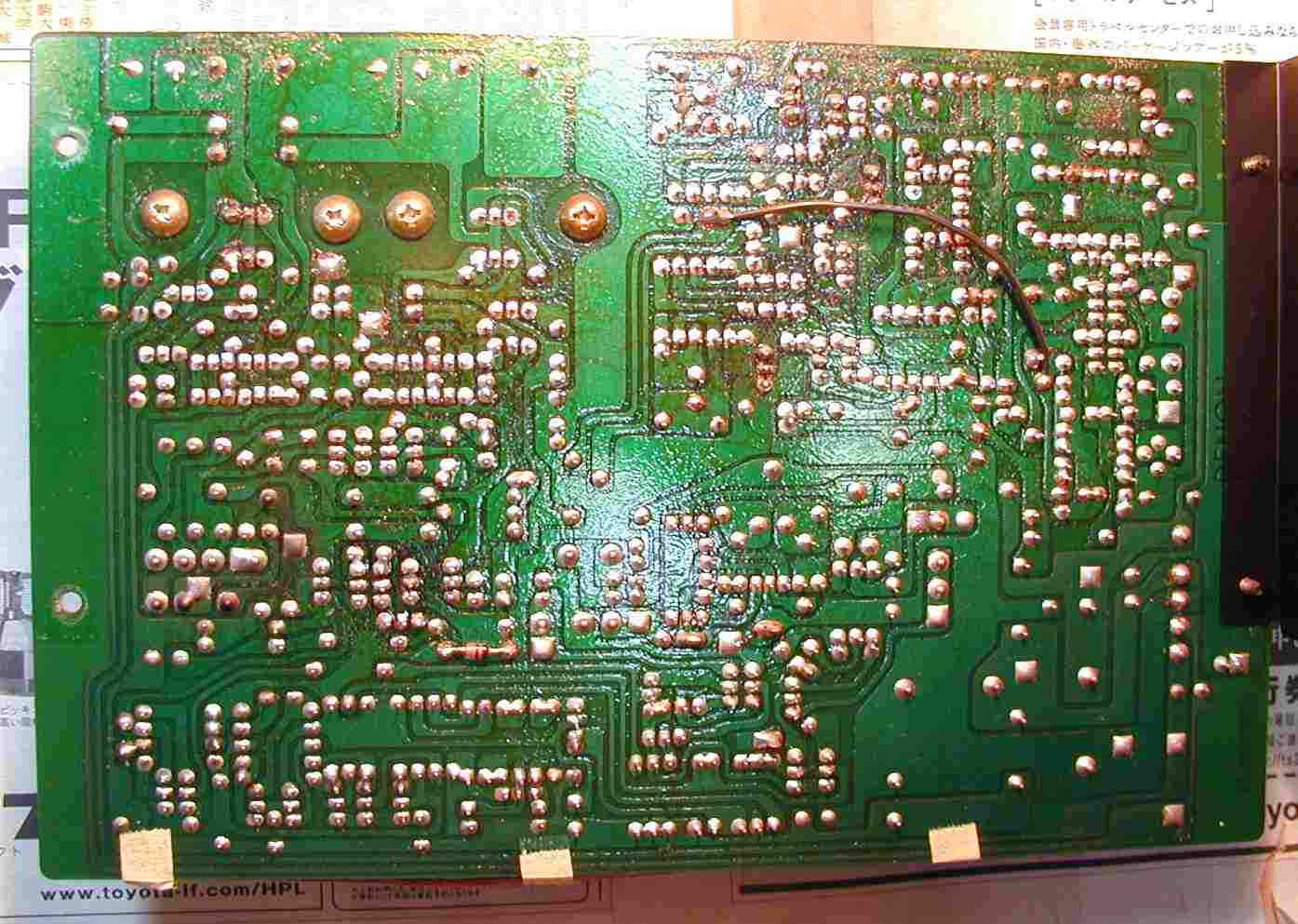 | 5. ドライブ基板の裏=プリント面、ハンダ不良多数。 終段TR(トランジスター)の焼損の熱でハンダ不良に成ったか、 此方が原因で終段TR(トランジスター)が焼損したか未確定 |