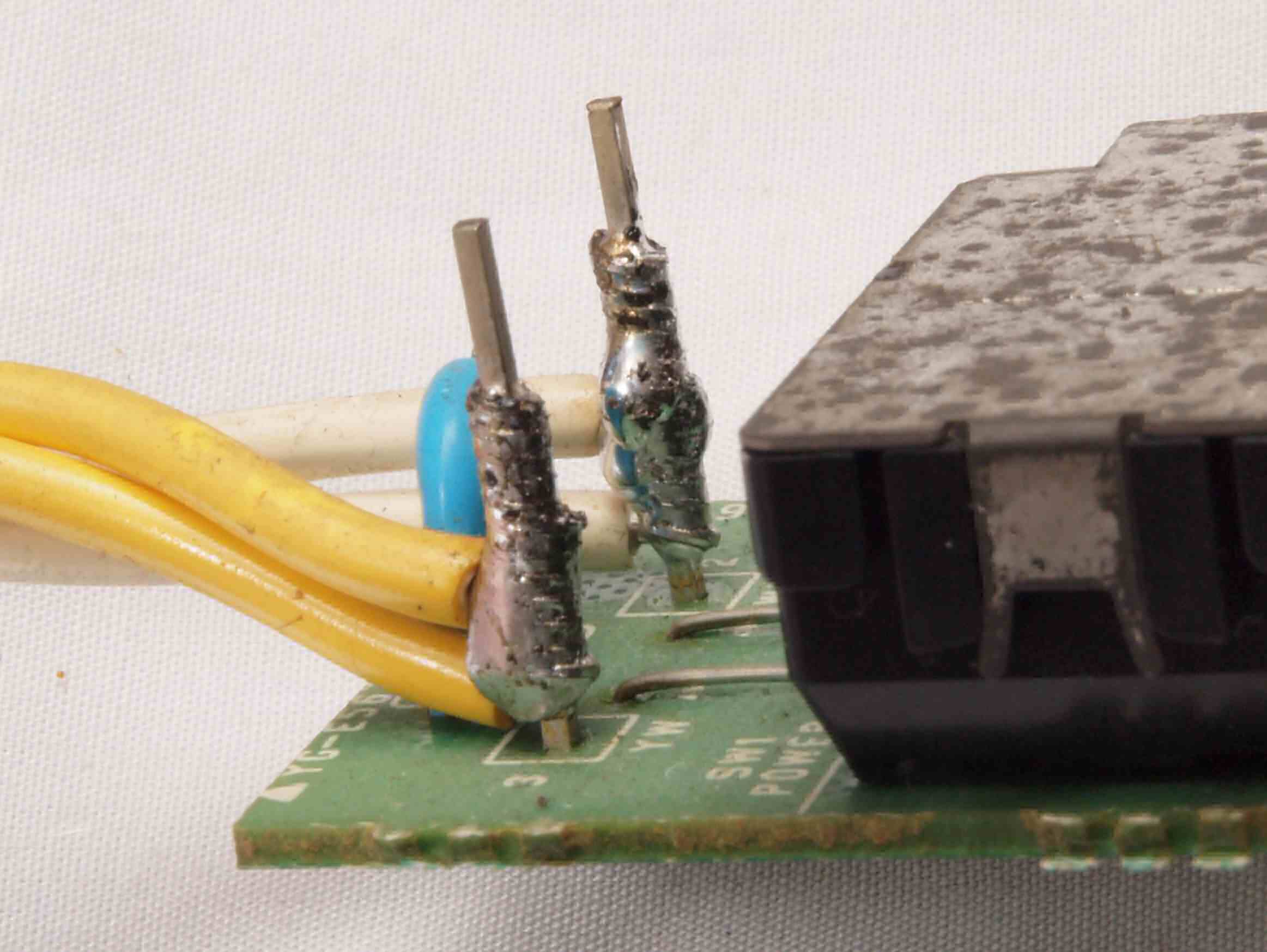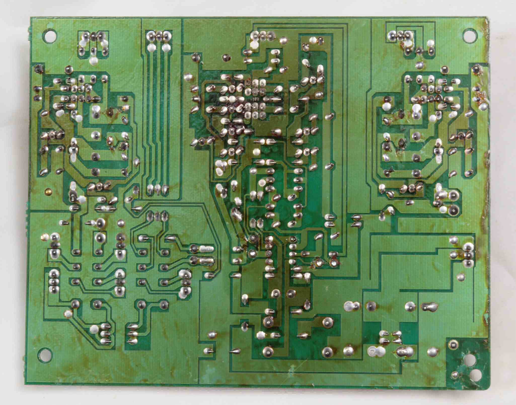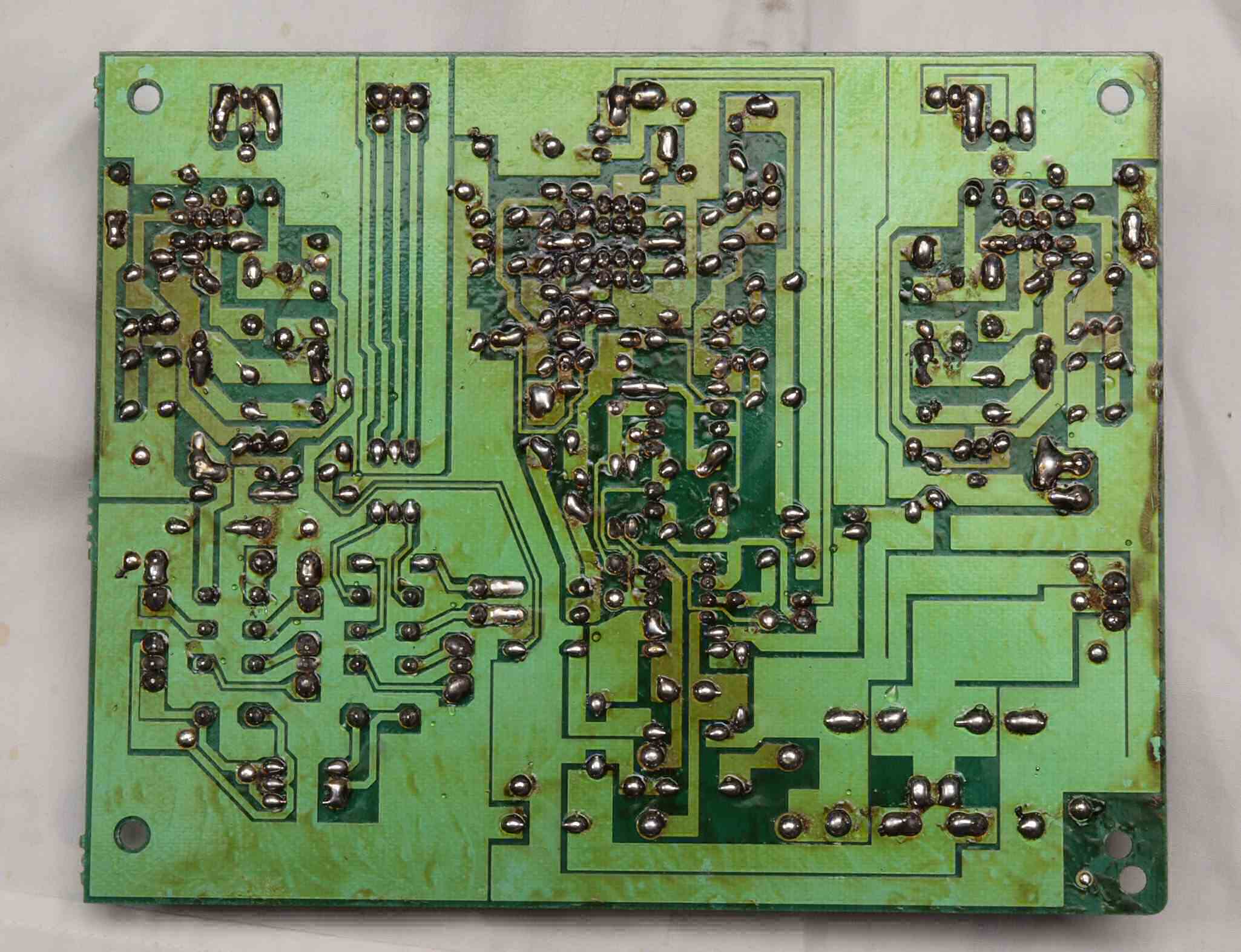 | CF5. 修理前 突入電源抑制回路基板裏。 抵抗とリレーが交換してあるが汚い半田付け! | ||||||||||||||||||||||||||||||||||||||||||||||