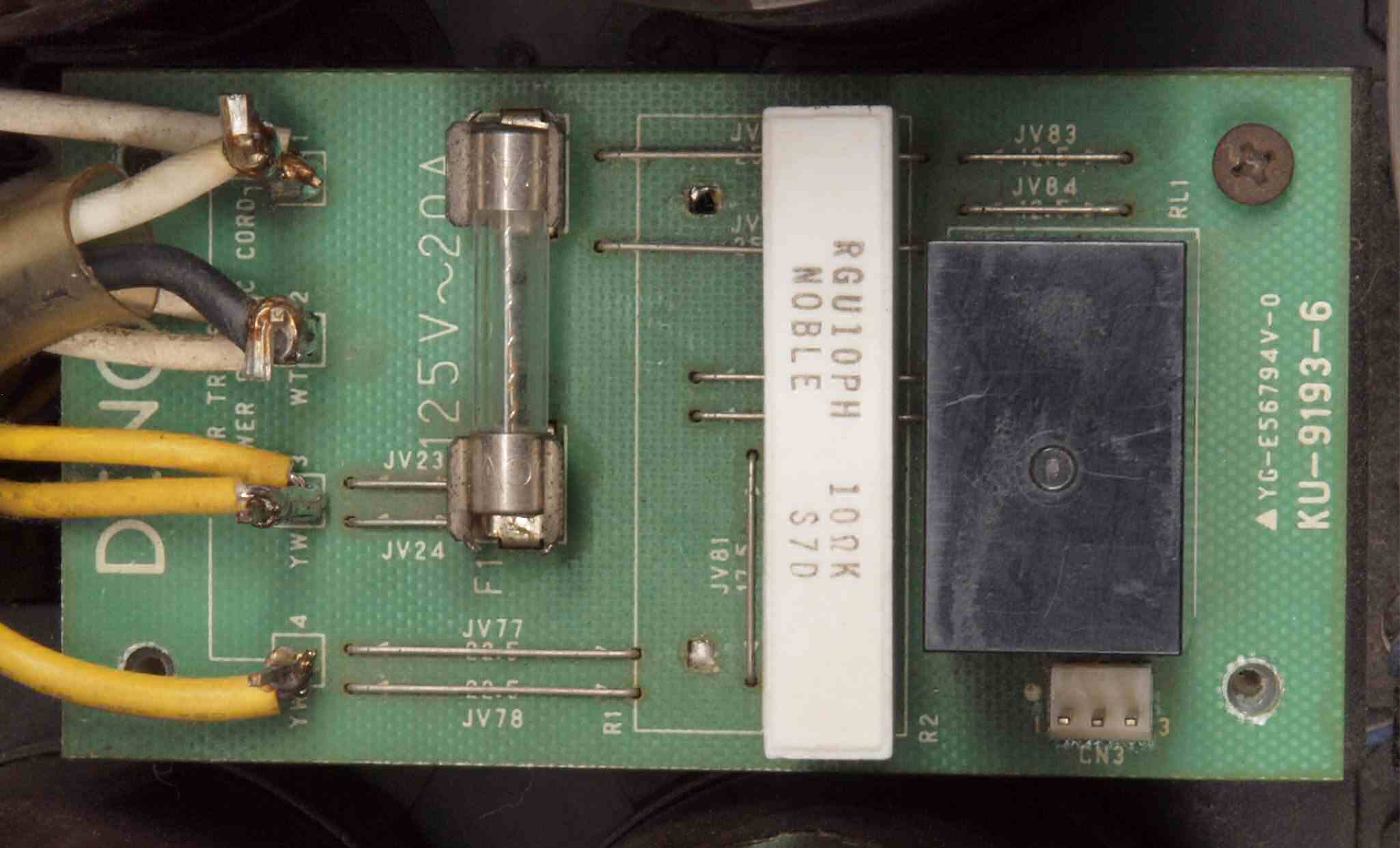 | CF1. 修理前 突入電源抑制回路基板。 抵抗が1本になっている! | ||||||||||||||||||||||||||||||||||||||||||||||
