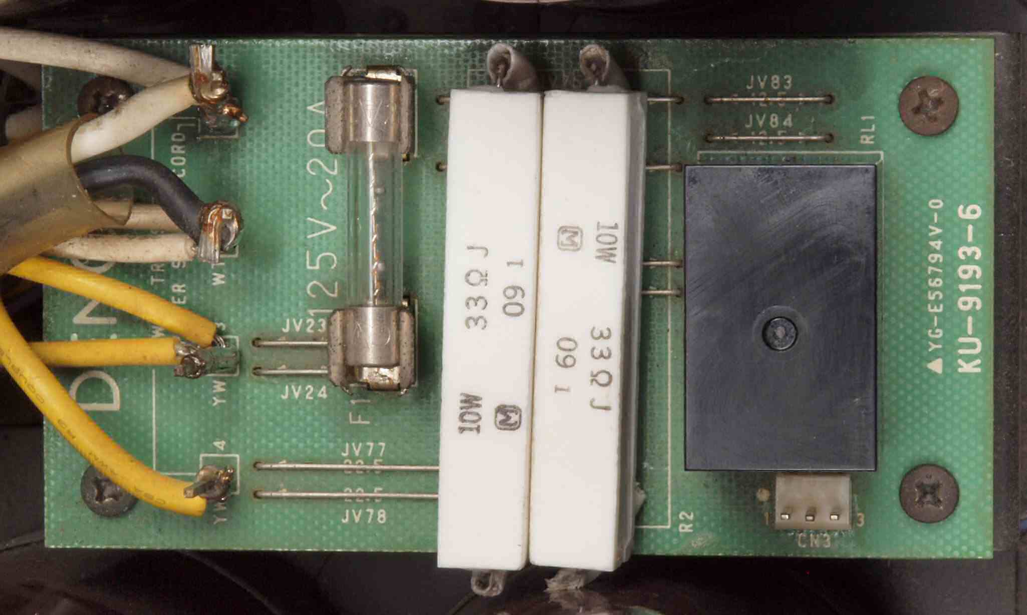 | CF2. 修理後 突入電源抑制回路基板。リレー1個、抵抗2本交換 | ||||||||||||||||||||||||||||||||||||||||||||||