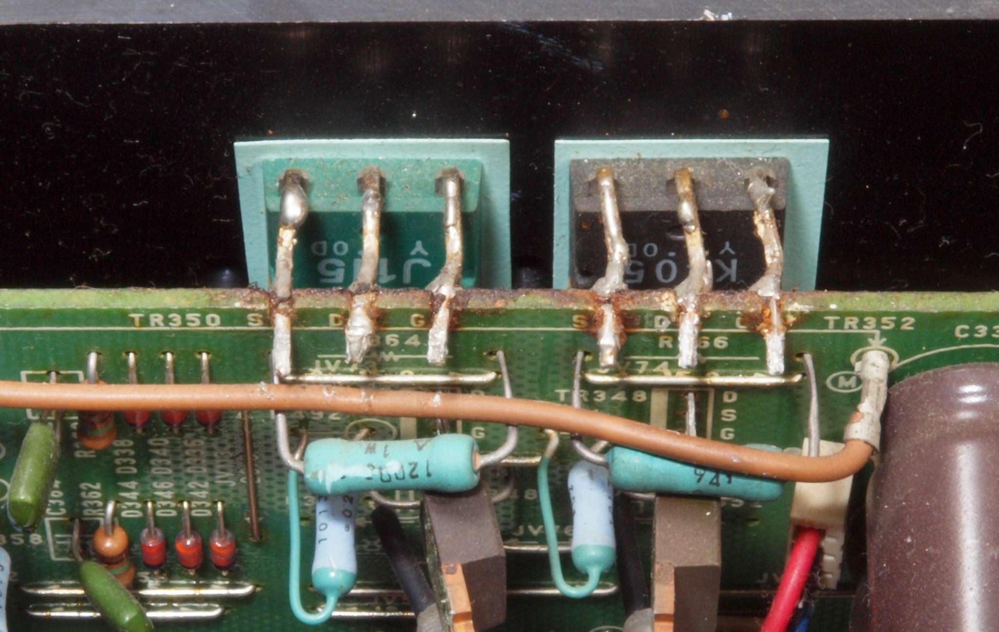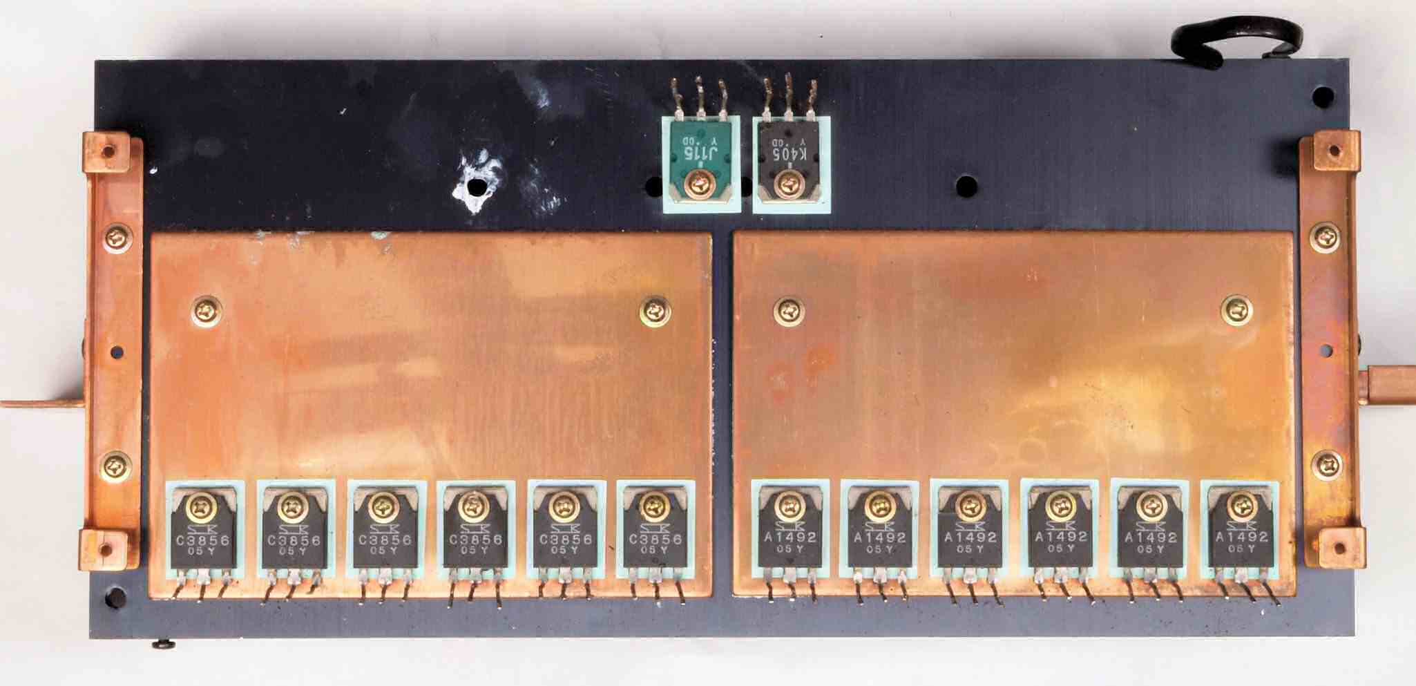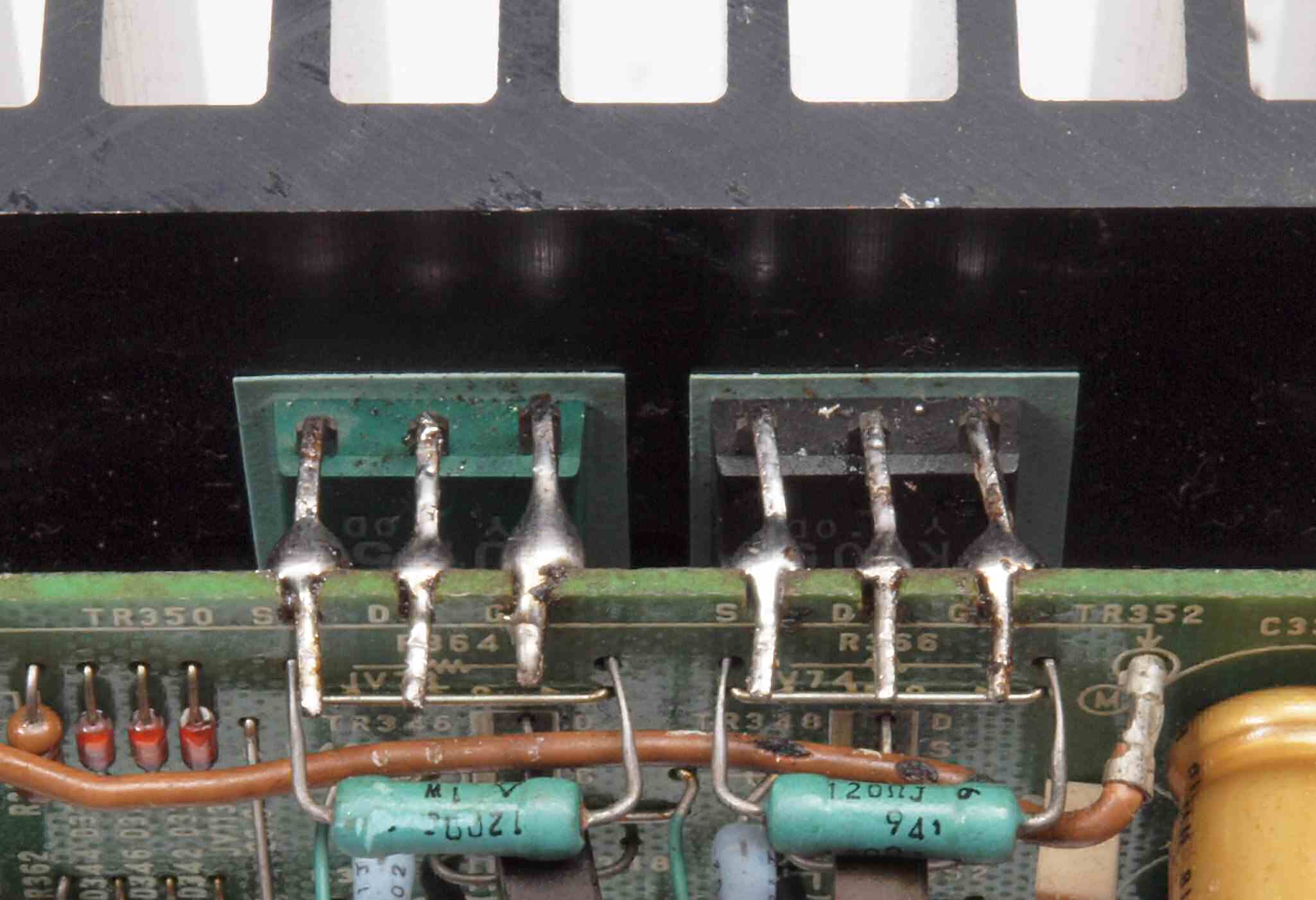 | C45. 修理中 右側終段TR(トランジスター)、ドライブFET(電界効果トランジスター)。 右側終段TR(トランジスター)ロット番号2SC3856/05Y、2SA1492/05Y 左側終段TR(トランジスター)ロット番号2SC3856/12Y、2SA1492/13Y |