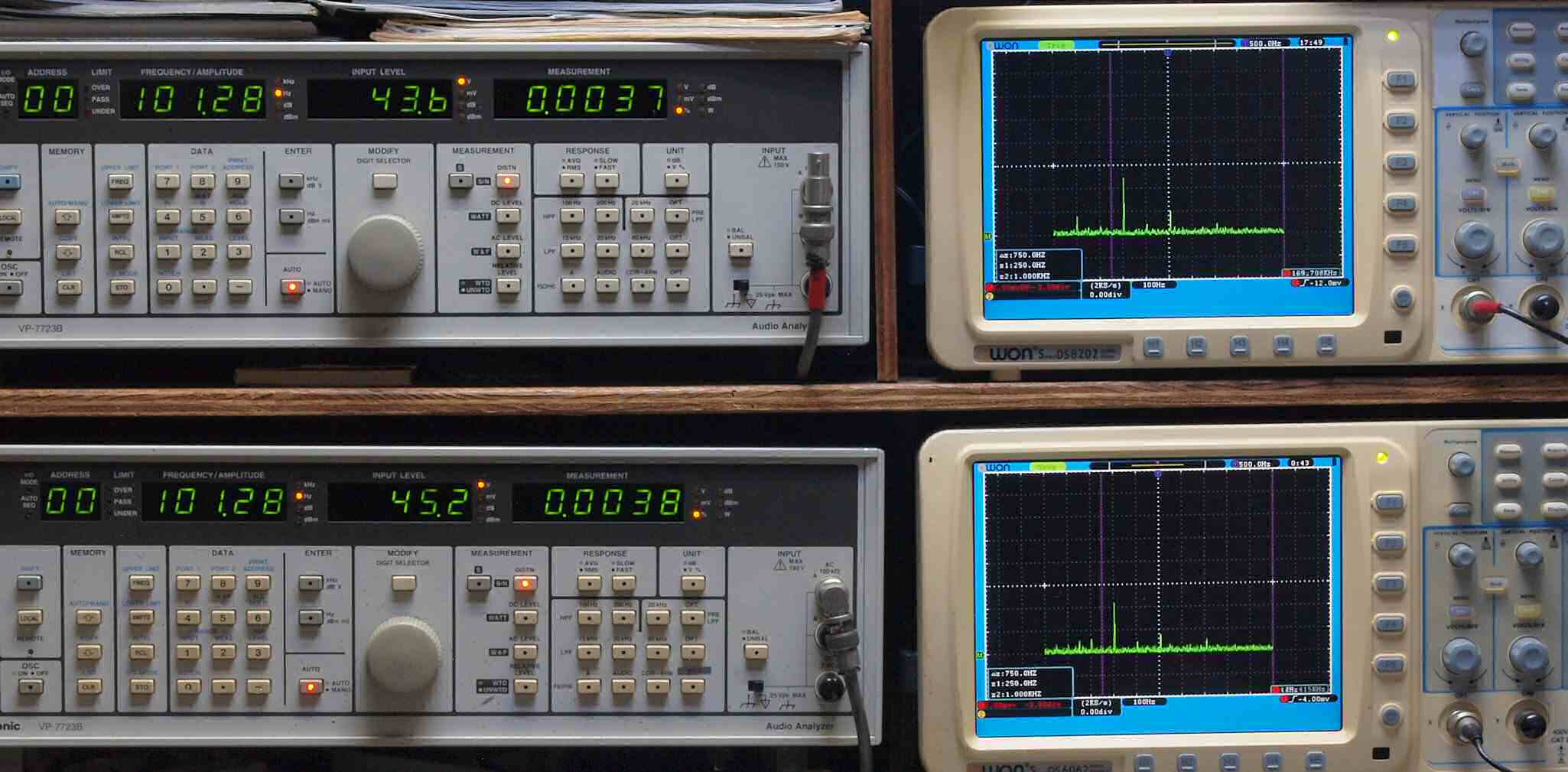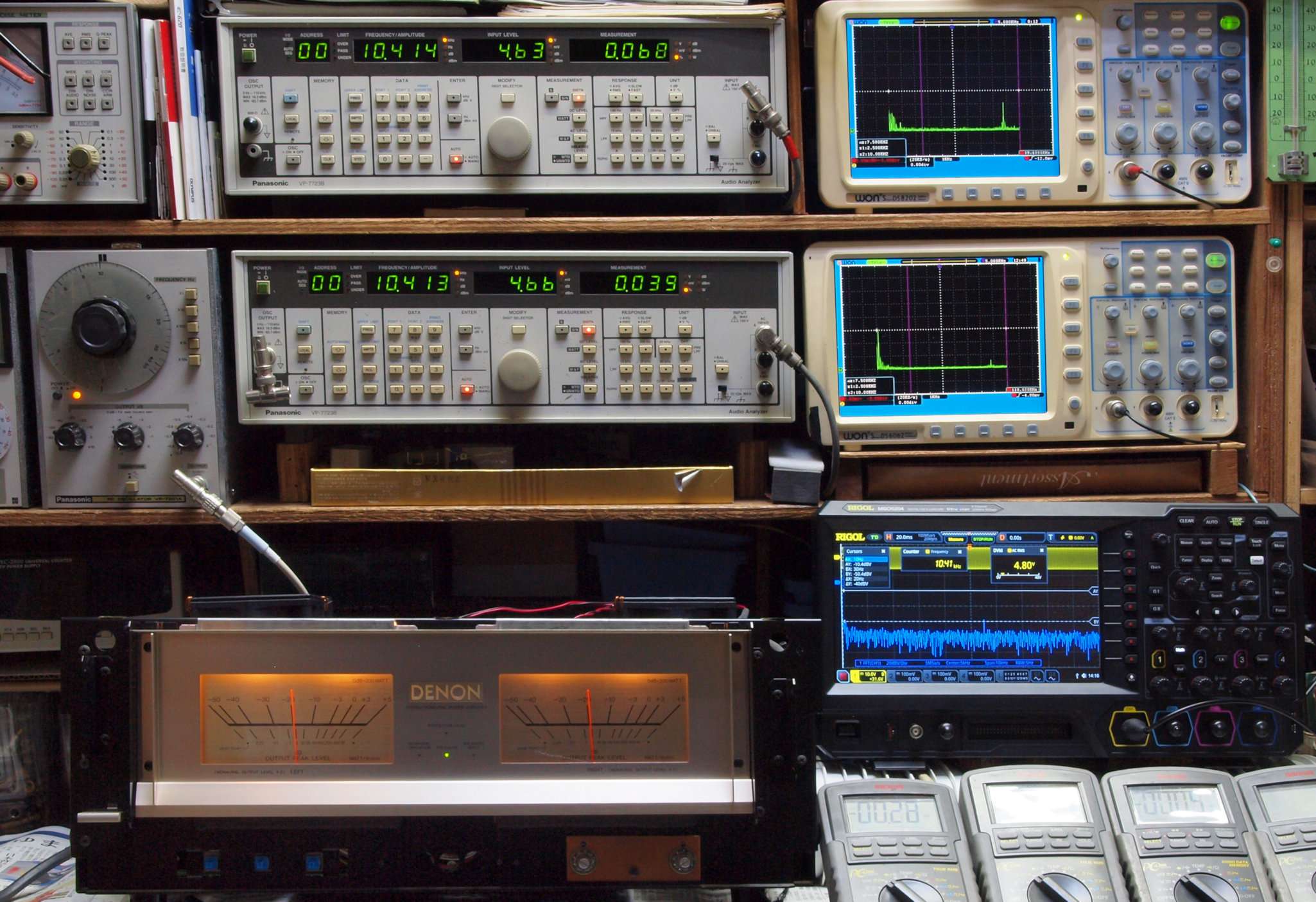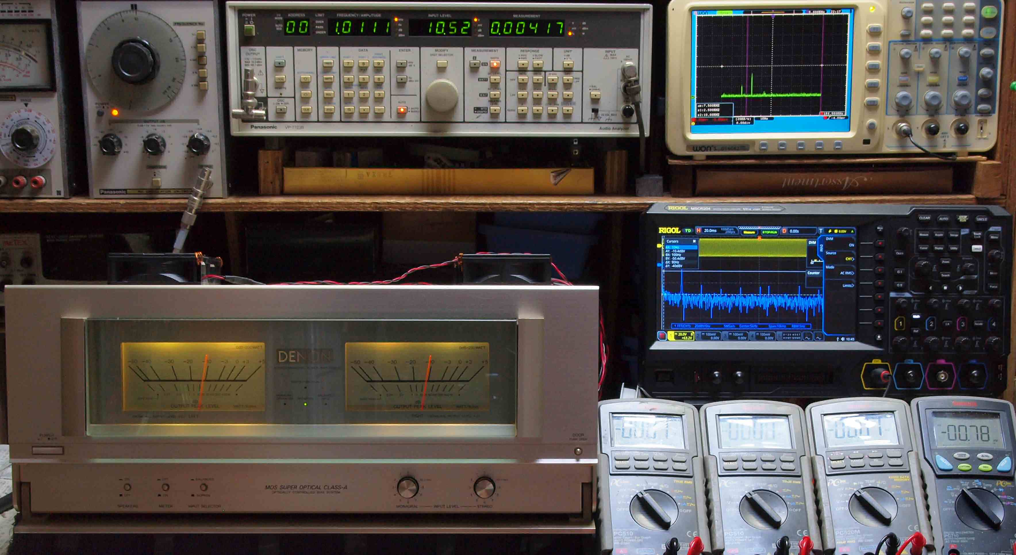 | E. 測定・調整。 画像をクリックすると、大きく(横幅2050ドット)表示されます。 E0. 出力・歪み率測定・調整 「見方」。 上段中 右側SP出力を「Audio Analyzer Panasonic VP−7723B」により測定。 表示LED、 左端=メモリーNo、 中左=周波数測定、 中右=出力電圧測定、 右端=歪み率測定。 上段右端 VP−7723Bの基本波除去出力を「owon SDS8202(200MHZ)」で「FFT分析」表示。 下段中 左側SP出力を「Audio Analyzer Panasonic VP−7723B」により測定。 表示LED、 左端=メモリーNo、 中左=周波数測定、 中右=出力電圧測定、 右端=歪み率測定。 下段右端 VP−7723Bの基本波除去出力を「owon SDS6062(200MHZ)」で「FFT分析」表示。 下段左端 オーディオ発振器 VP−7201A より50Hz〜100kHzの信号を出し(歪み率=約0.003%)、ATT+分配器を通し、AMPに入力。 よって、ダイアル設定出力レベルより低くなります。測定機器の仕様や整備の様子はこちら、「VP−7723B」「VP−7201A」。 FFT画面の見方はこちら。 |