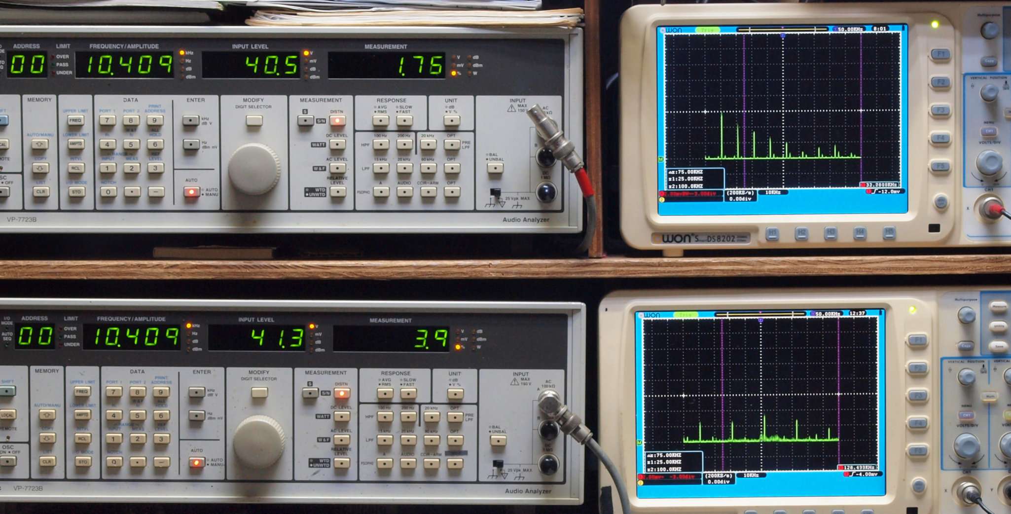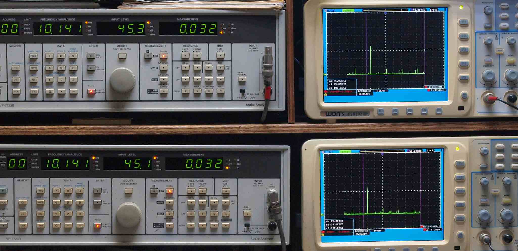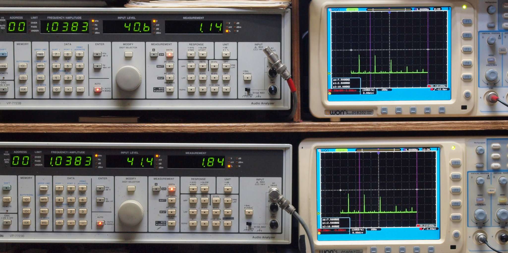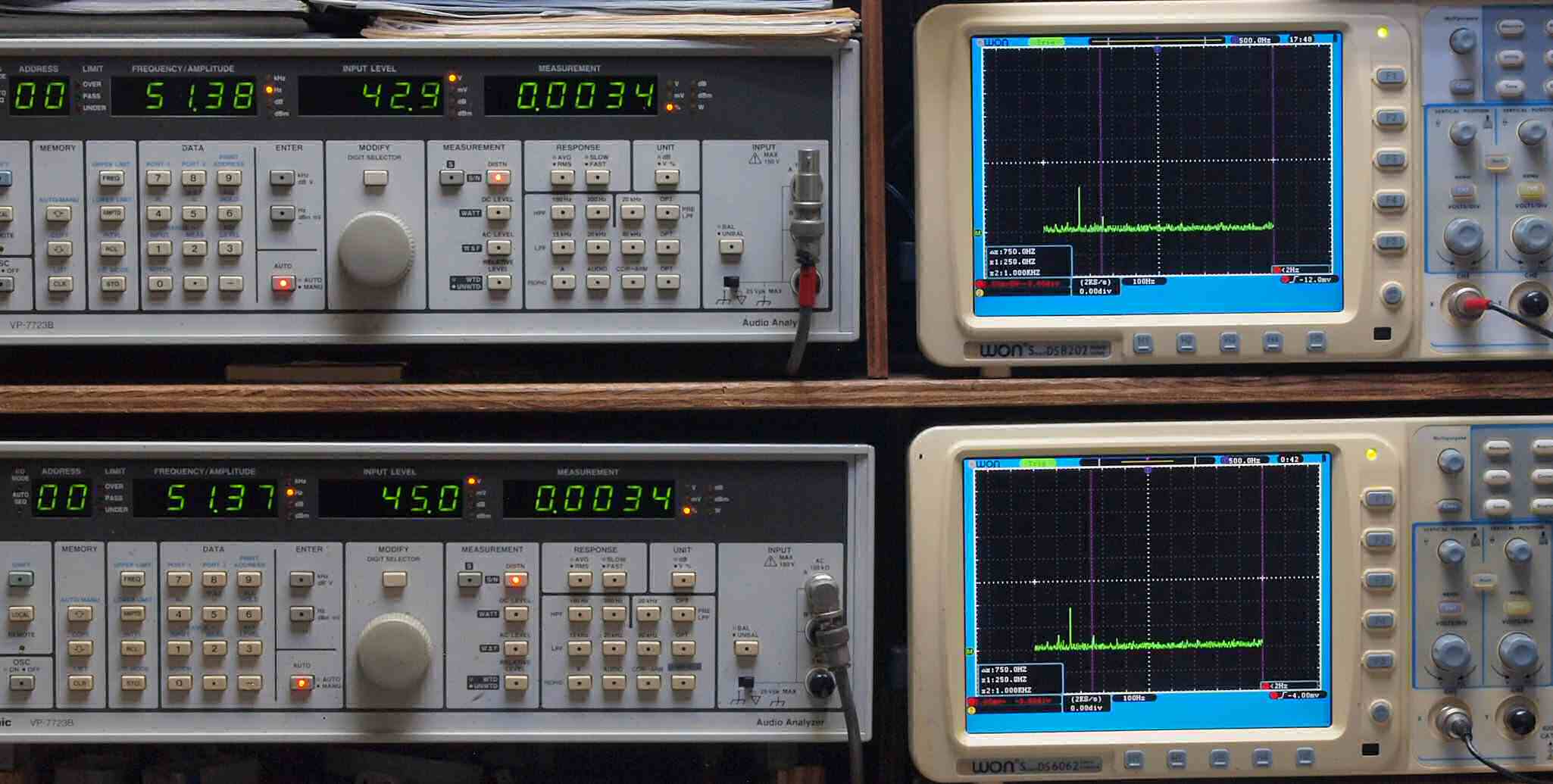 | E. 測定・調整。 画像をクリックすると、大きく(横幅2050ドット)表示されます。 E0. 出力・歪み率測定・調整 「見方」。 上段中 右側SP出力を「Audio Analyzer Panasonic VP−7723B」により測定。 表示LED、 左端=メモリーNo、 中左=周波数測定、 中右=出力電圧測定、 右端=歪み率測定。 上段右端 VP−7723Bの基本波除去出力を「owon SDS8202(200MHZ)」で「FFT分析」表示。 下段中 左側SP出力を「Audio Analyzer Panasonic VP−7723B」により測定。 表示LED、 左端=メモリーNo、 中左=周波数測定、 中右=出力電圧測定、 右端=歪み率測定。 下段右端 VP−7723Bの基本波除去出力を「owon SDS6062(200MHZ)」で「FFT分析」表示。 下段左端 オーディオ発振器 VP−7201A より50Hz〜100kHzの信号を出し(歪み率=約0.003%)、ATT+分配器を通し、AMPに入力。 よって、ダイアル設定出力レベルより低くなります。測定機器の仕様や整備の様子はこちら、「VP−7723B」「VP−7201A」。 FFT画面の見方はこちら。 |