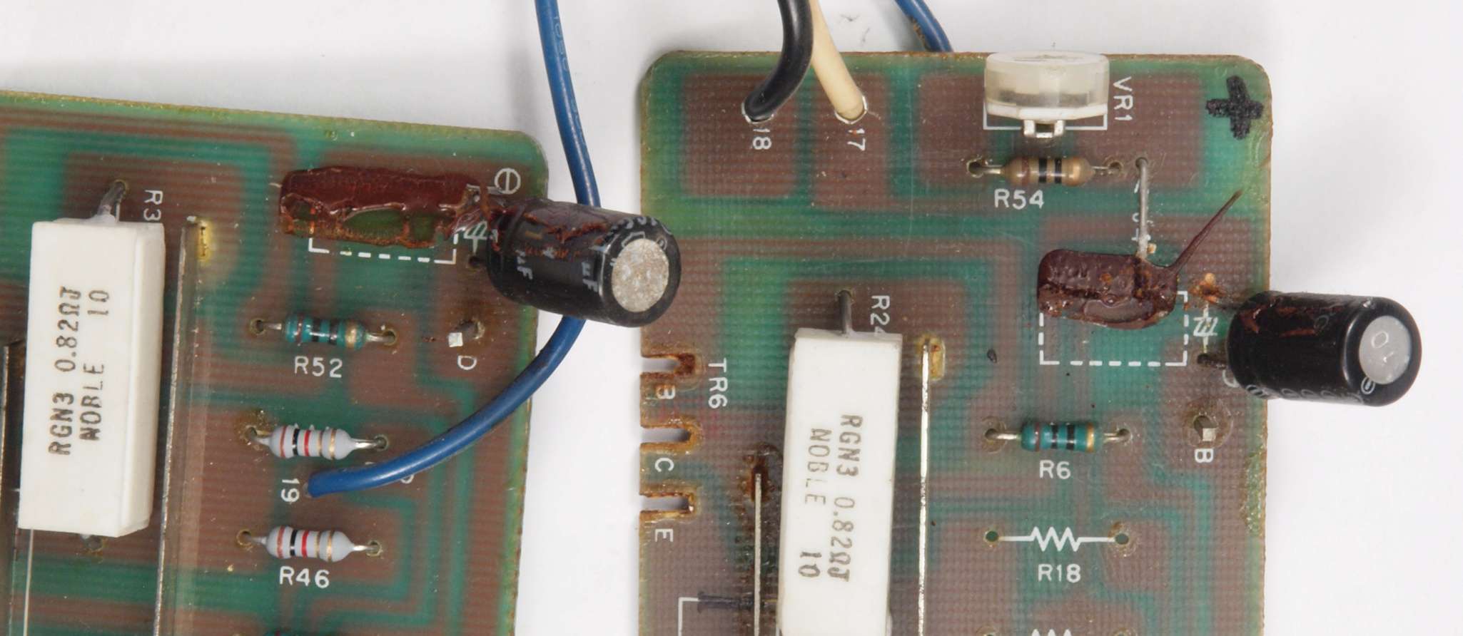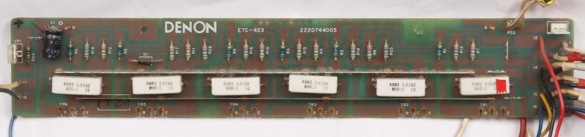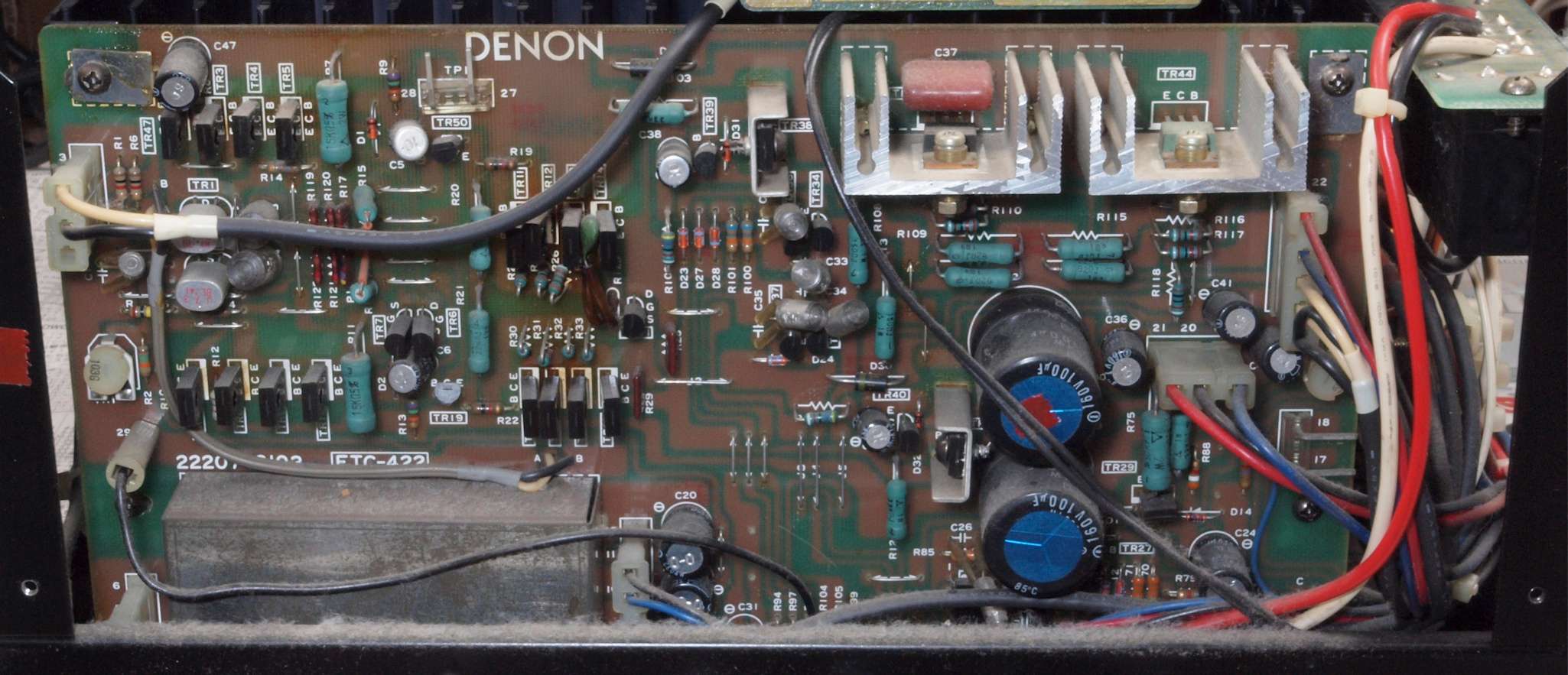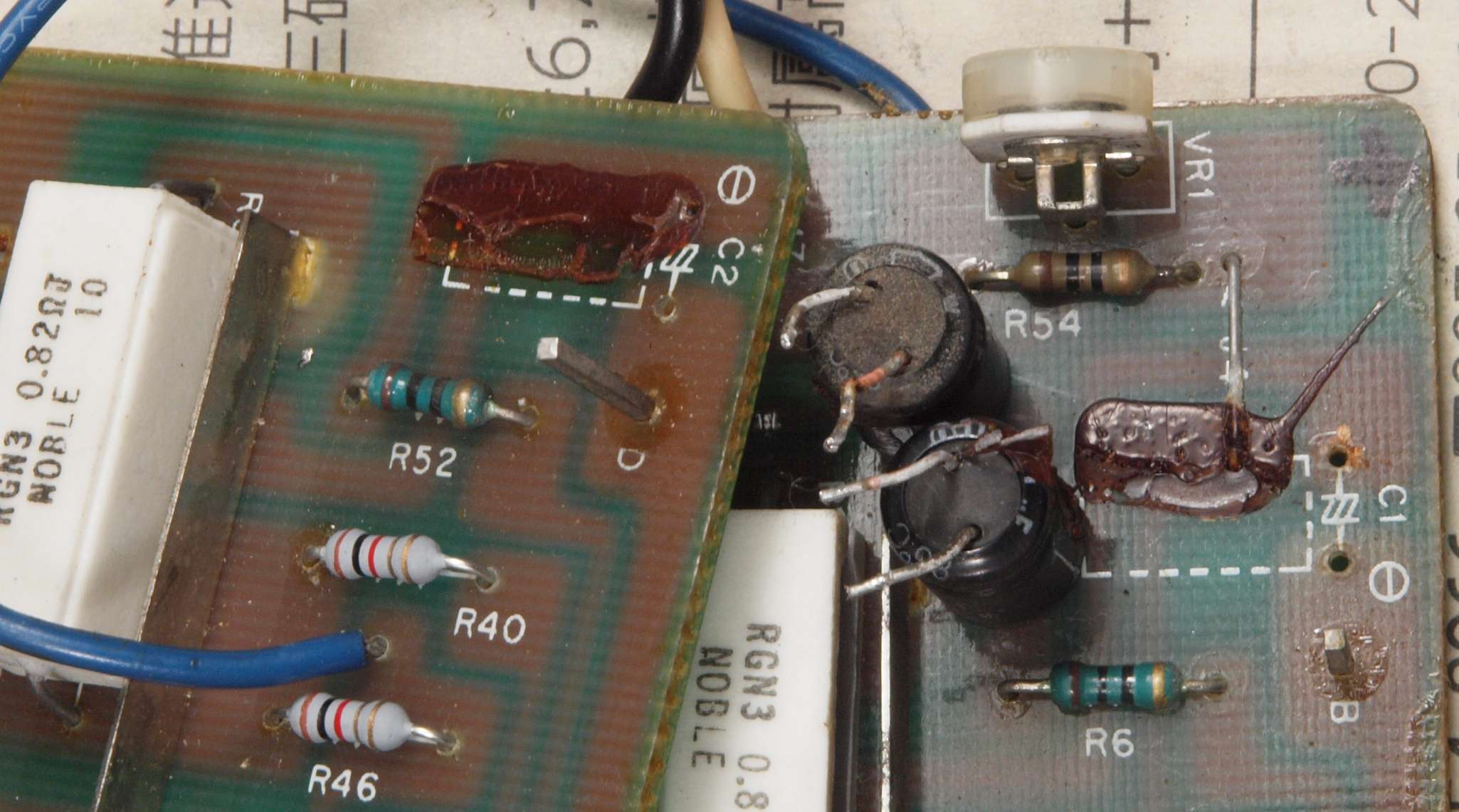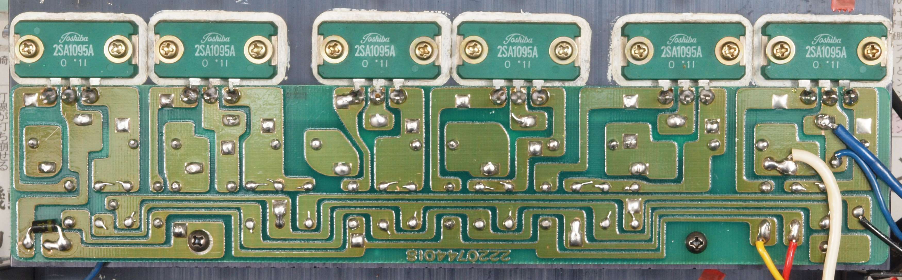 | C1G. 修理中 +−側終段AMP基板。 ジャンパー線、電解コンデンサーの足が腐食している。 | ||||||||||||||||||||||||||||||||||||||||||||||||||||||||