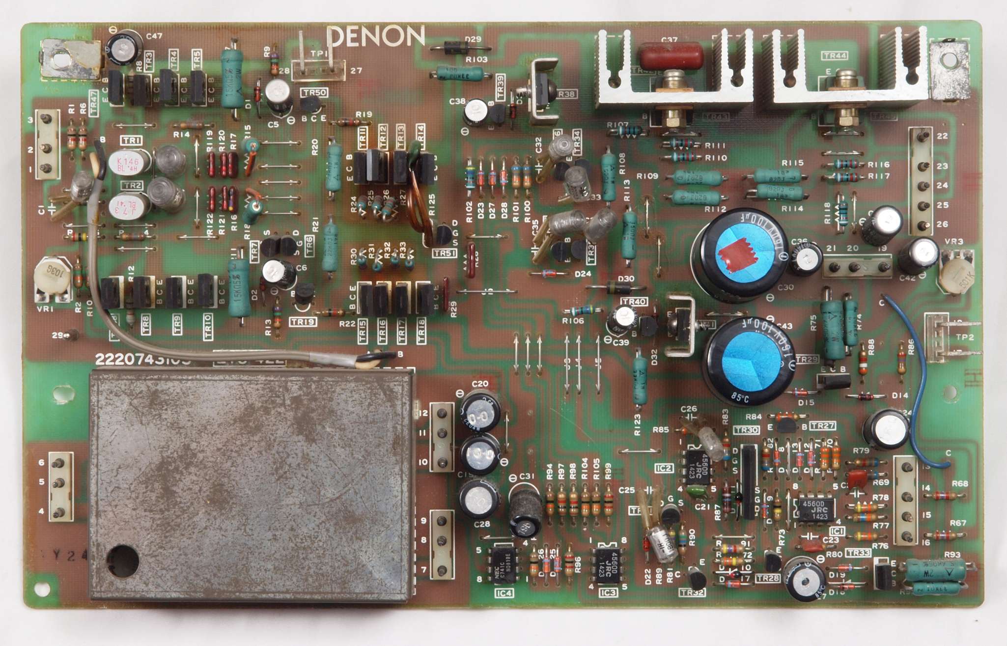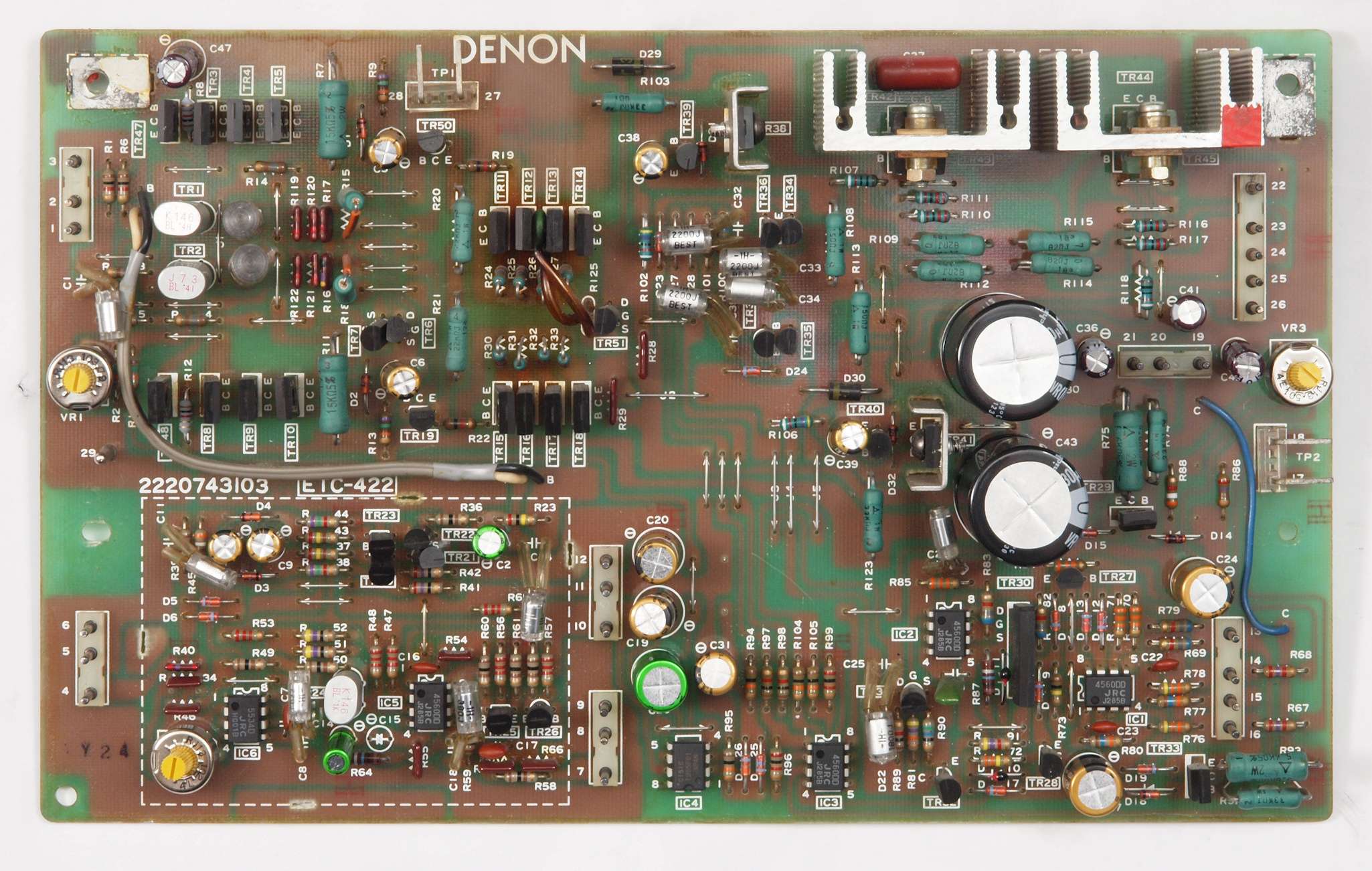 | C23. 修理後 ドライブAMP基板。 半固定VR3個、電解コンデンサー個21、TR(トランジスター)2個、OP−AMP6個交換。 |