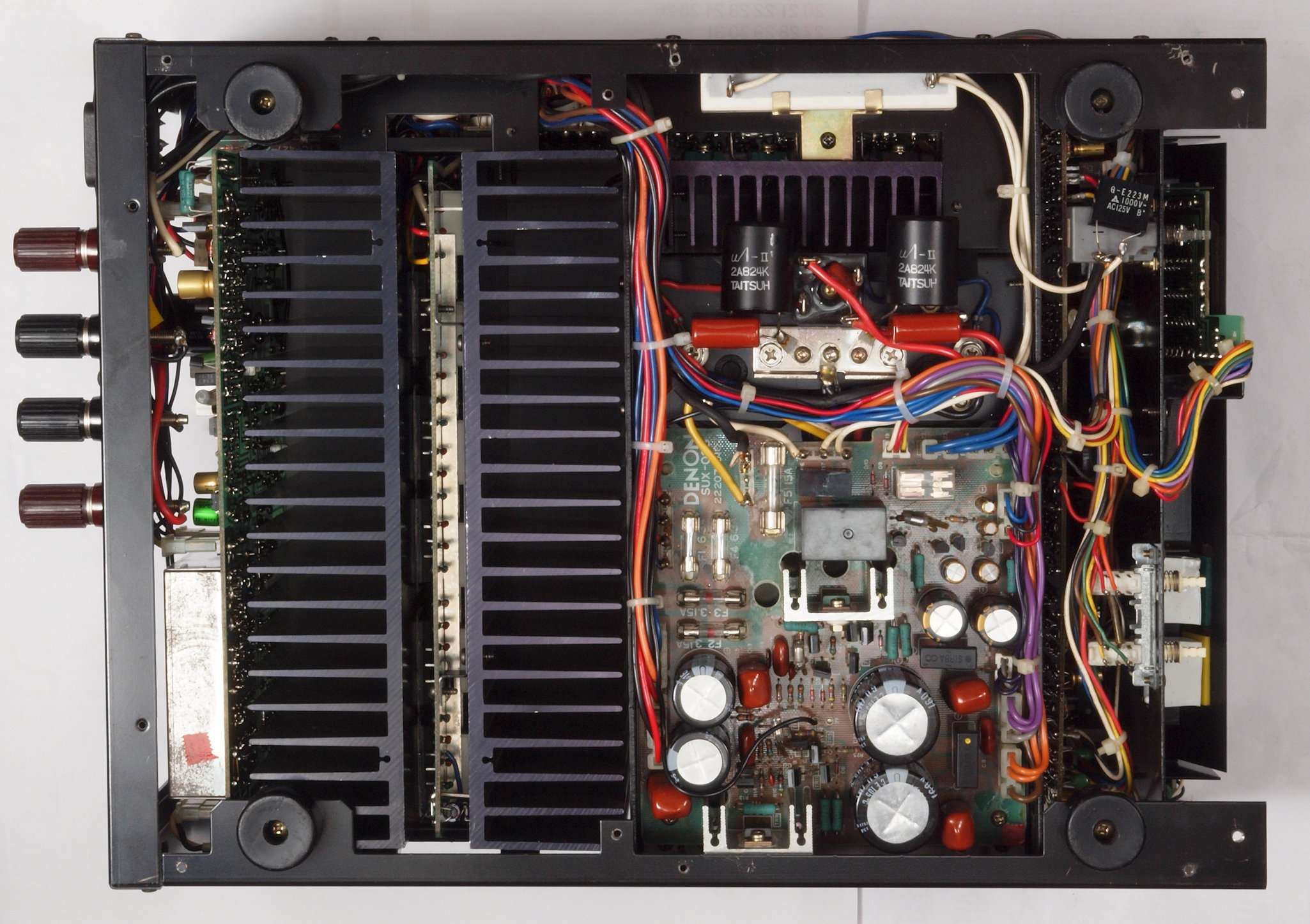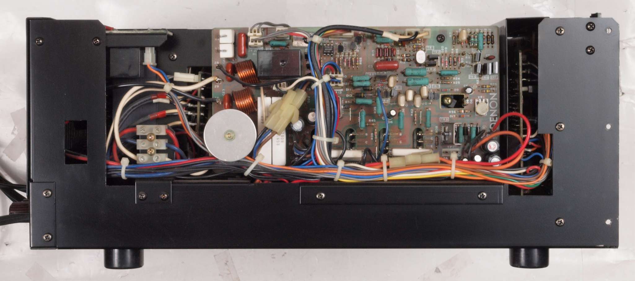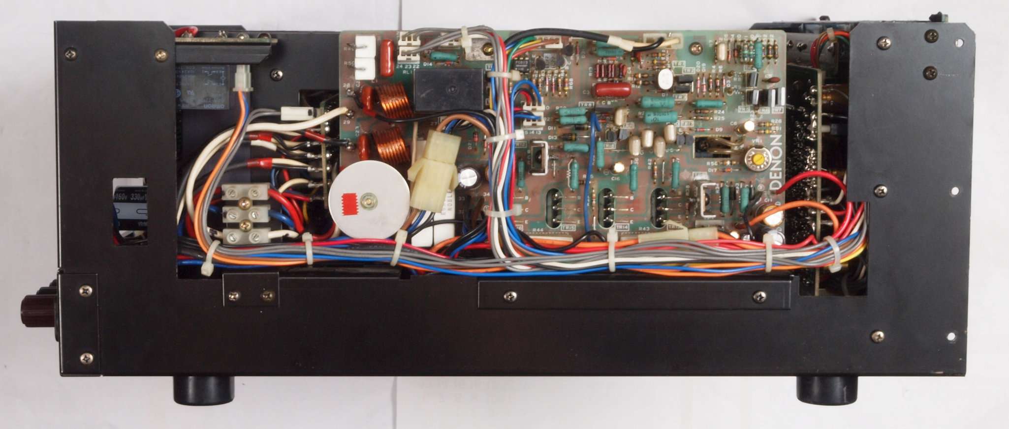 | CB2. 修理後 電源ブロック電解コンデンサー下配線。 フイルムコンデンサー2個追加。 フイルムコンデンサー取付ビスは塗装ビスからメッキビスに交換する。 |