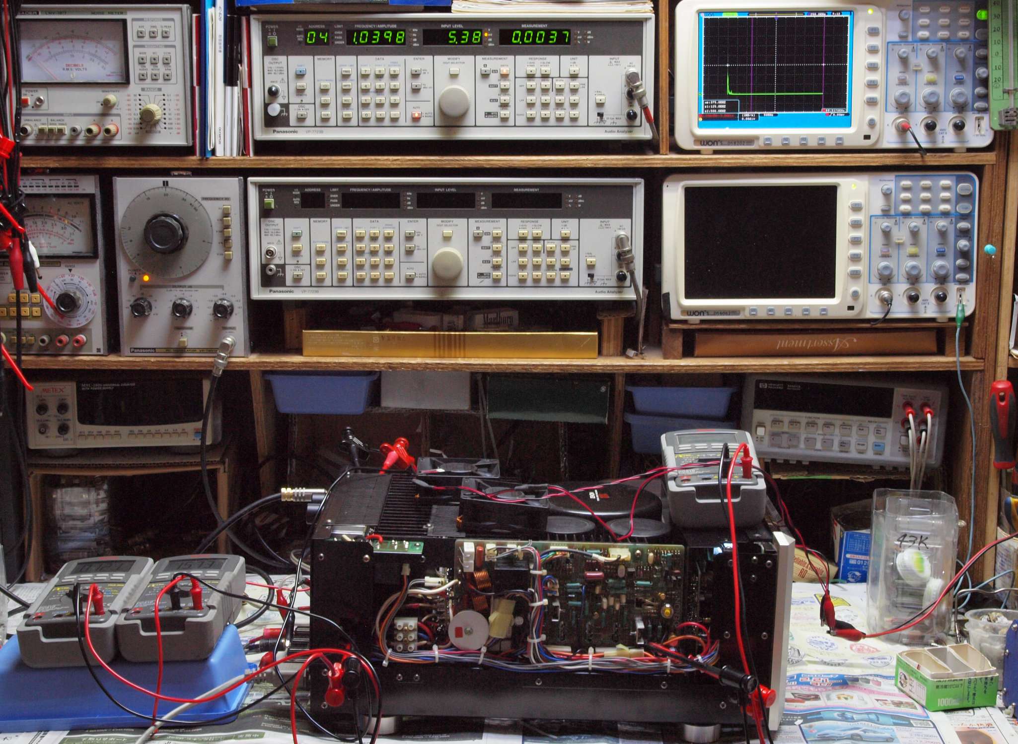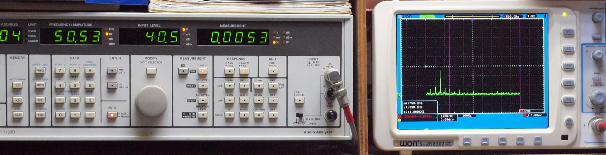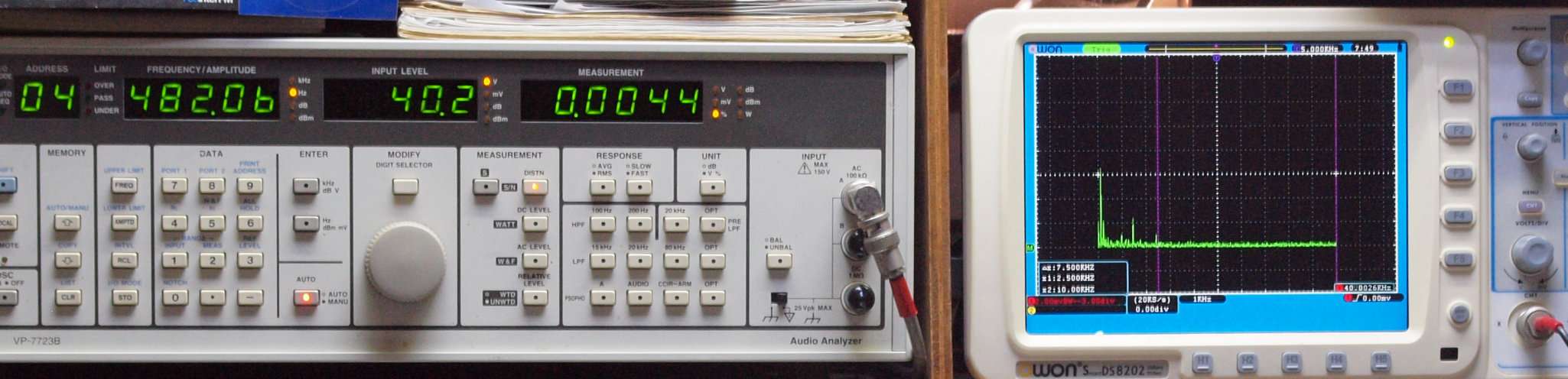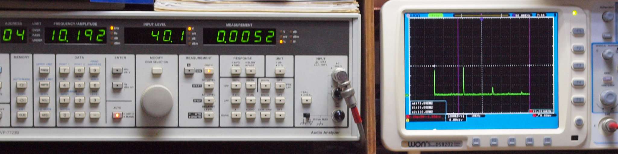 | E. 測定・調整。 画像をクリックすると、大きく(横幅2050ドット)表示されます。 E0. 出力・歪み率測定・調整 「見方」。 中..SP出力を「Audio Analyzer Panasonic VP−7723B」により測定。 表示LED、 左端=メモリーNo、 中左=周波数測定、 中右=出力電圧測定、 右端=歪み率測定。 右..VP−7723Bの基本波除去出力を「owon SDS6062(200MHZ)」で「FFT分析」表示。 左..オーディオ発振器 VP−7201A より50Hz〜100kHzの信号を出し(歪み率=約0.003%)、ATT+分配器を通し、AMPに入力。 よって、ダイアル設定出力レベルより低くなります。測定機器の仕様や整備の様子はこちら、「VP−7723B」「VP−7201A」。 FFT画面の見方はこちら。 |