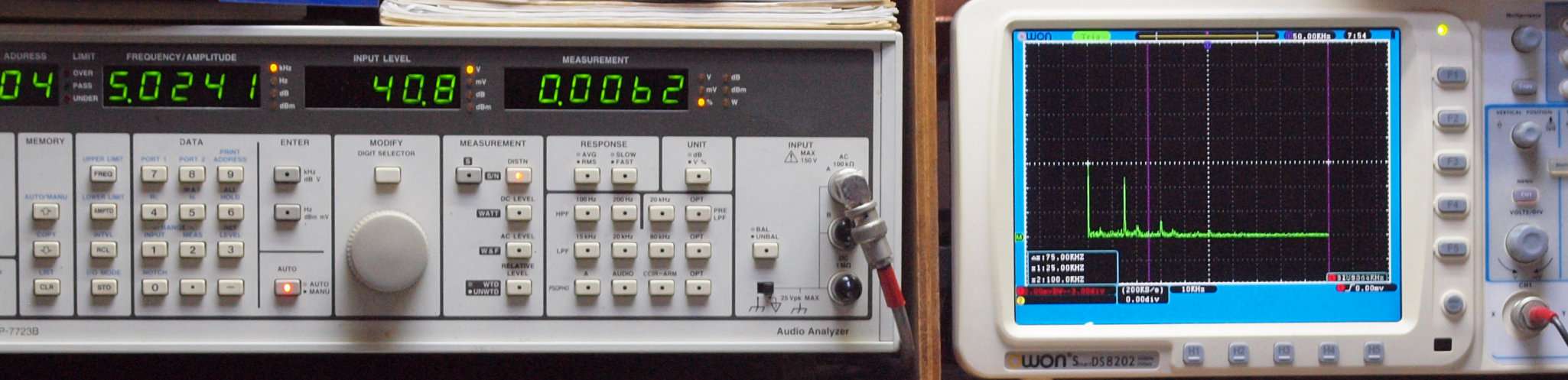 | E5. 5kHz入力、SP出力電圧40V=200W出力、 0.0062%歪み。 「FFT分析」のオシロのカーソル周波数、左=25kHz、右=100kHz。 |