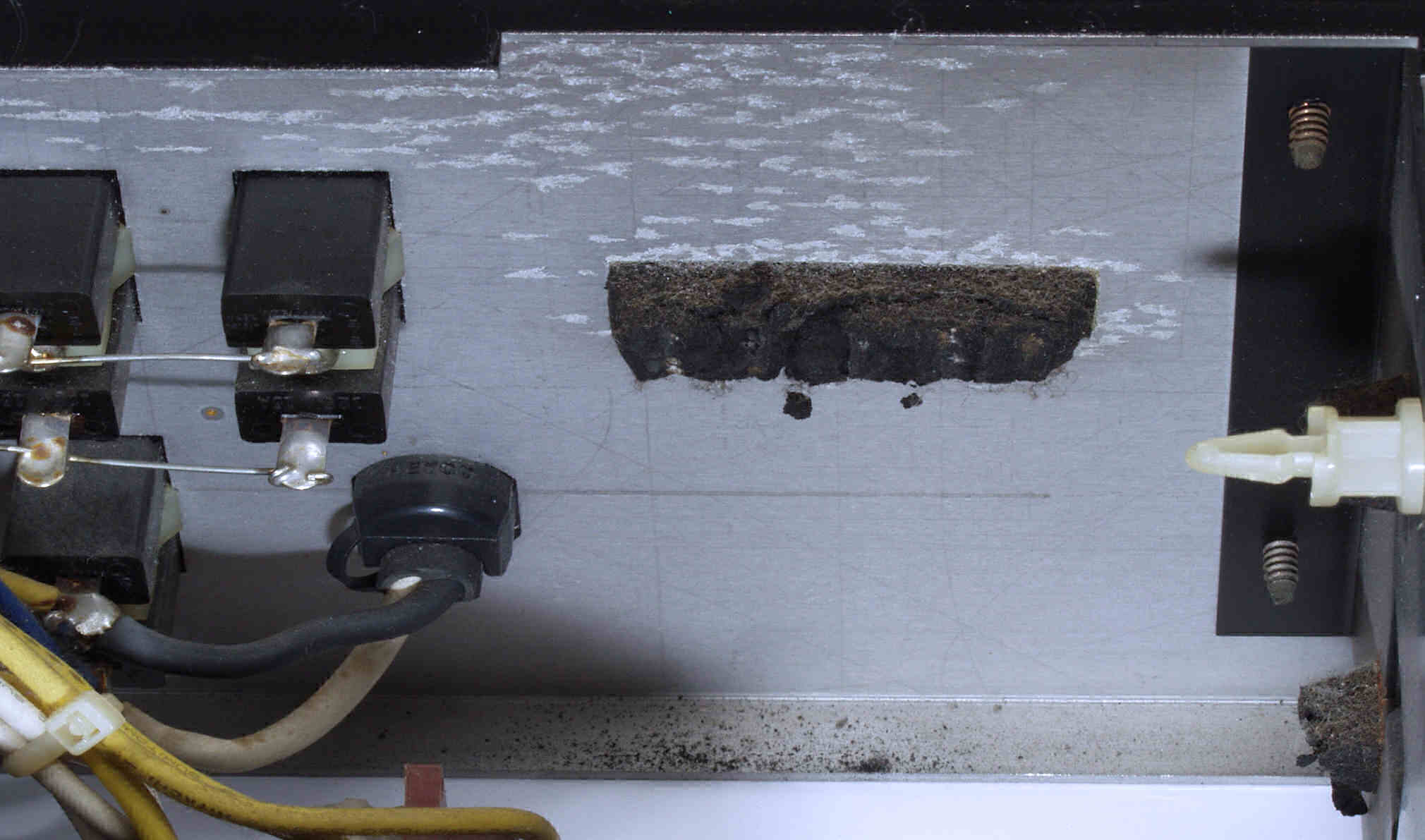 C115. 修理中 基板を固定するスポンジは変成して、固形化している、電源基板取り付け場所。