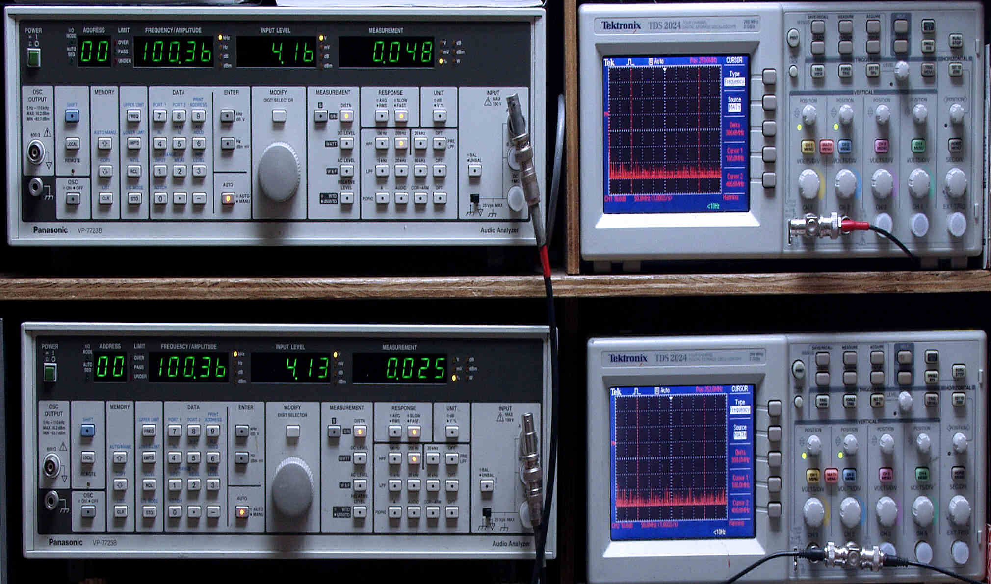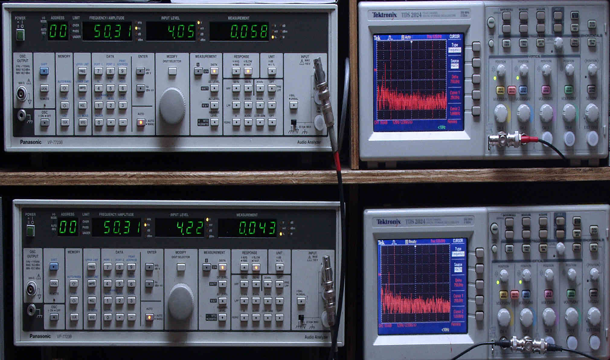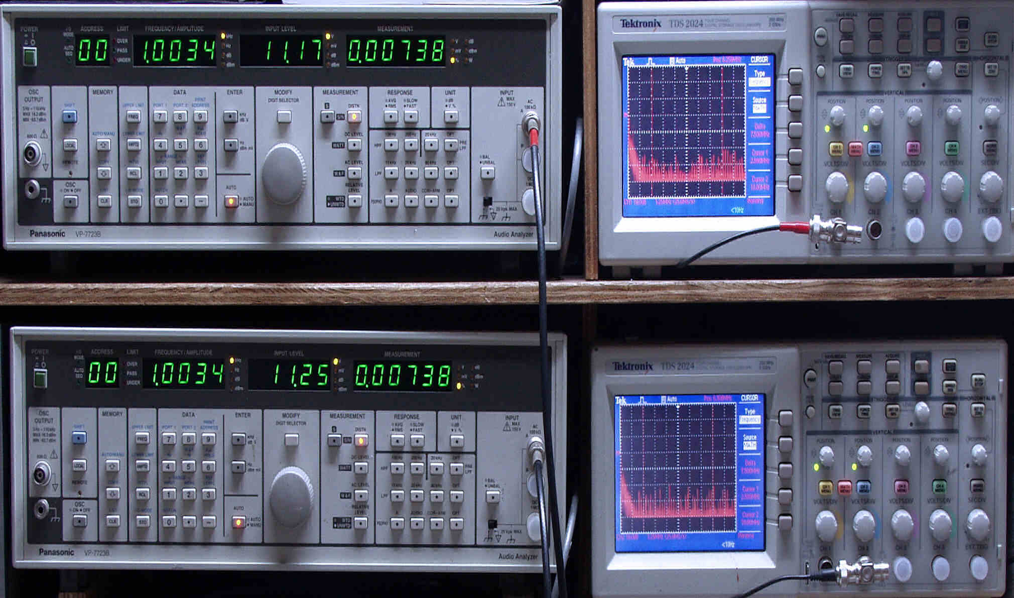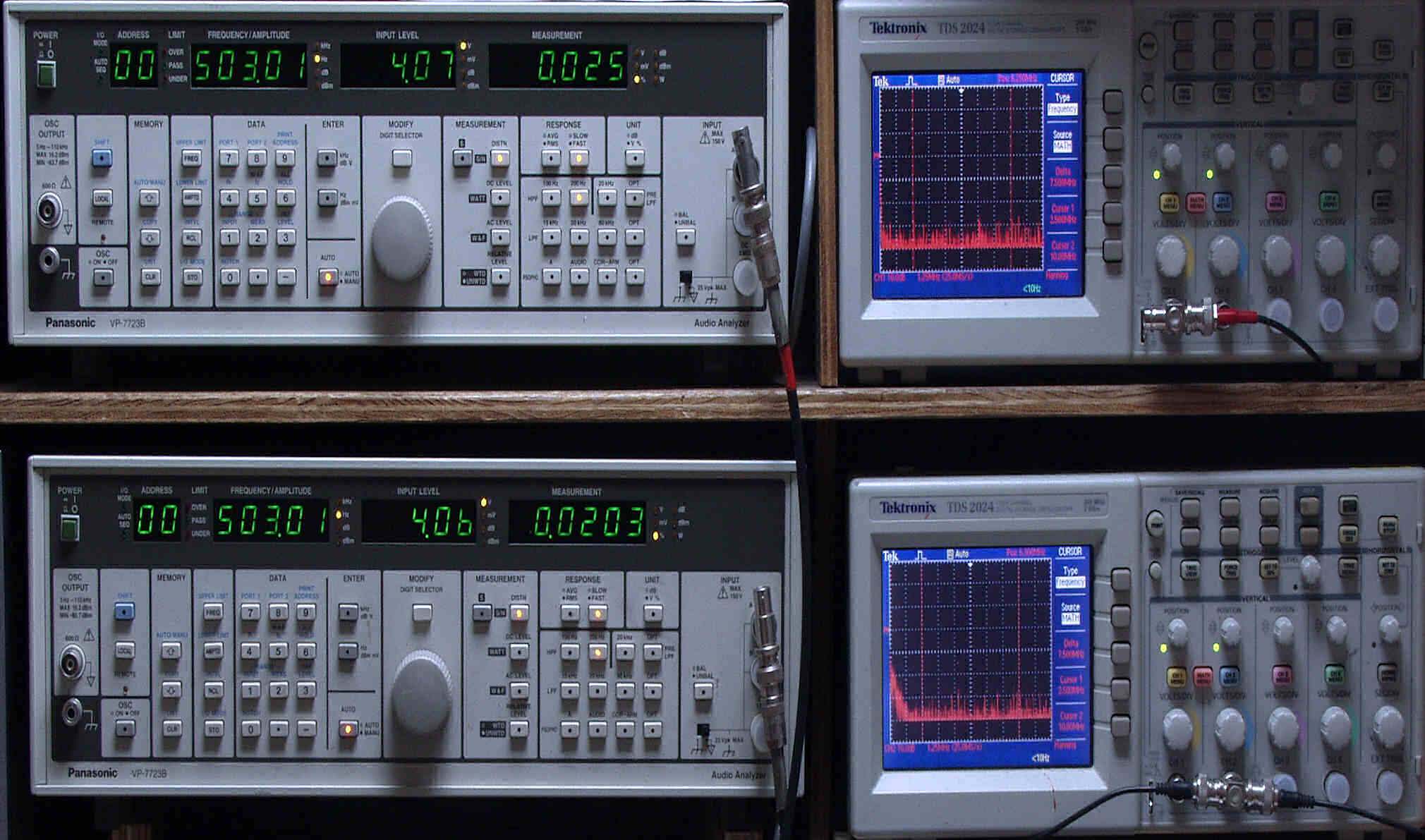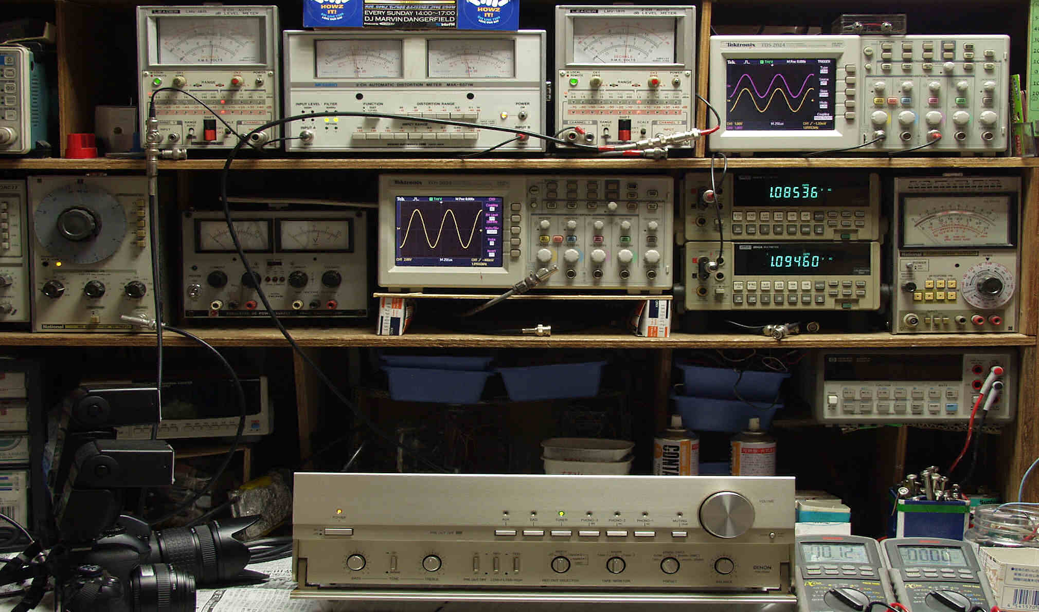 上段中左 歪み率計=出力の歪み率測定。 左メータ=L出力、右メータ=R出力。