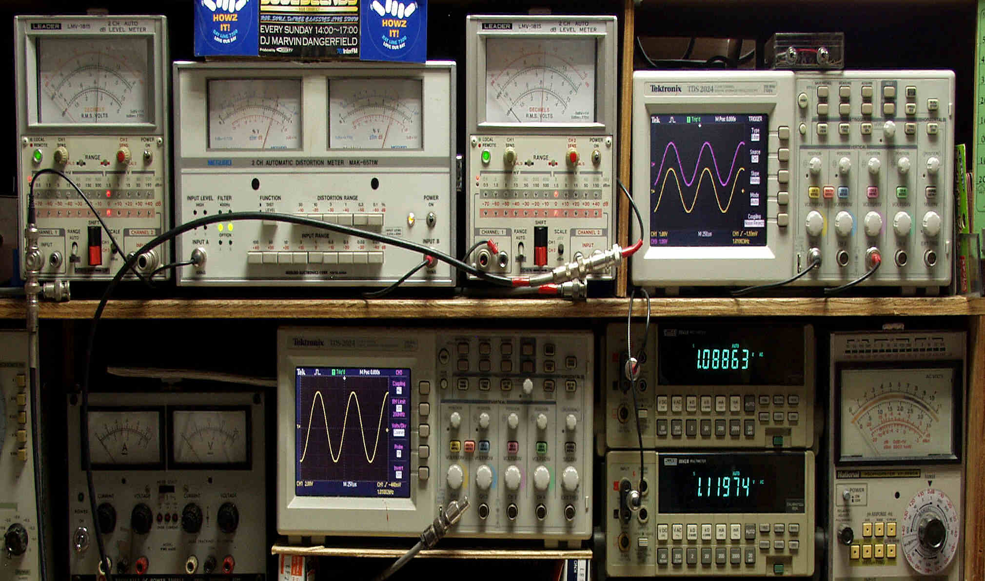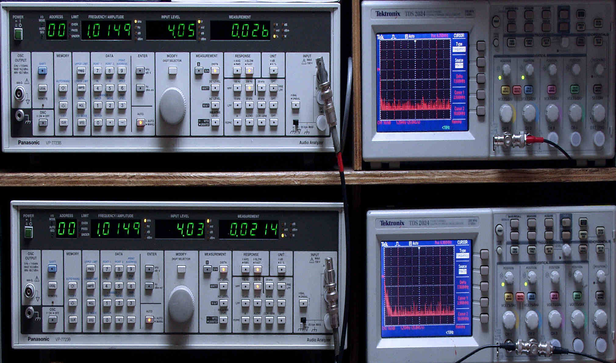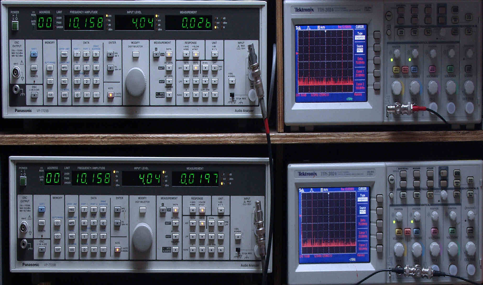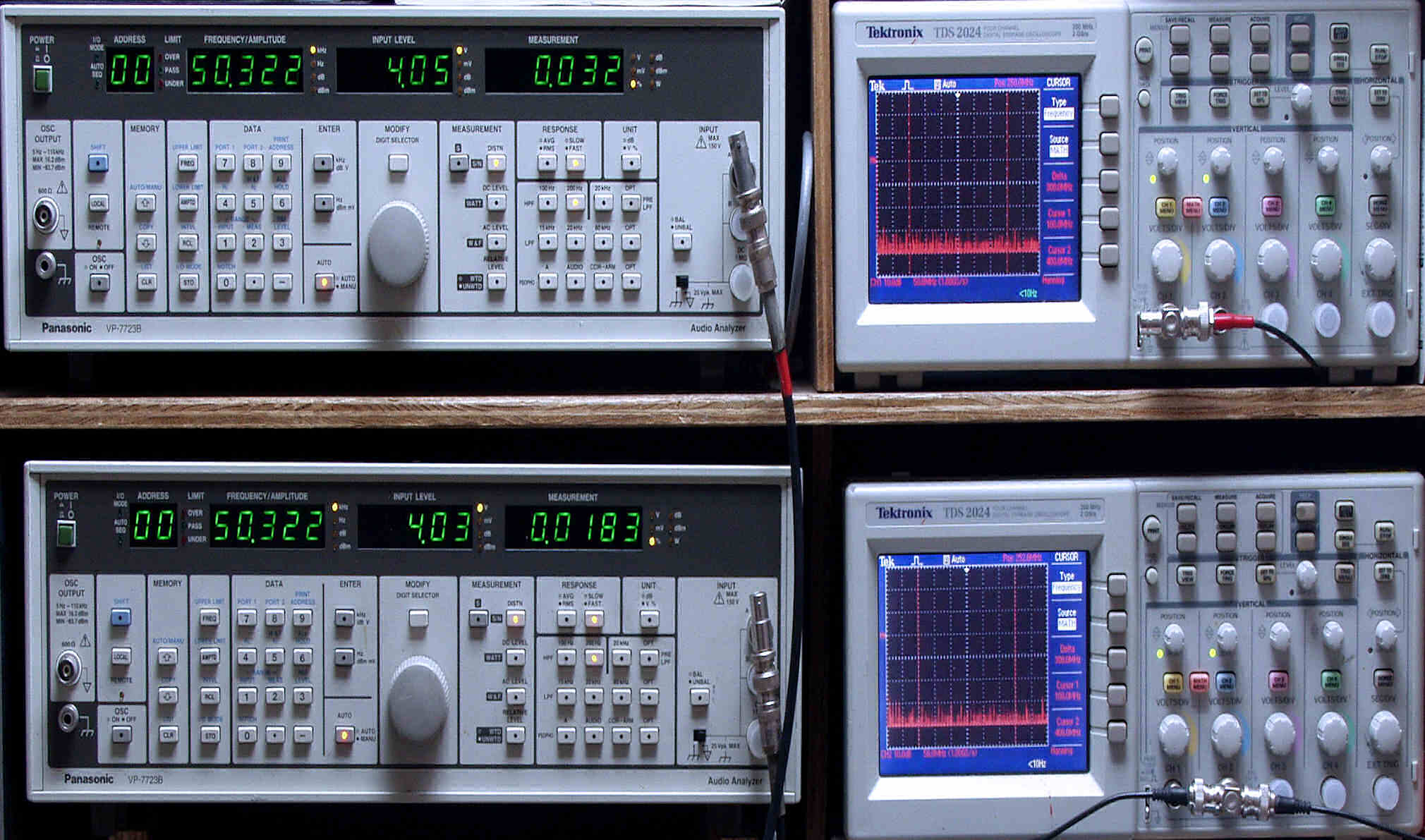 上段中左 歪み率計=出力の歪み率測定。 左メータ=L出力、右メータ=R出力。
