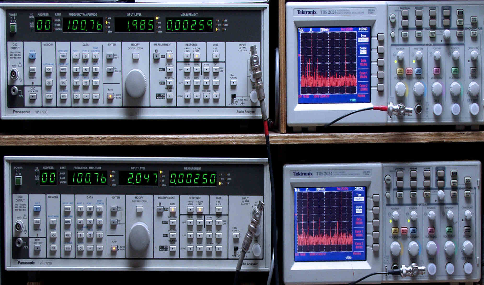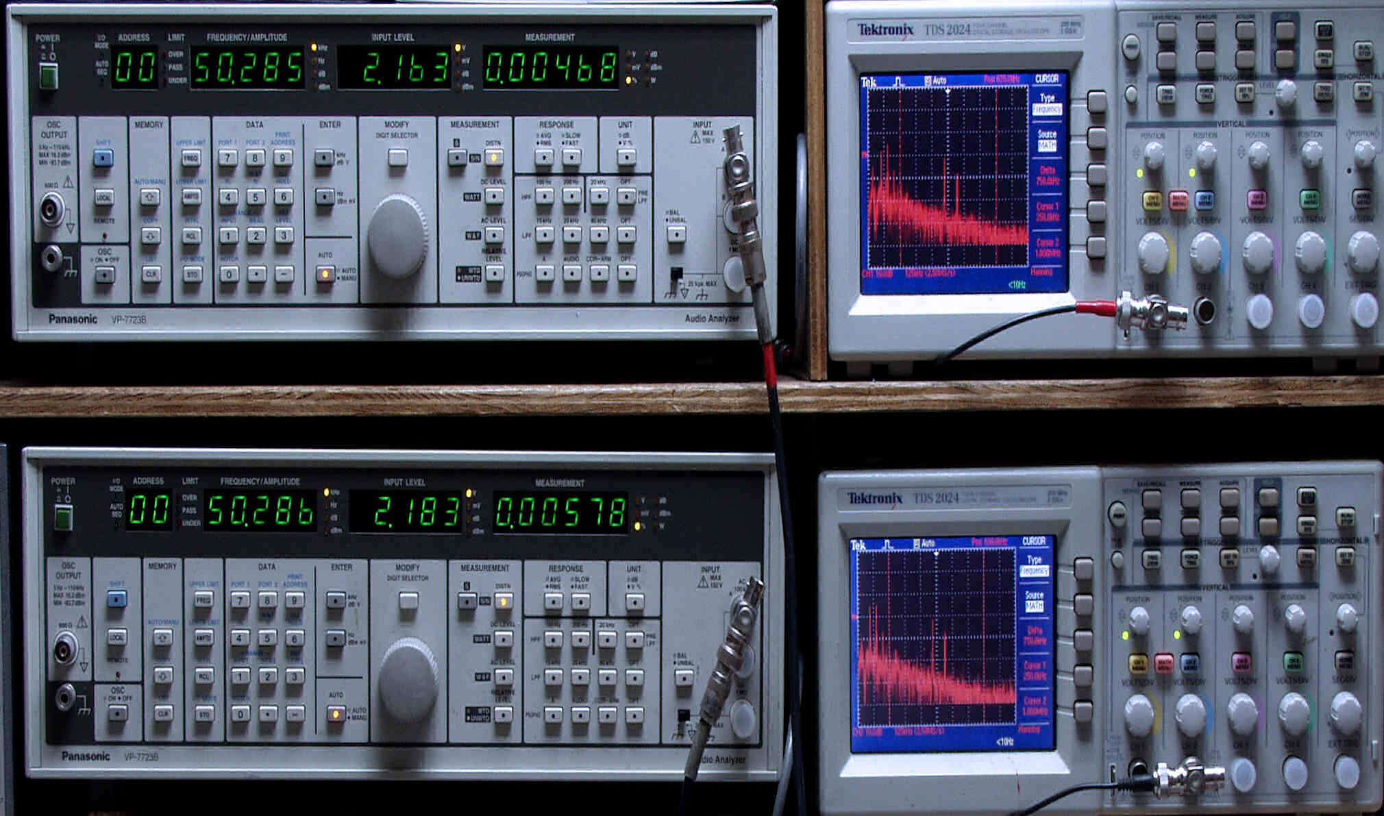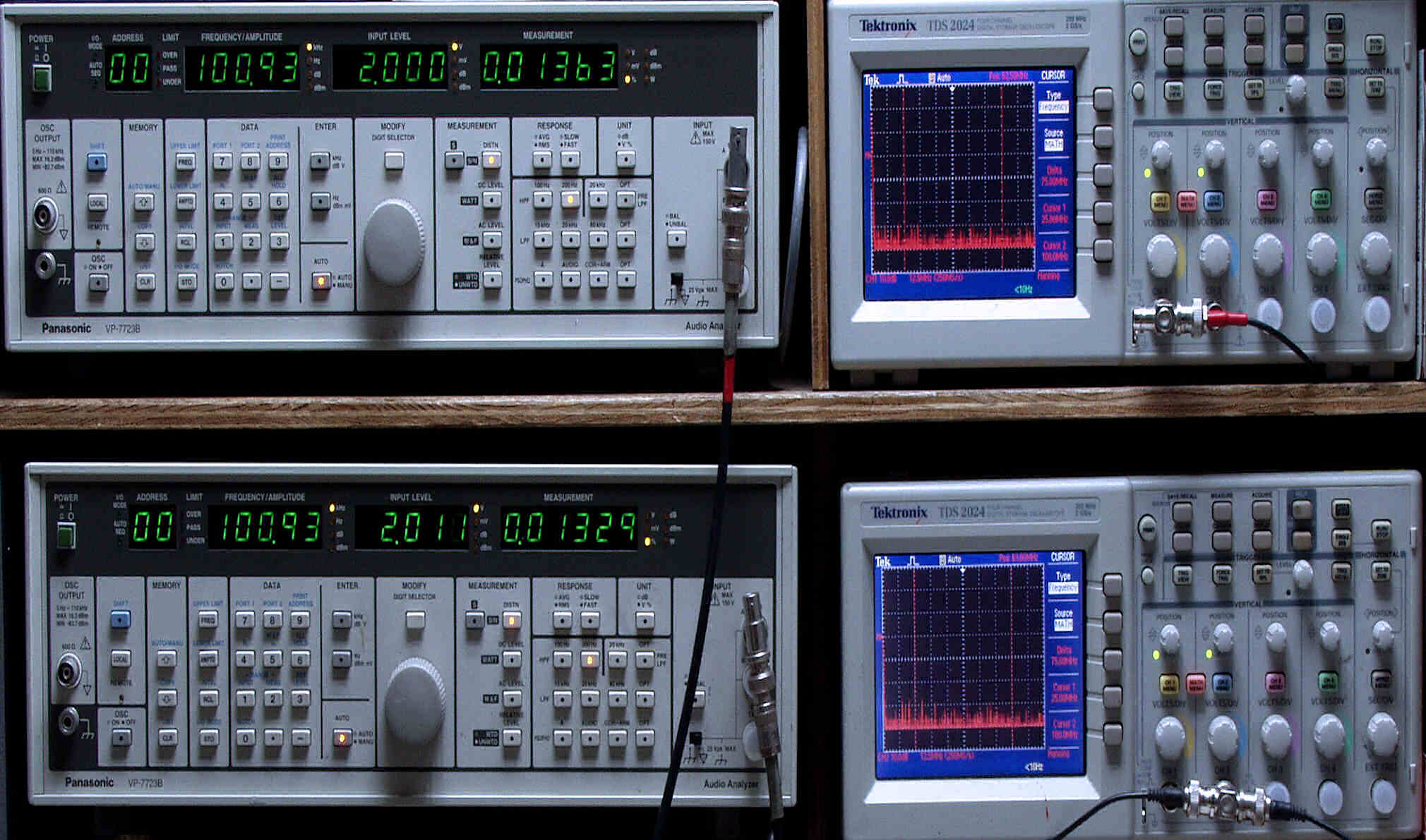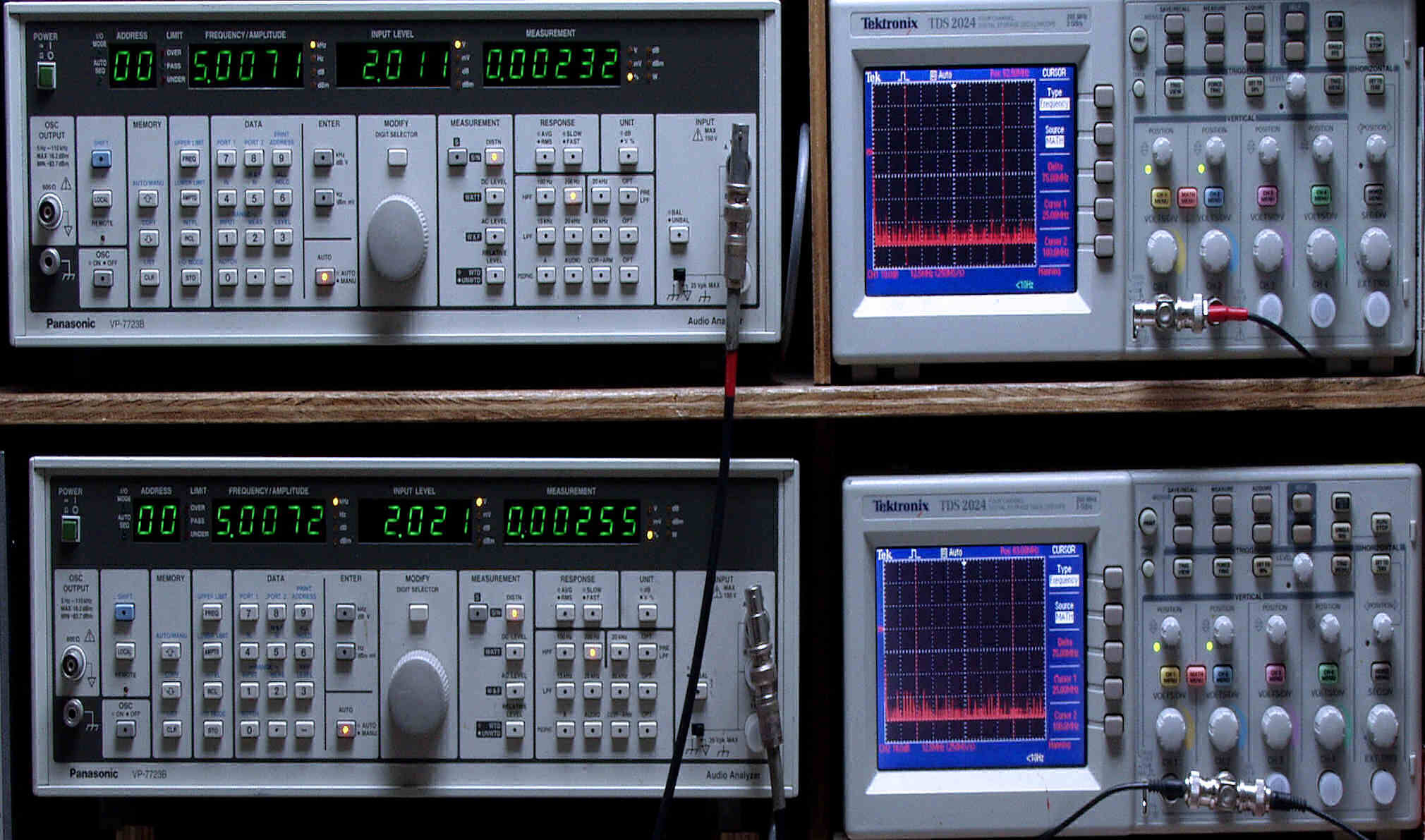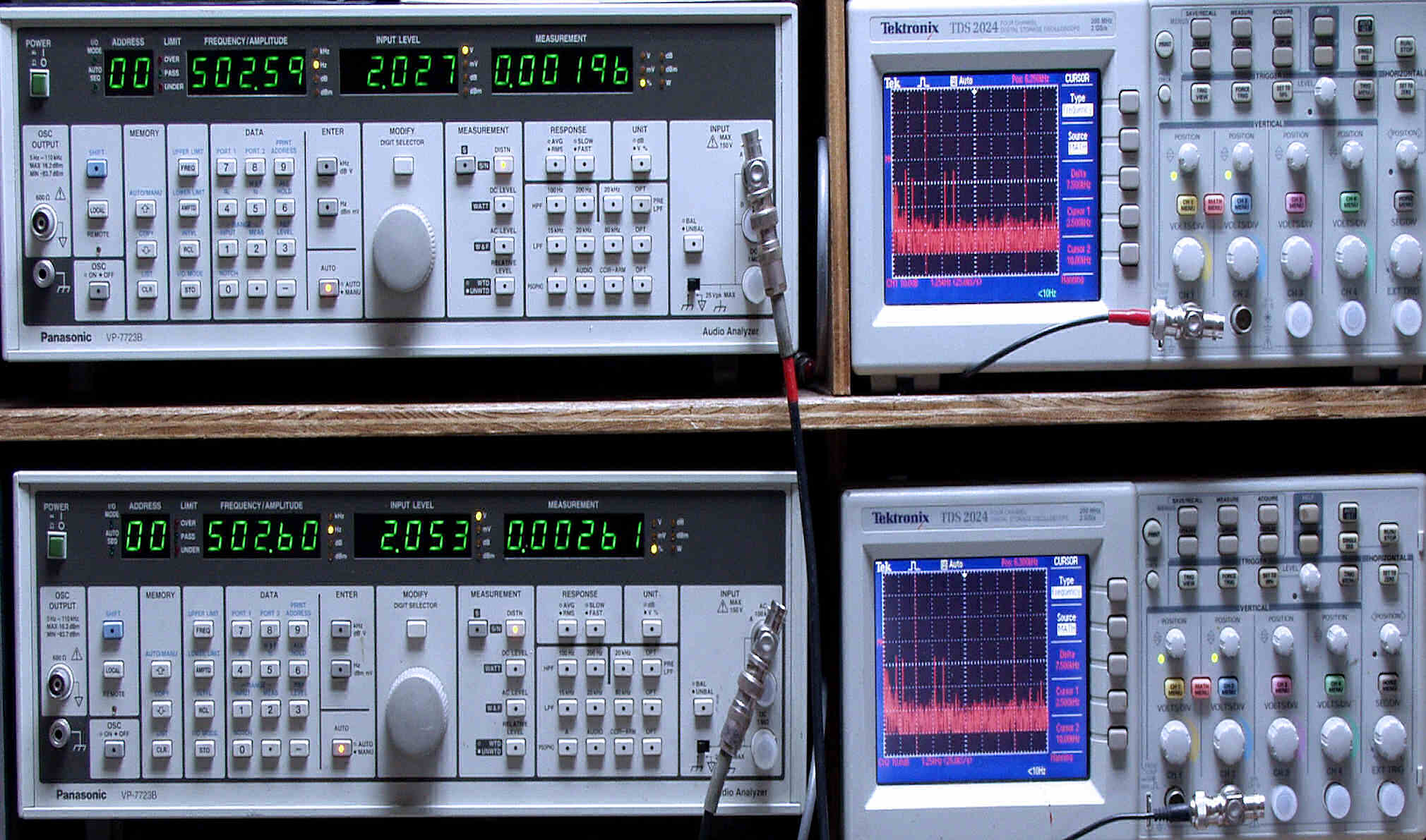 上段中左 歪み率計=出力の歪み率測定。 左メータ=L出力、右メータ=R出力。