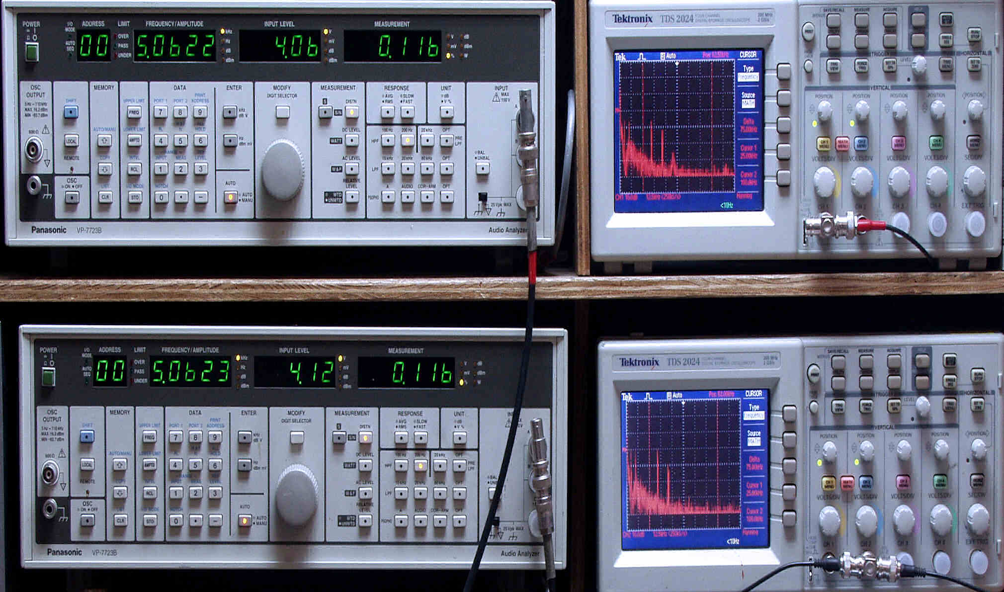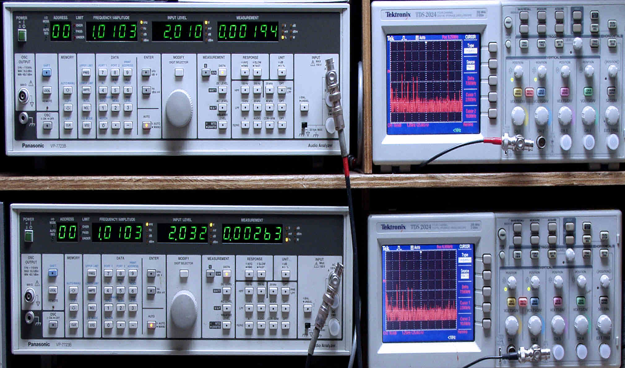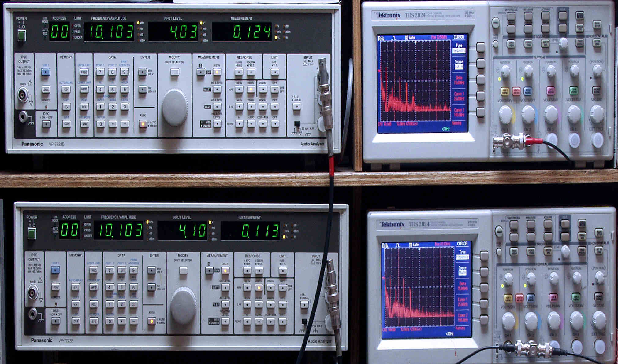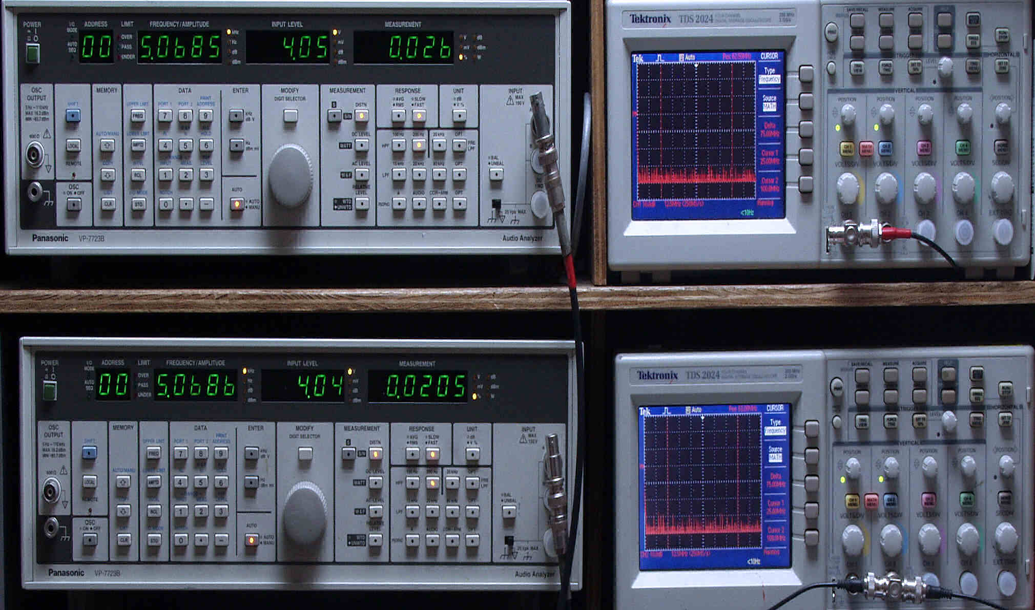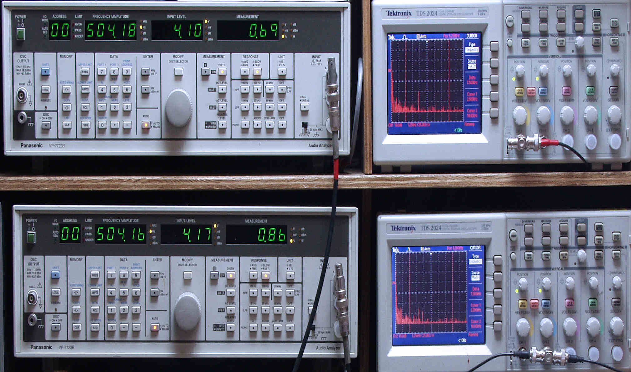 上段中左 歪み率計=出力の歪み率測定。 左メータ=L出力、右メータ=R出力。