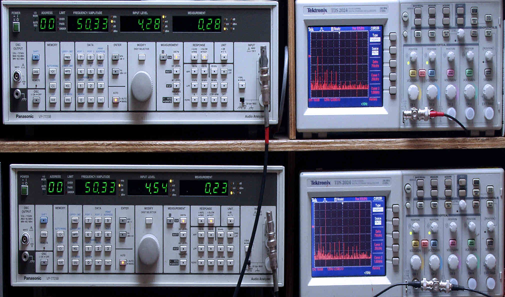 「FFT分析」のオシロのカーソル周波数、左=250Hz、右=1kHz。
