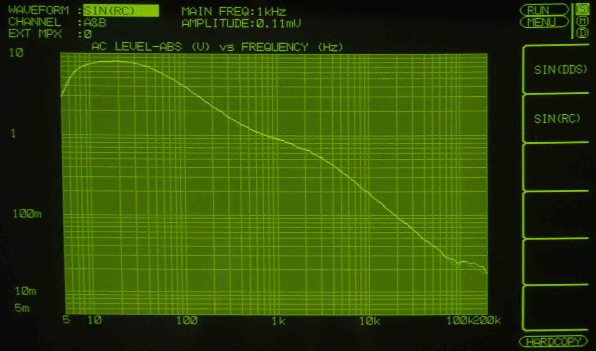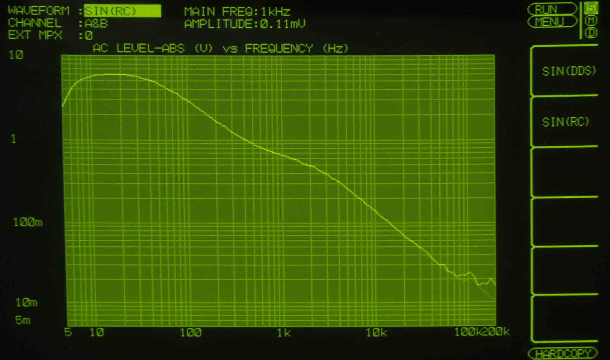AUX入力端子へ150mV一定入力 VRはmax 平均で1V出力   左出力=薄(細い)色 右出力=濃い(太い)色