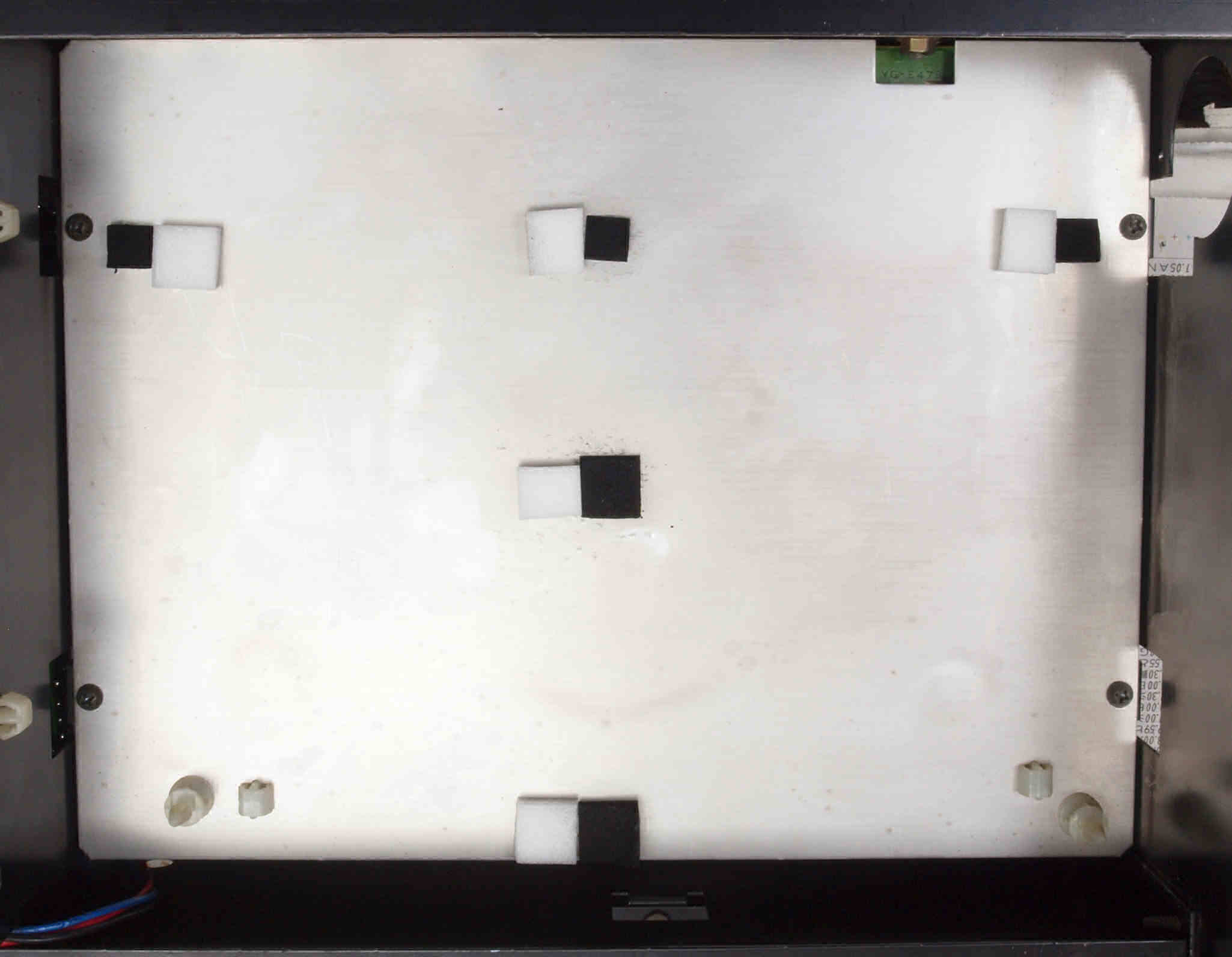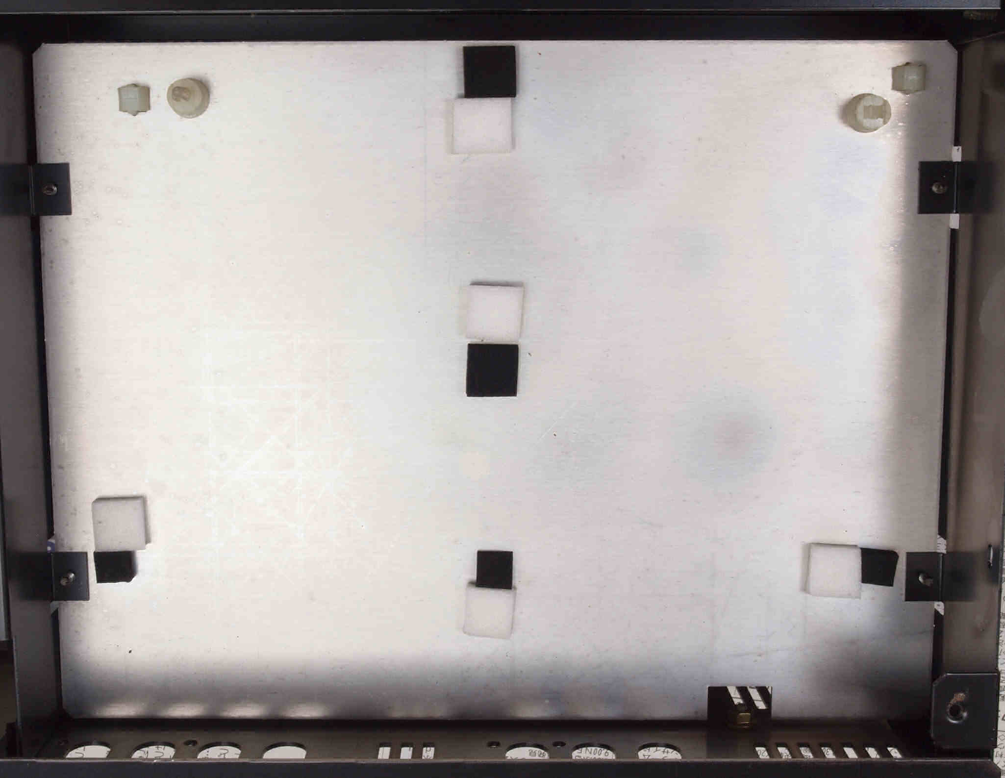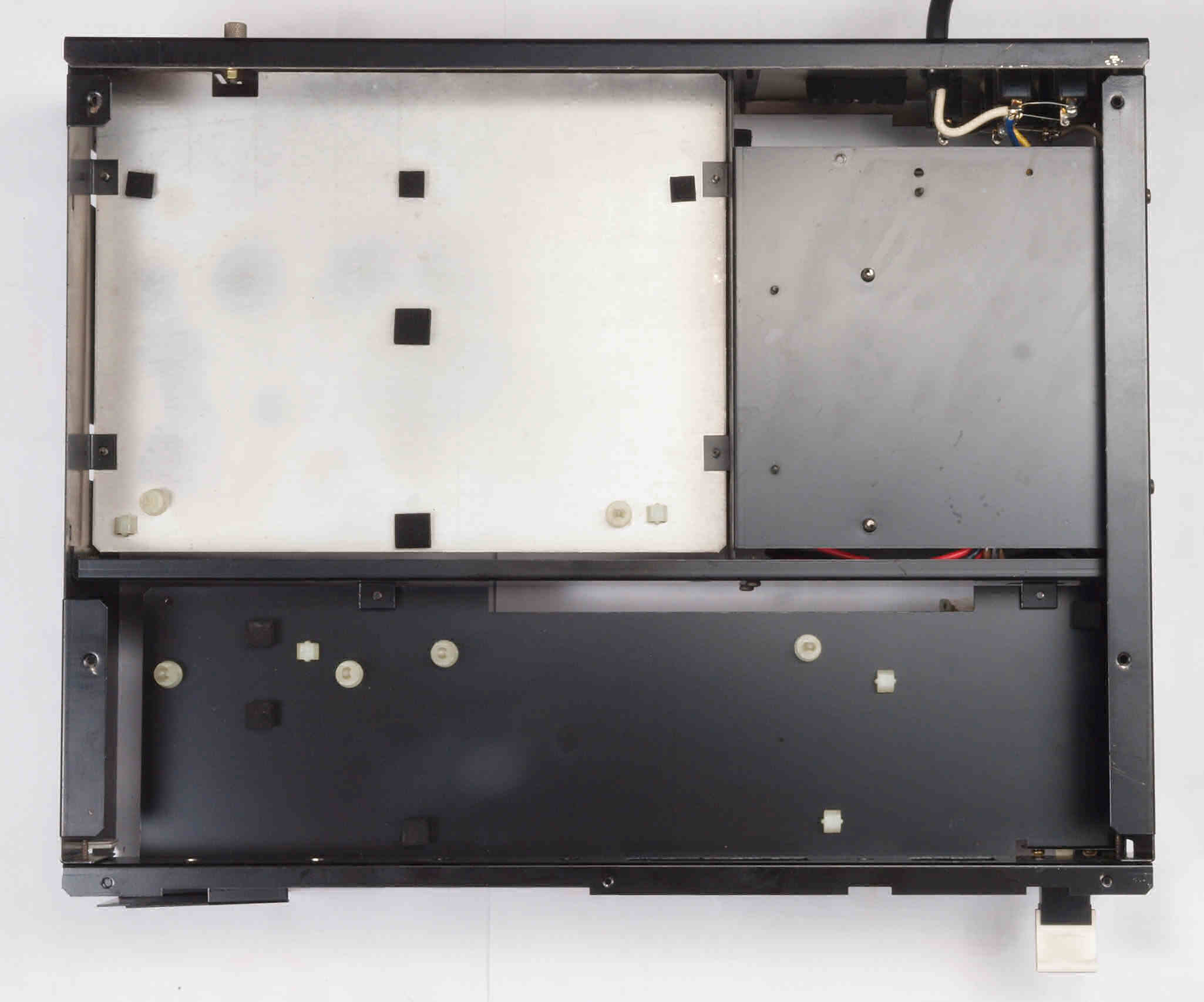 | C. 修理状況。 画像をクリックすると、大きく(横幅2050ドット)表示されます。 C01. 修理中 基板を全て取り除いたシャーシを上から見る。 |