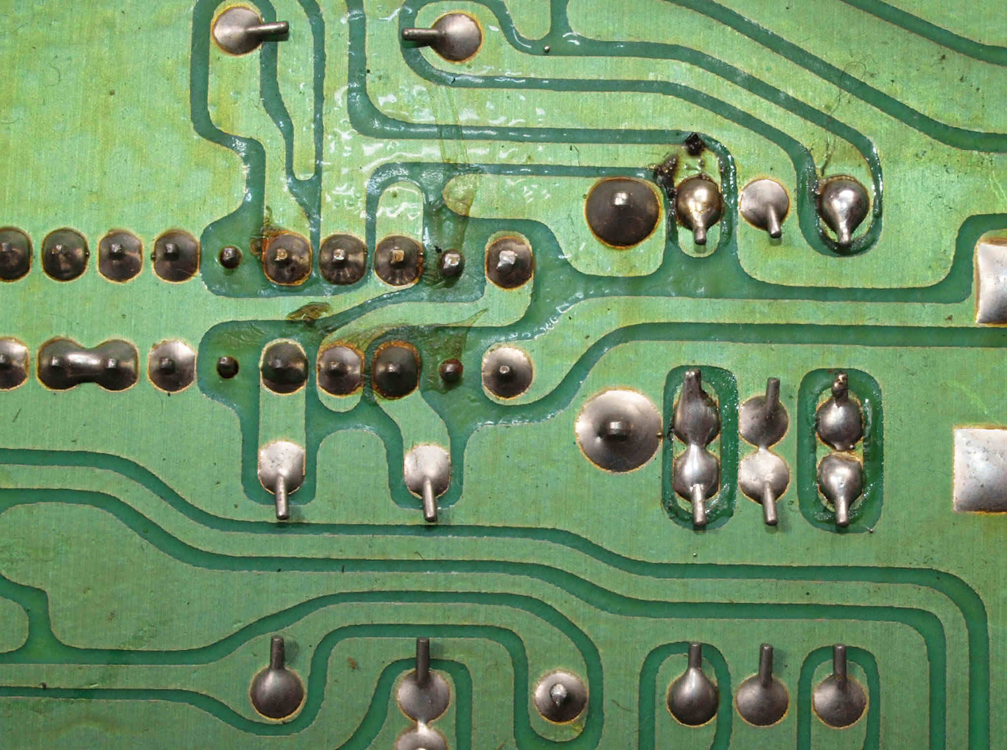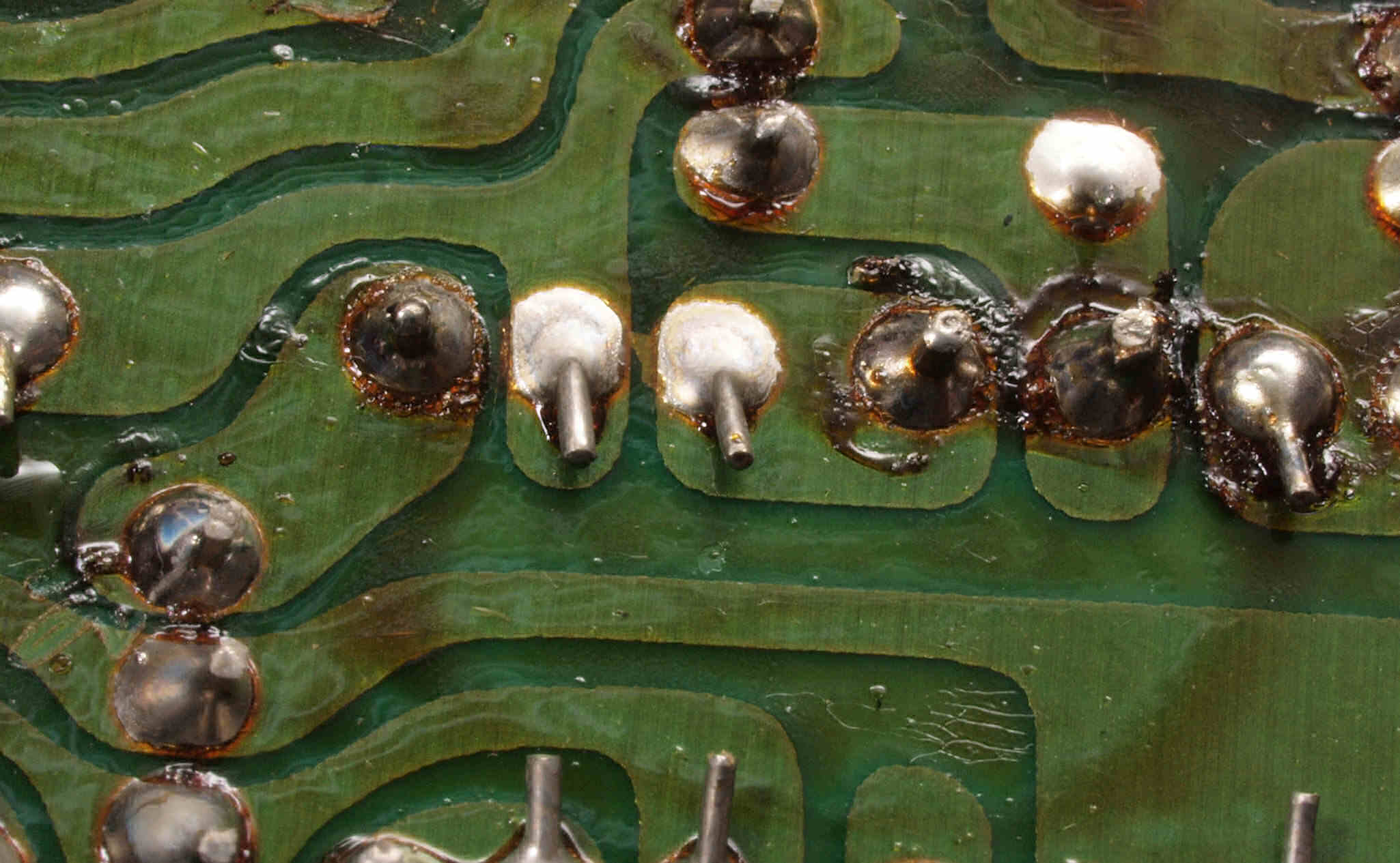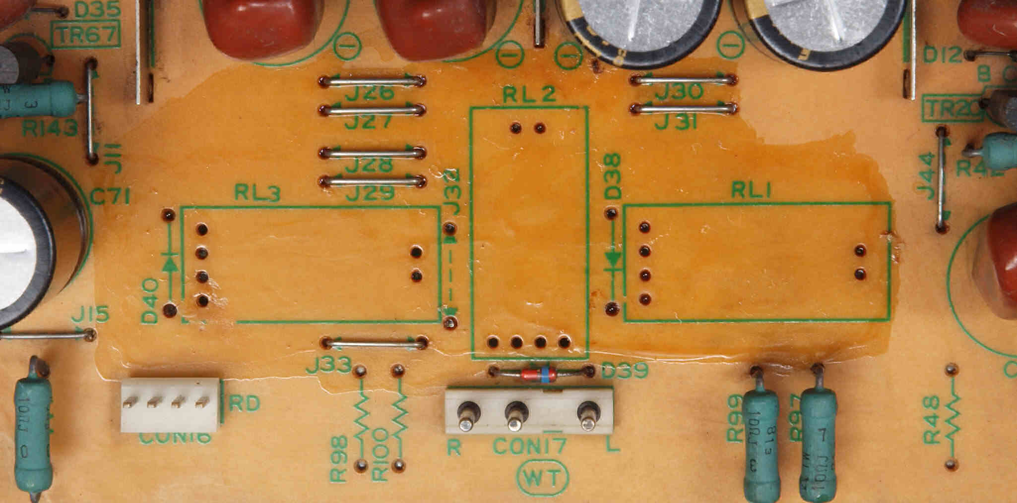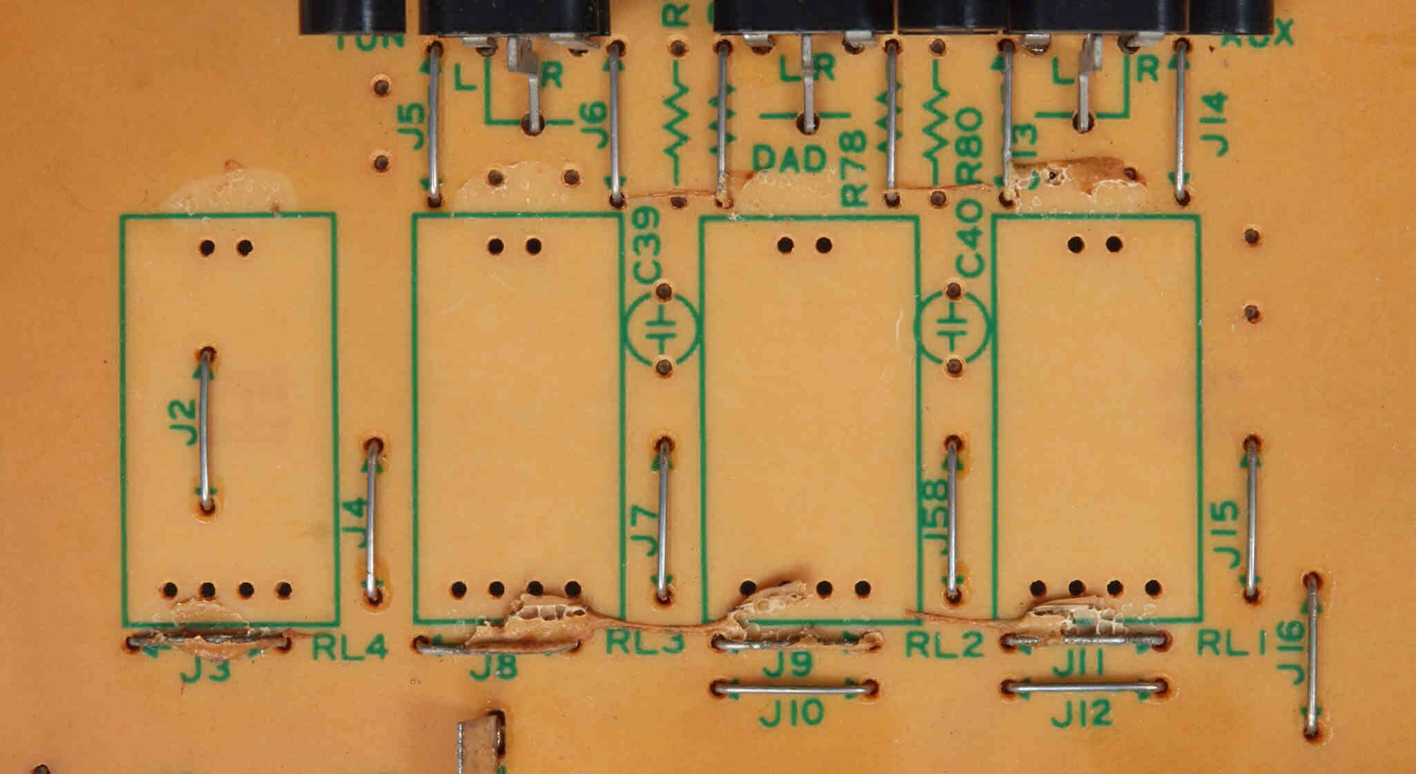 | C213. 修理中 EQ−AMP。 トルエン溶媒の接着剤。錫メッキジャンパー線が腐食している。 | ||||||||||||||||||||||||||||||||||||||||||||||||||||||||