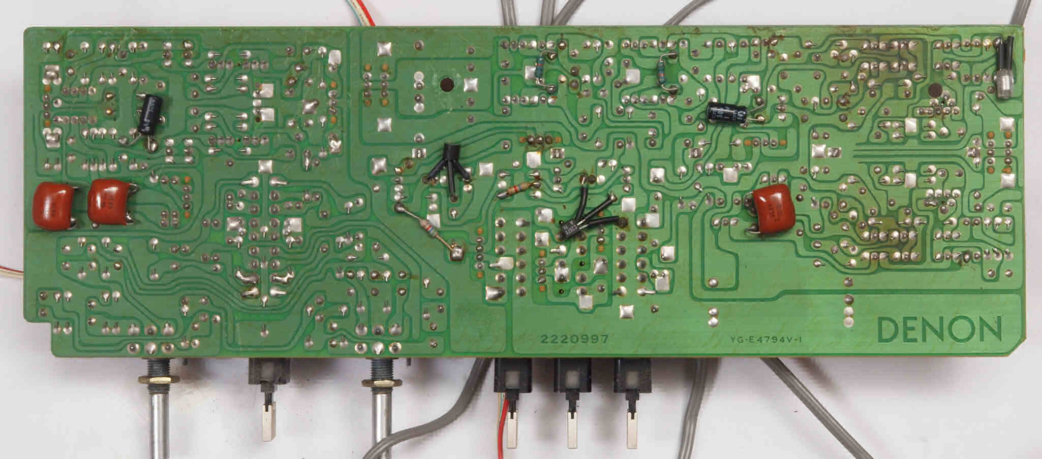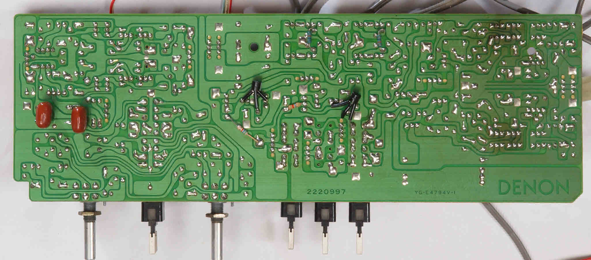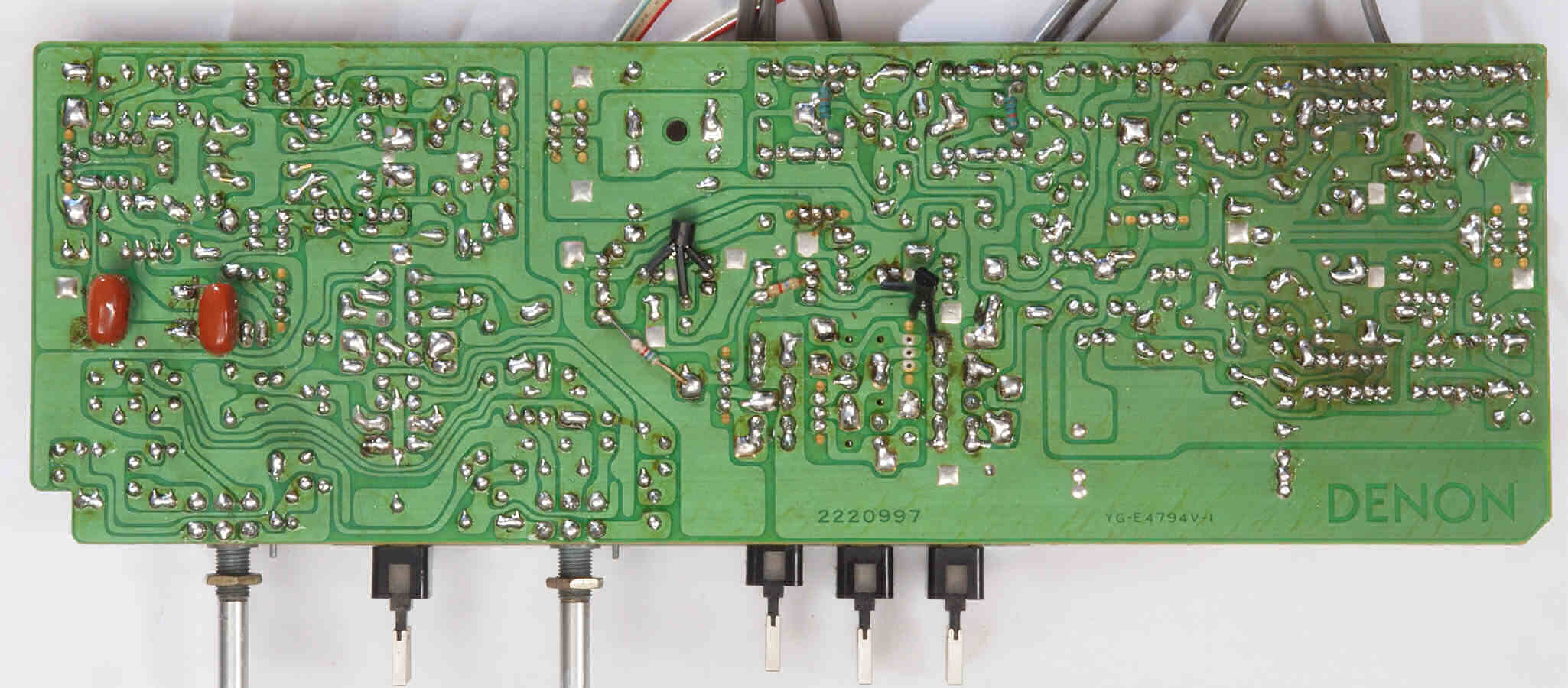 | C132. 修理中 EQ−HEAD-AMP基板裏。 曲げる方向が悪く隣の銅箔に? 他にも沢山あり。 | ||||||||||||||||||||||||||||||||||||||||||||||||||||||||